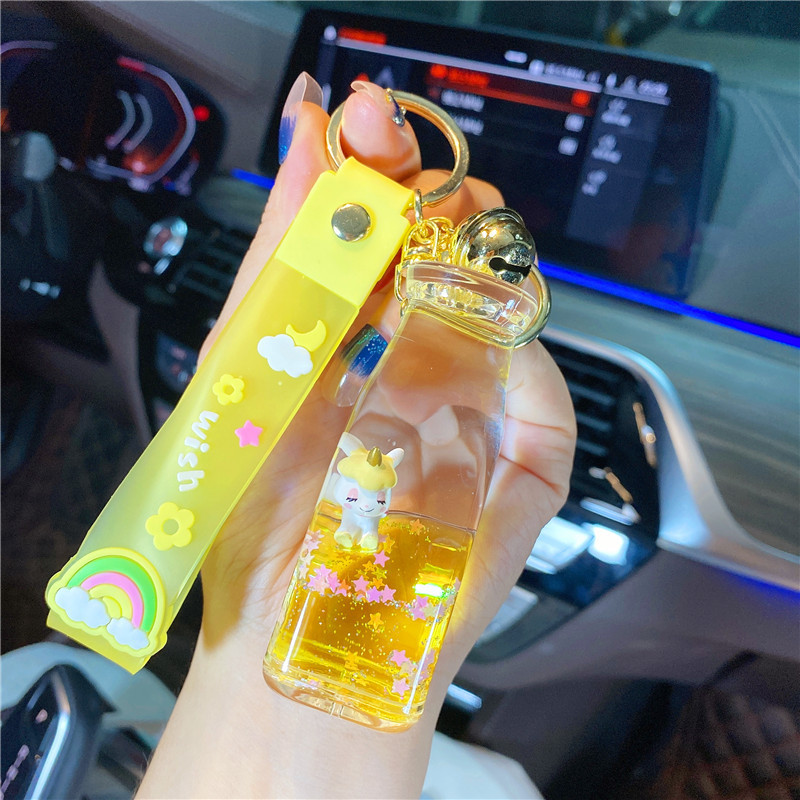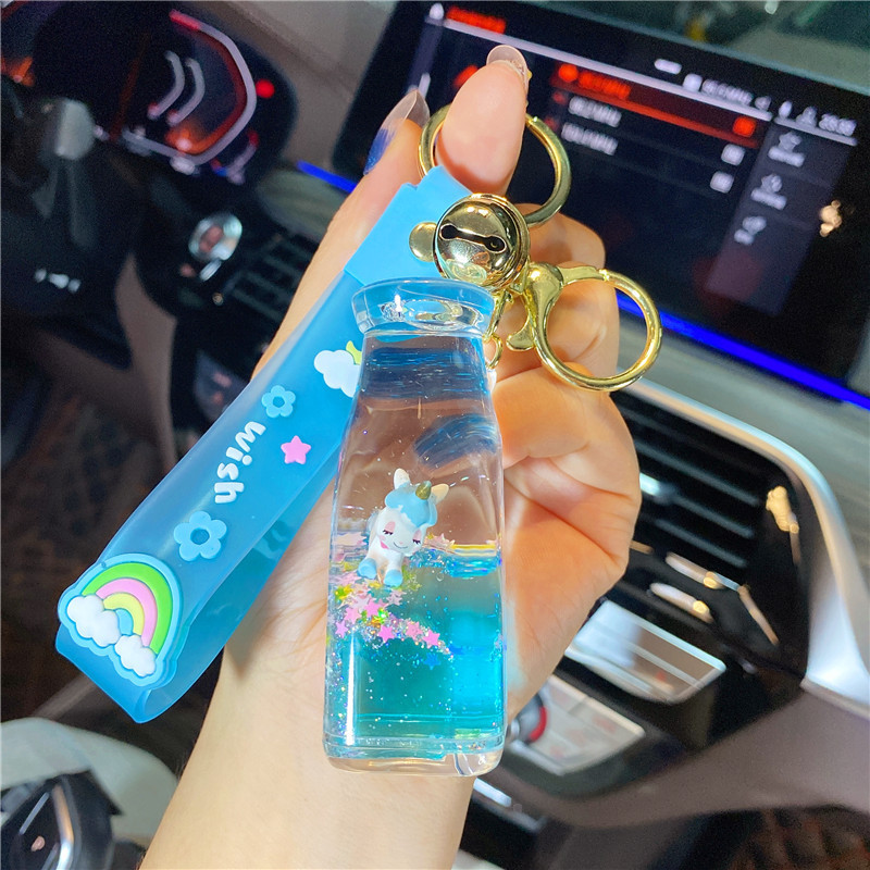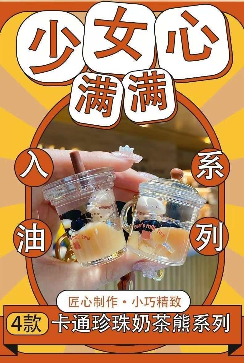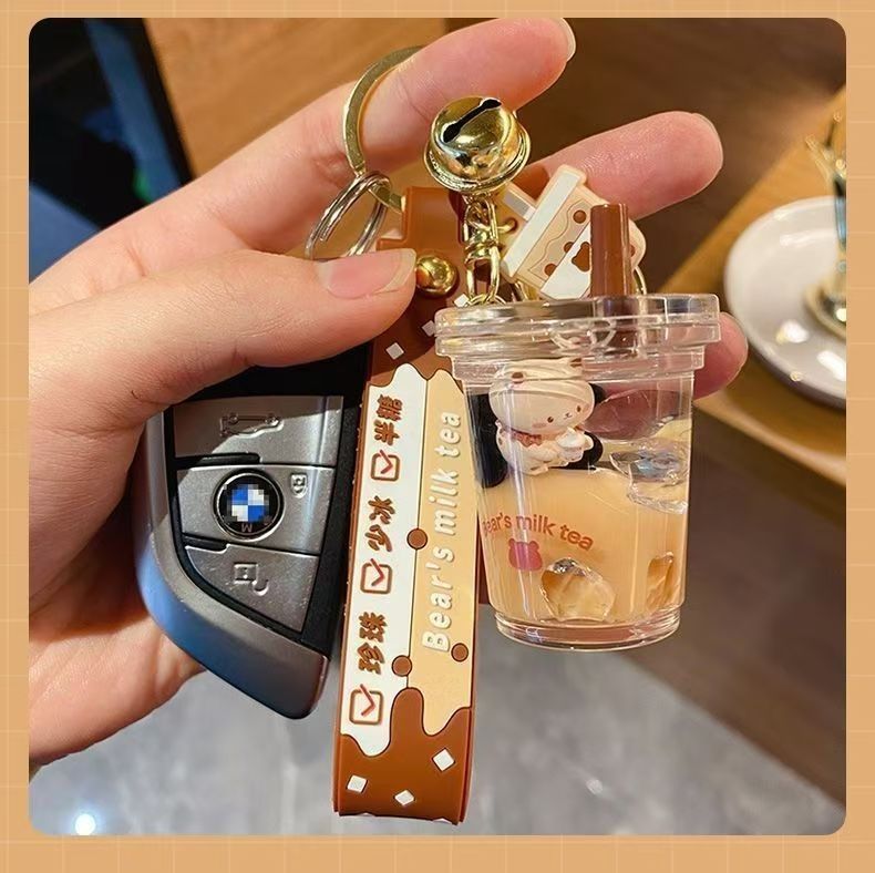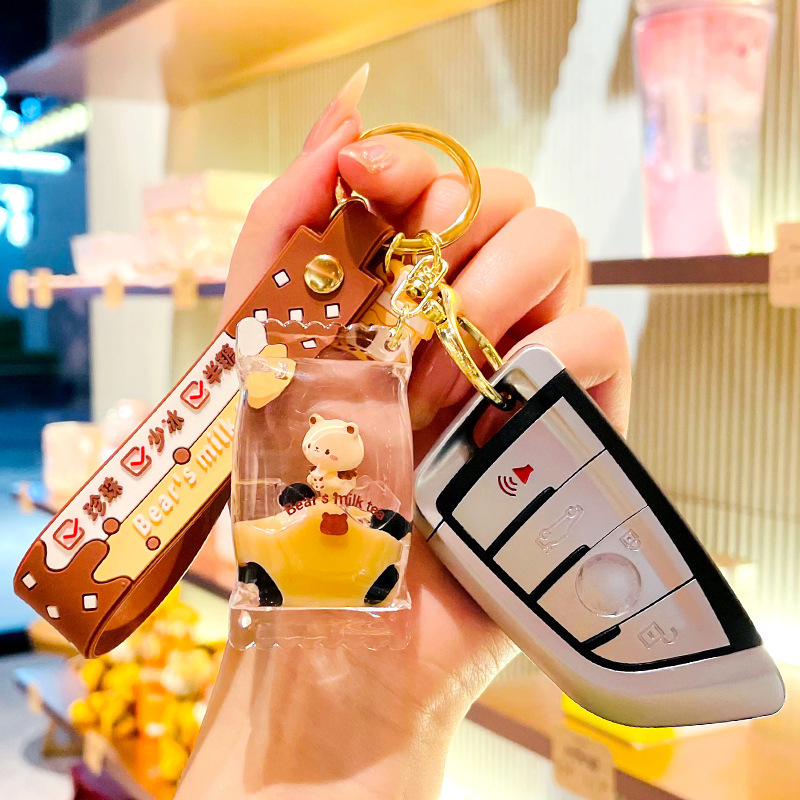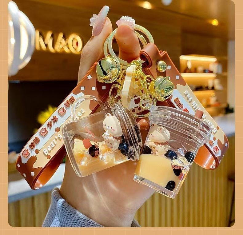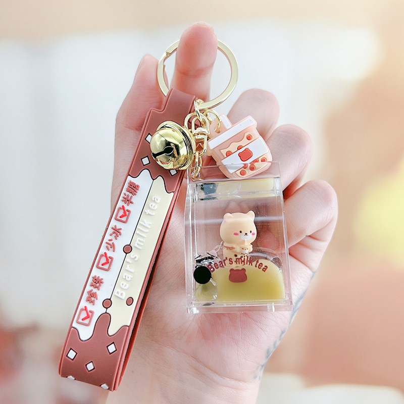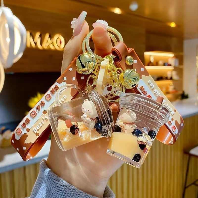 오일로 채워진 버블 티 키 체인 떠 다니는 작은 우유 곰 액체 퀵 샌드 병 펜던트 커플 선물 가방 여성용 장식품