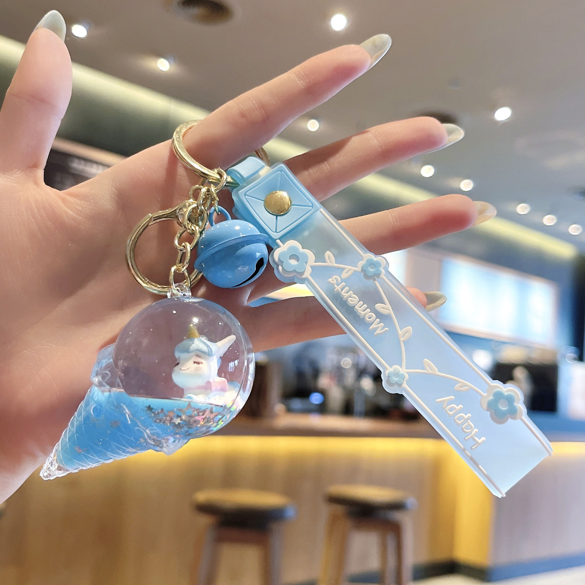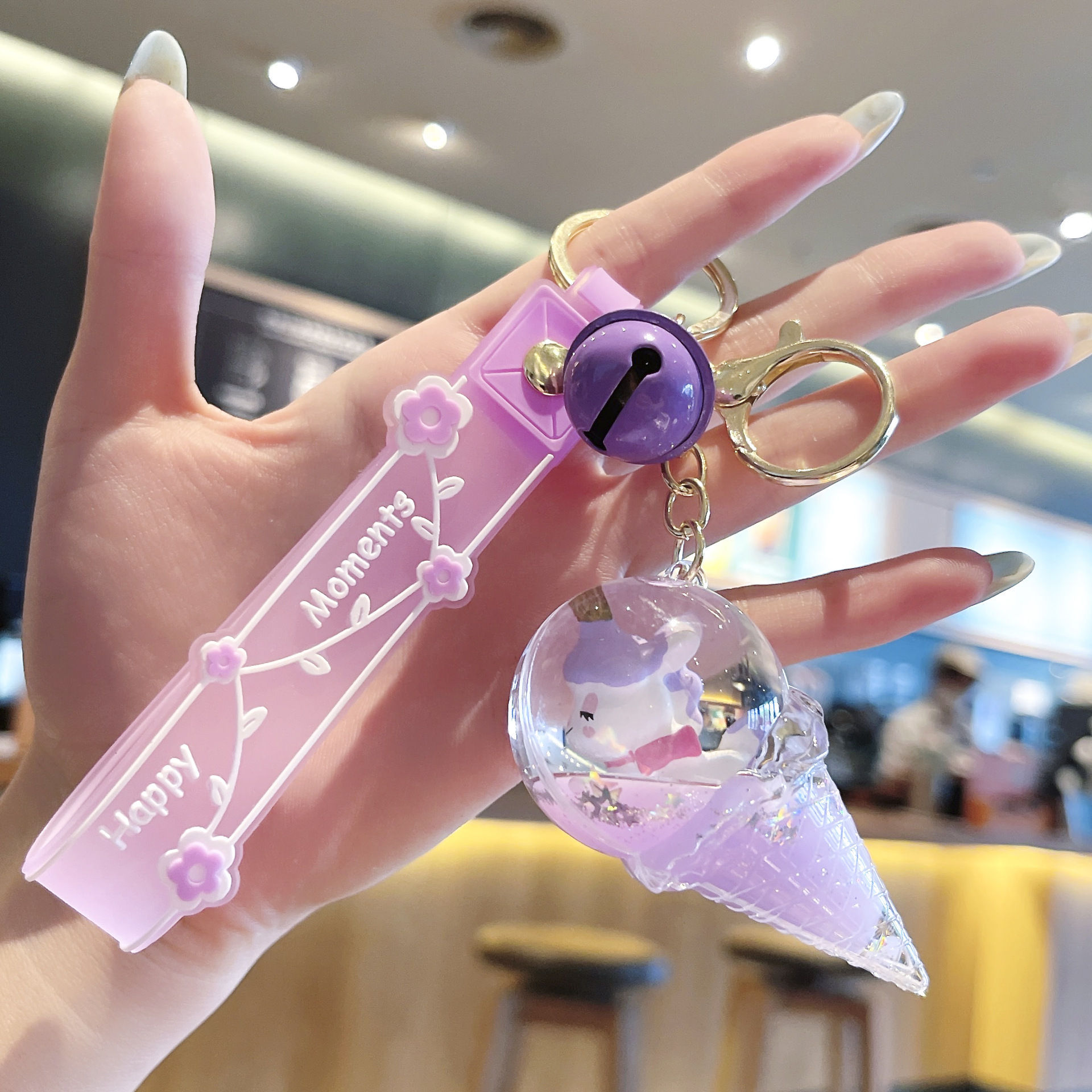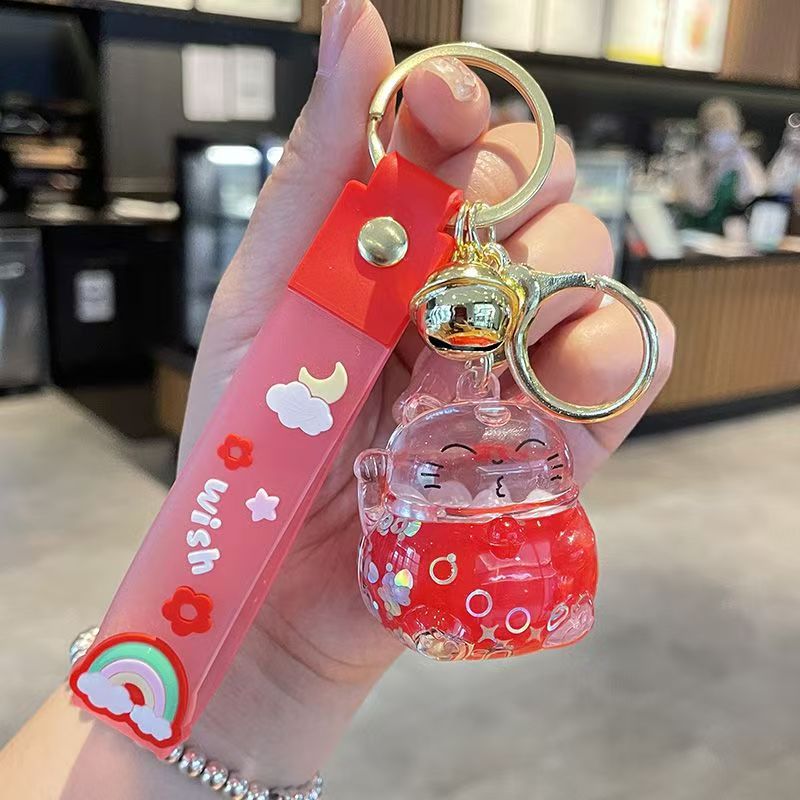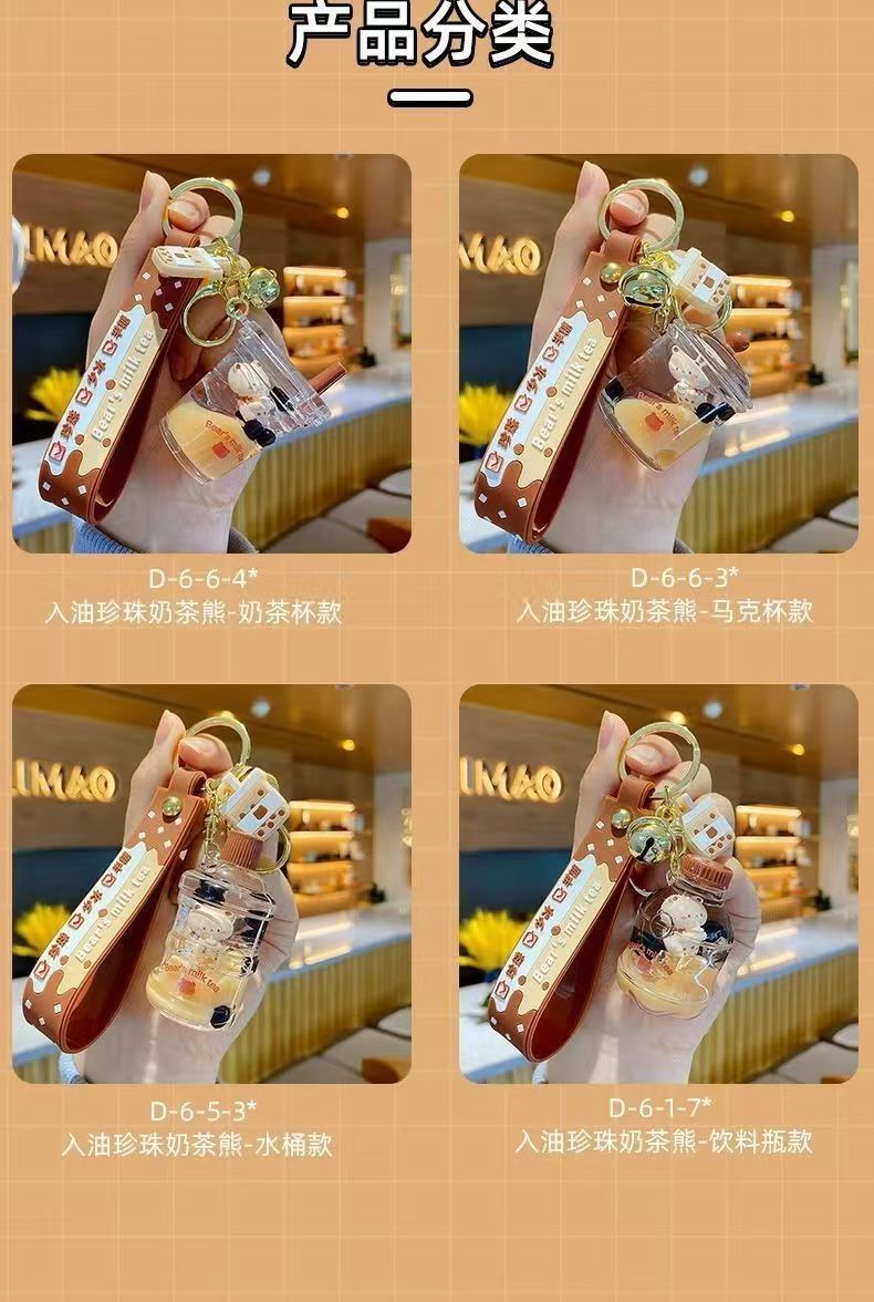 오일로 채워진 버블 티 키 체인 떠 다니는 작은 우유 곰 액체 퀵 샌드 병 펜던트 커플 선물 가방 여성용 장식품스토어 가기