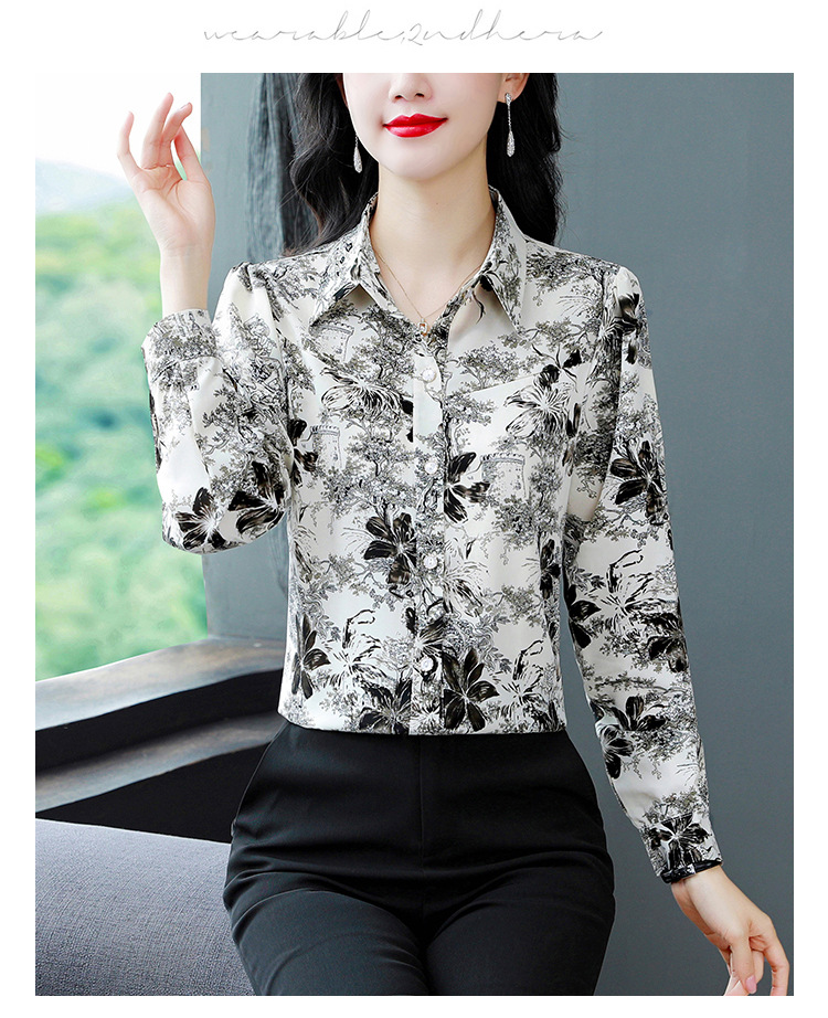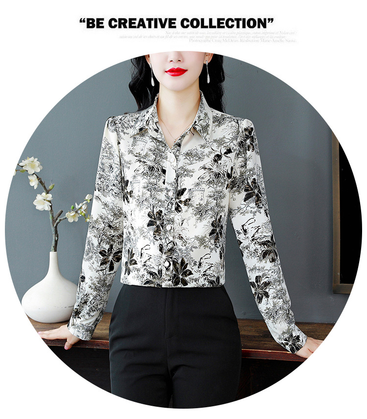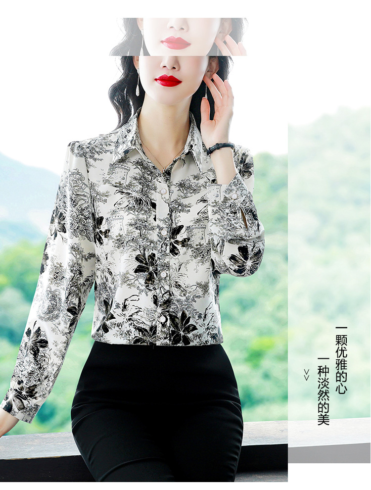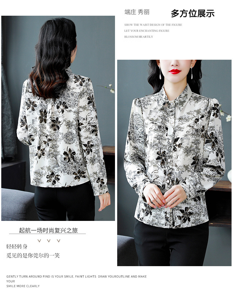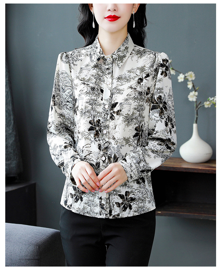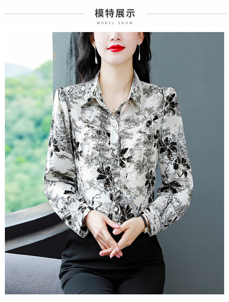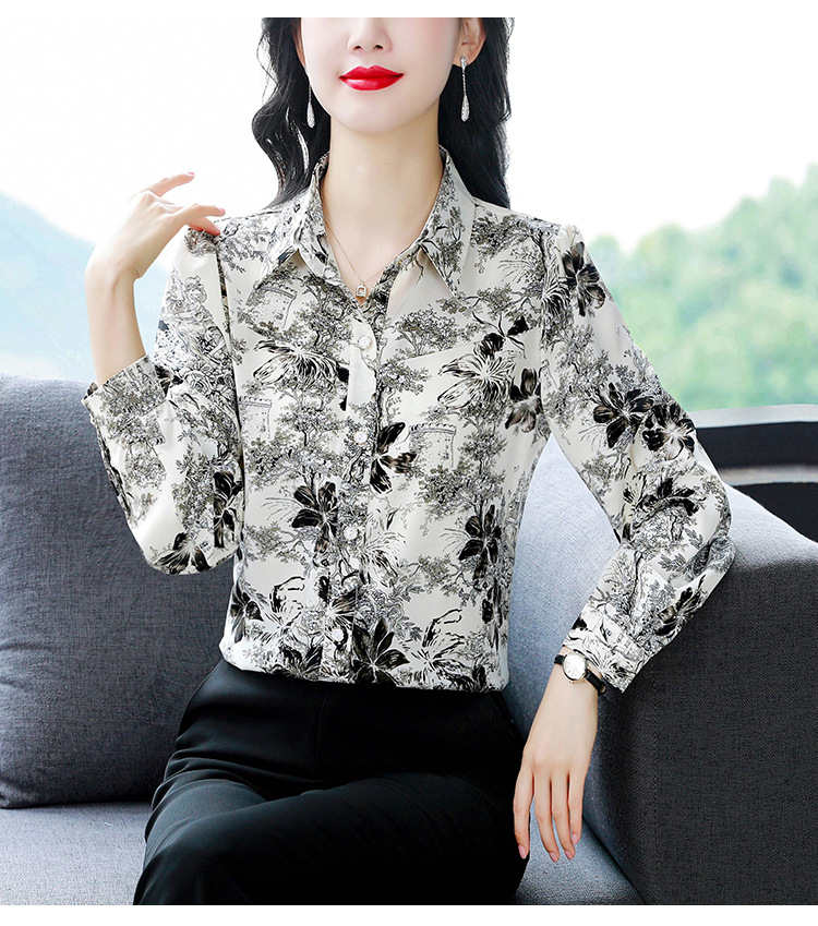 인쇄 된 누에 시폰 블라우스 여성의 톱 2024 여름 새로운 여성의 인쇄 된 우아한 슬리밍 셔츠 긴 소매 여성스토어 가기