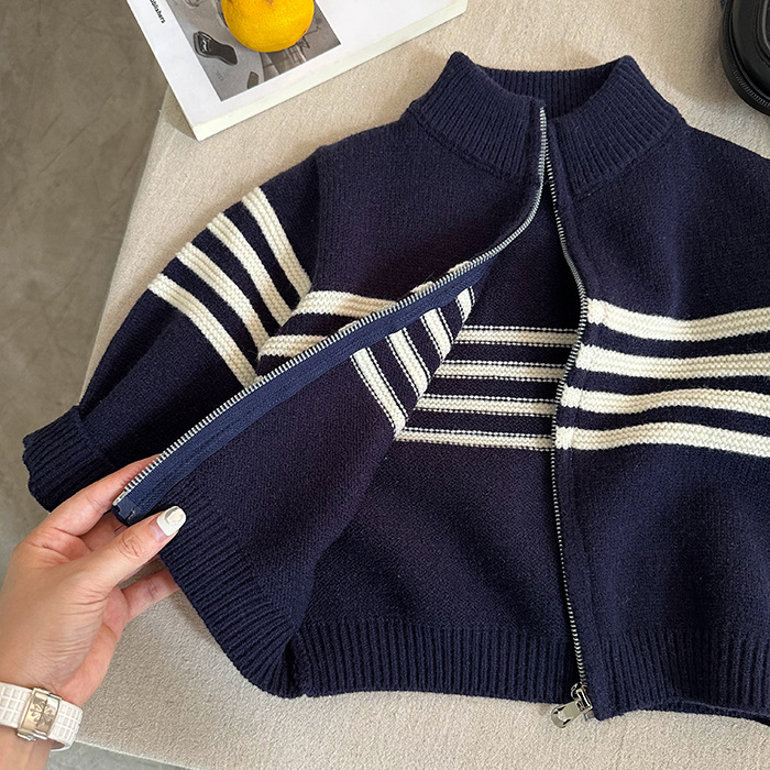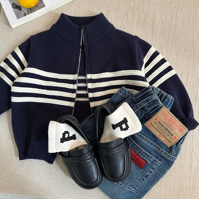 린 린 미라 어린이 스웨터 2024 가을 새 소년 줄무늬 니트 카디건 아기의 지퍼 울 재킷