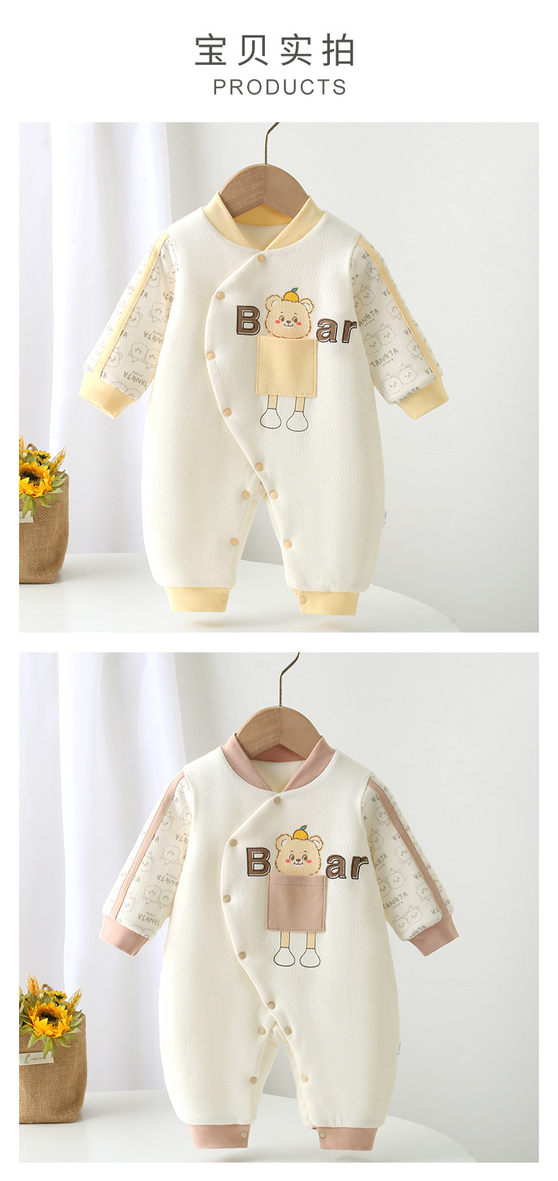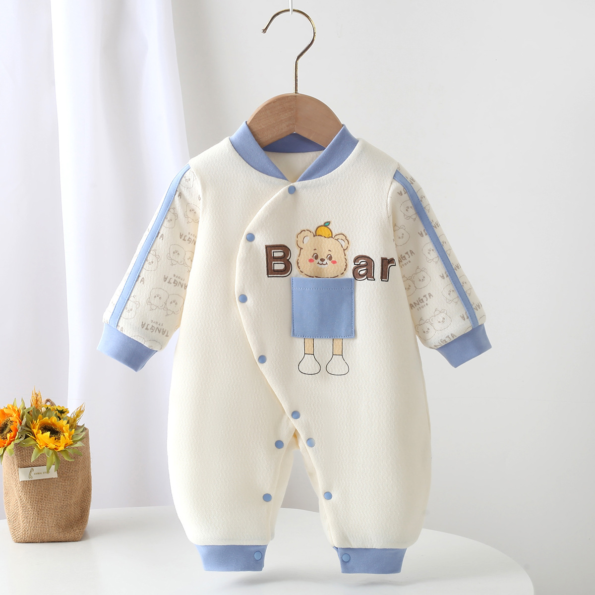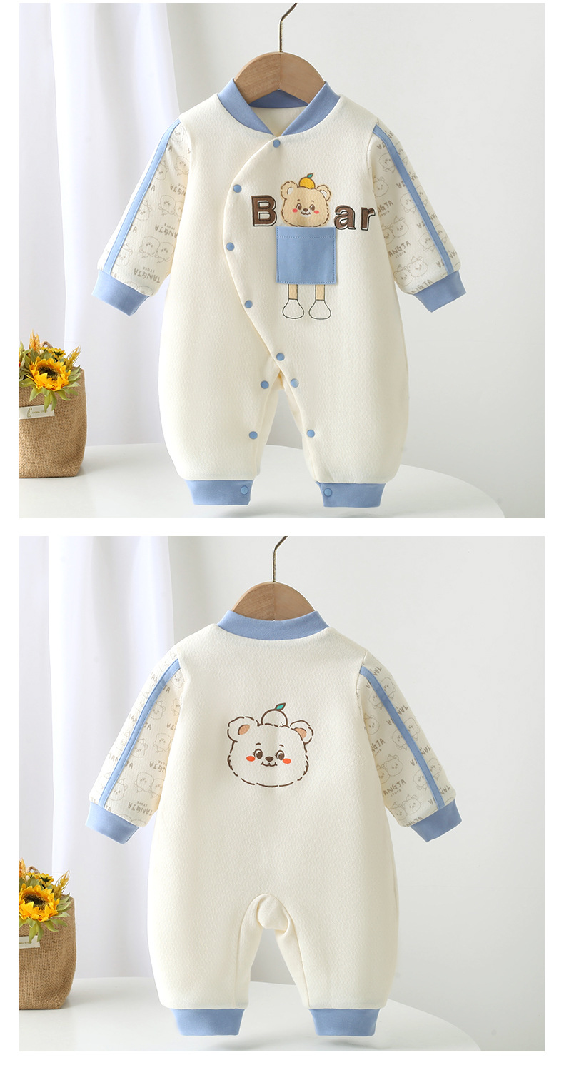 가을과 겨울 새로운 120g 면화 패딩 신생아 편심 은폐 버클 점프 수트 아기가 점프 수트를 나눕니다.