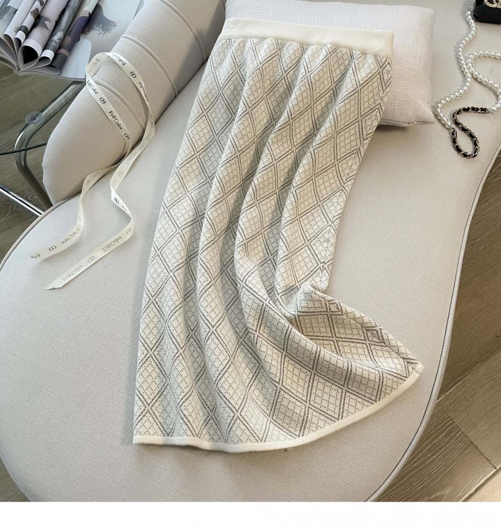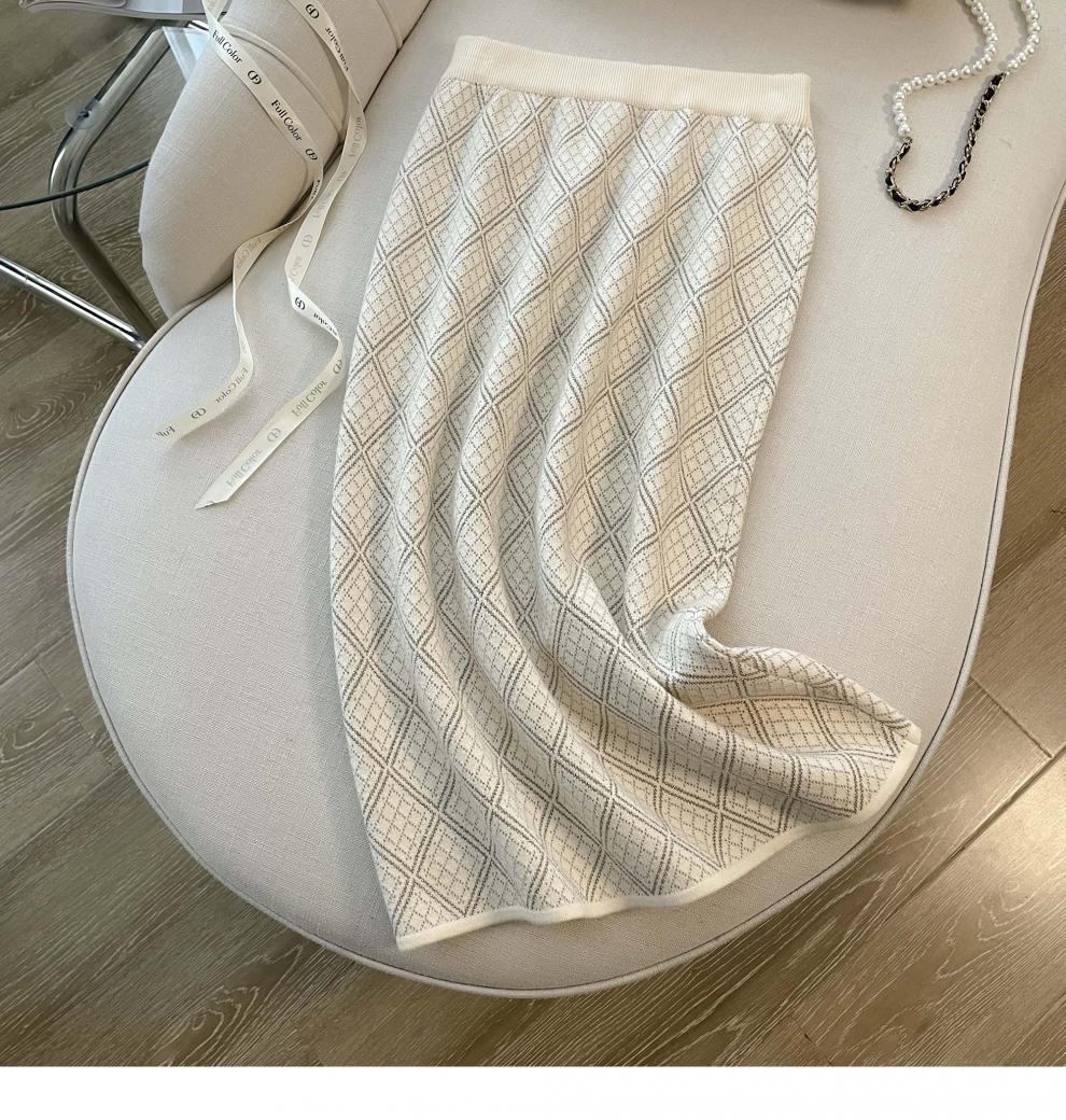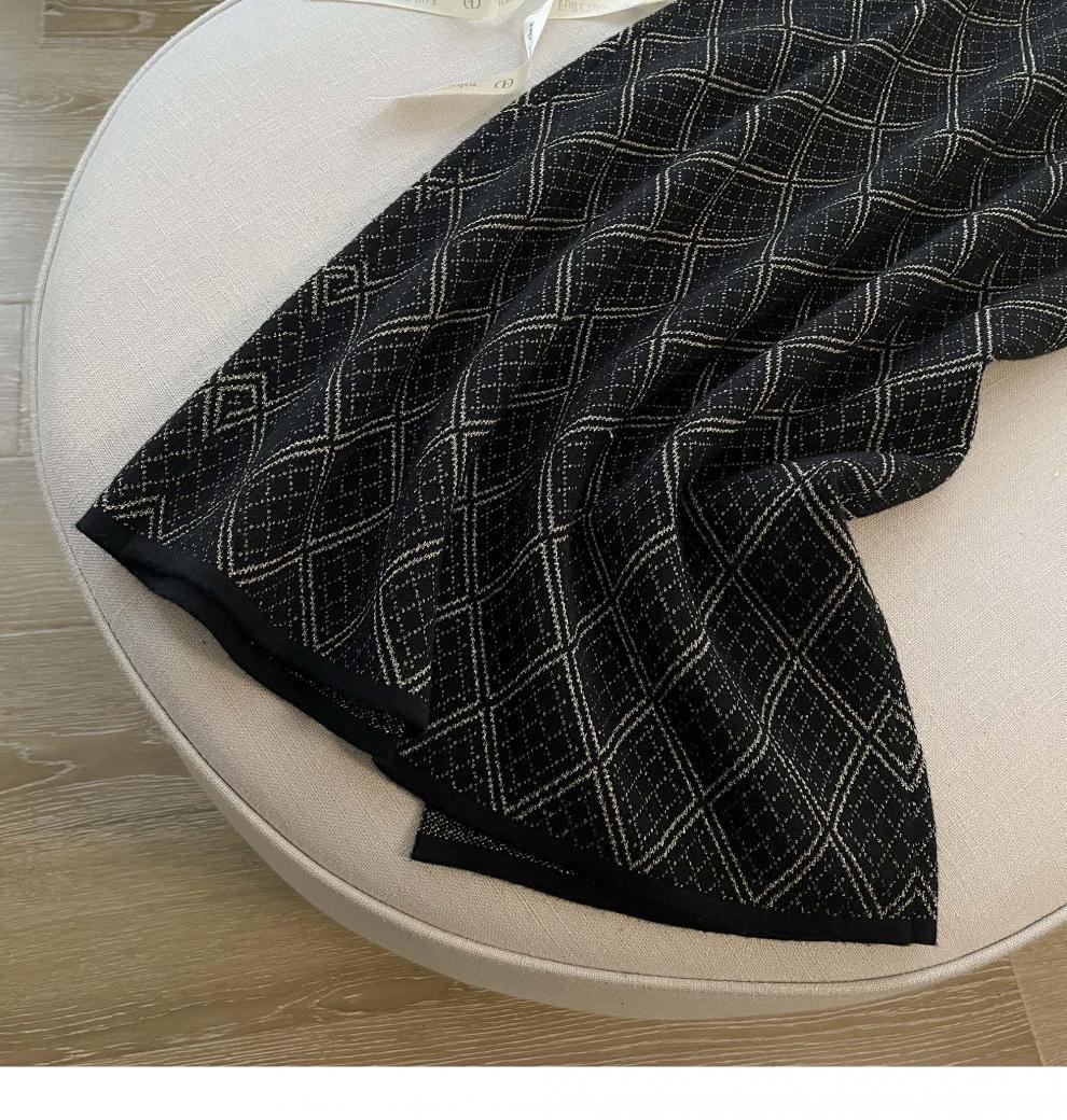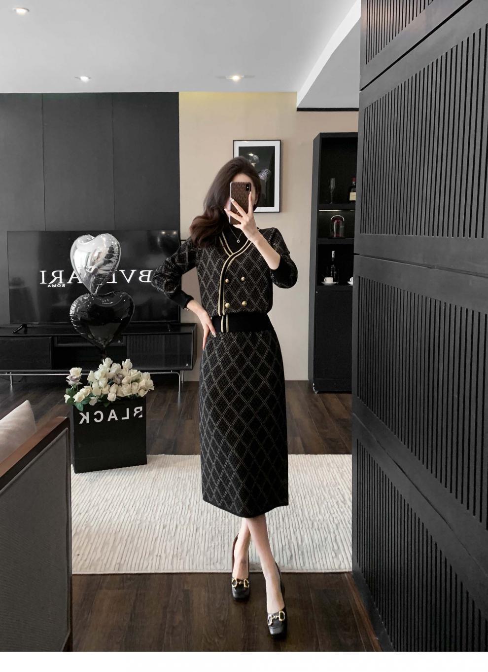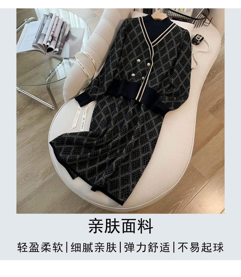 7525 프렌치 스타일 라이트 럭셔리 하이 엔드 센스 골드 실크 자카드 니트 원피스 여성용 가을 및 겨울 다이아몬드 플레이드 니트 스웨터 스커트