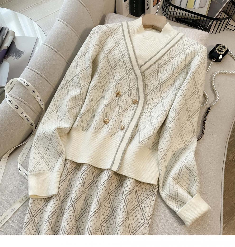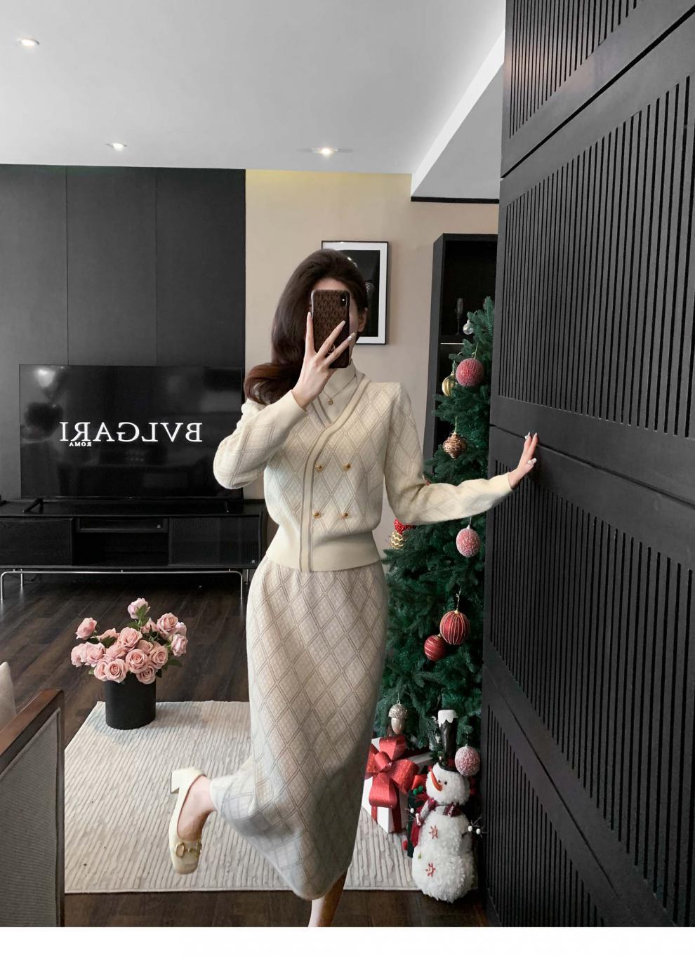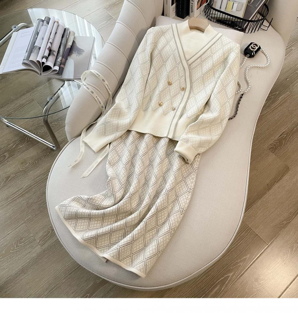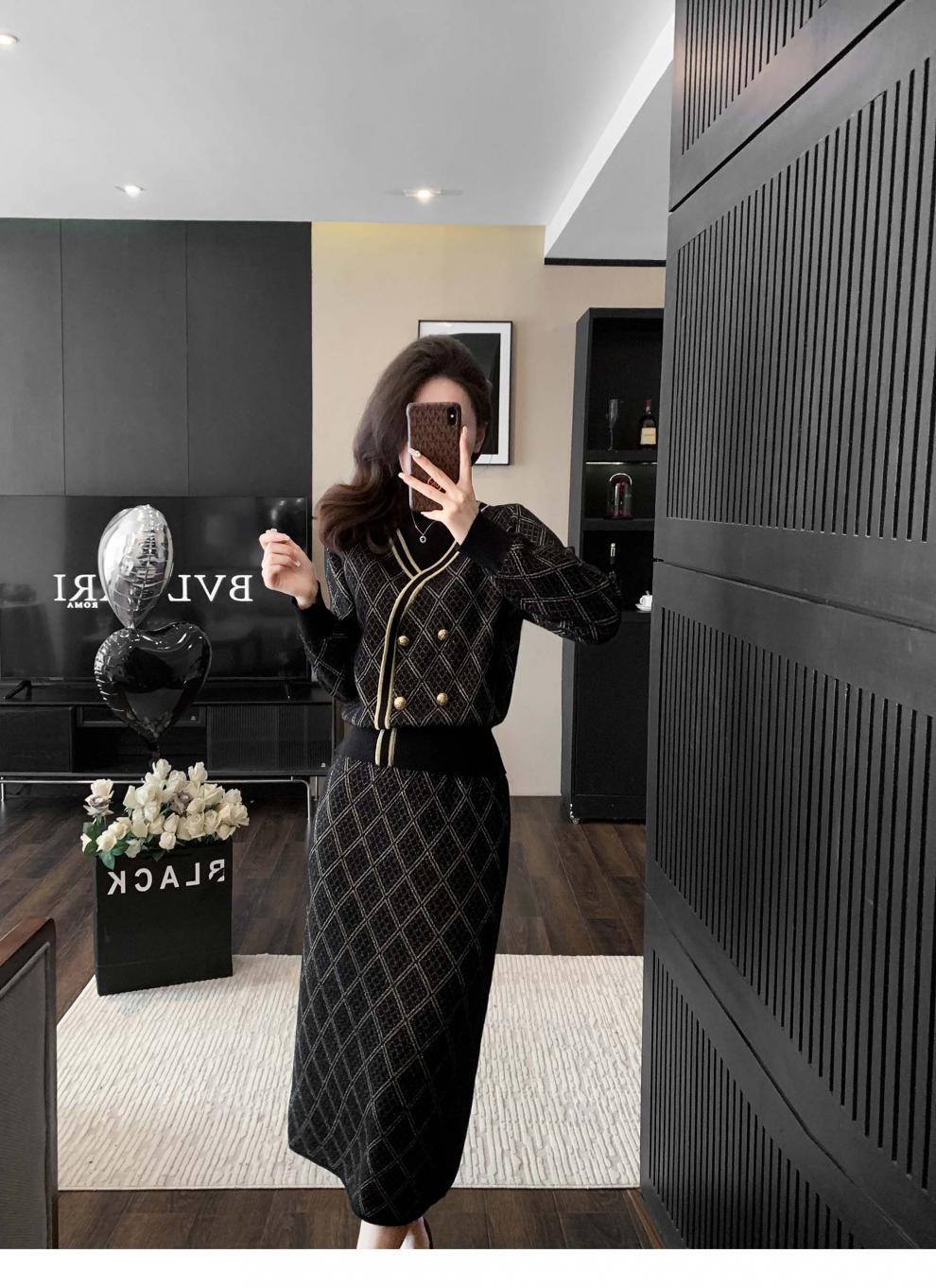 7525 프렌치 스타일 라이트 럭셔리 하이 엔드 센스 골드 실크 자카드 니트 원피스 여성용 가을 및 겨울 다이아몬드 플레이드 니트 스웨터 스커트