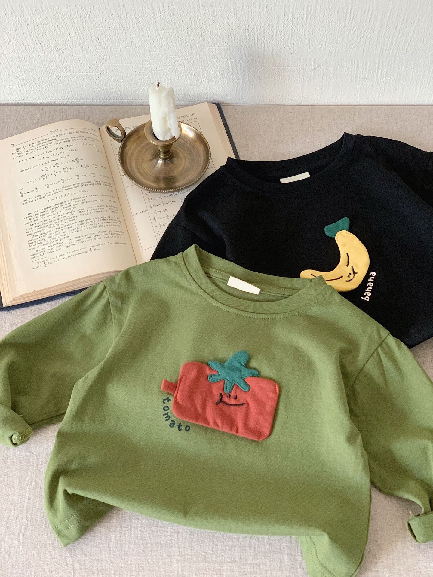 부가탕 2025 가을 아동복 일본 스타일 티셔츠 유아용 긴팔 남녀공용 입체 패치 과일 디자인 이너웨어