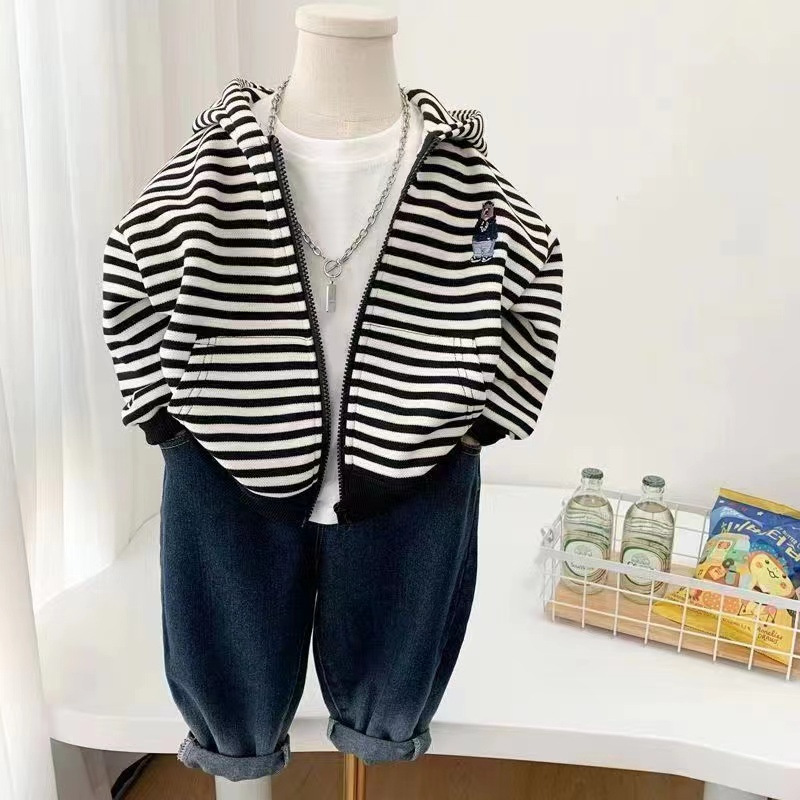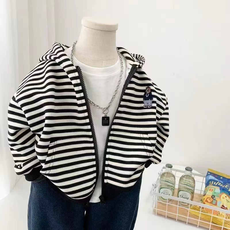가을 2024 남학생과 여학생을위한 새로운 한국 스타일 줄무늬 재킷 어린이 캐주얼 스웨트 후드 트렌디 올 매치 카디건스토어 가기