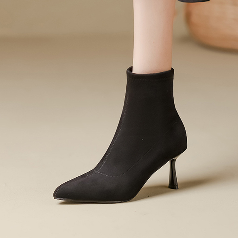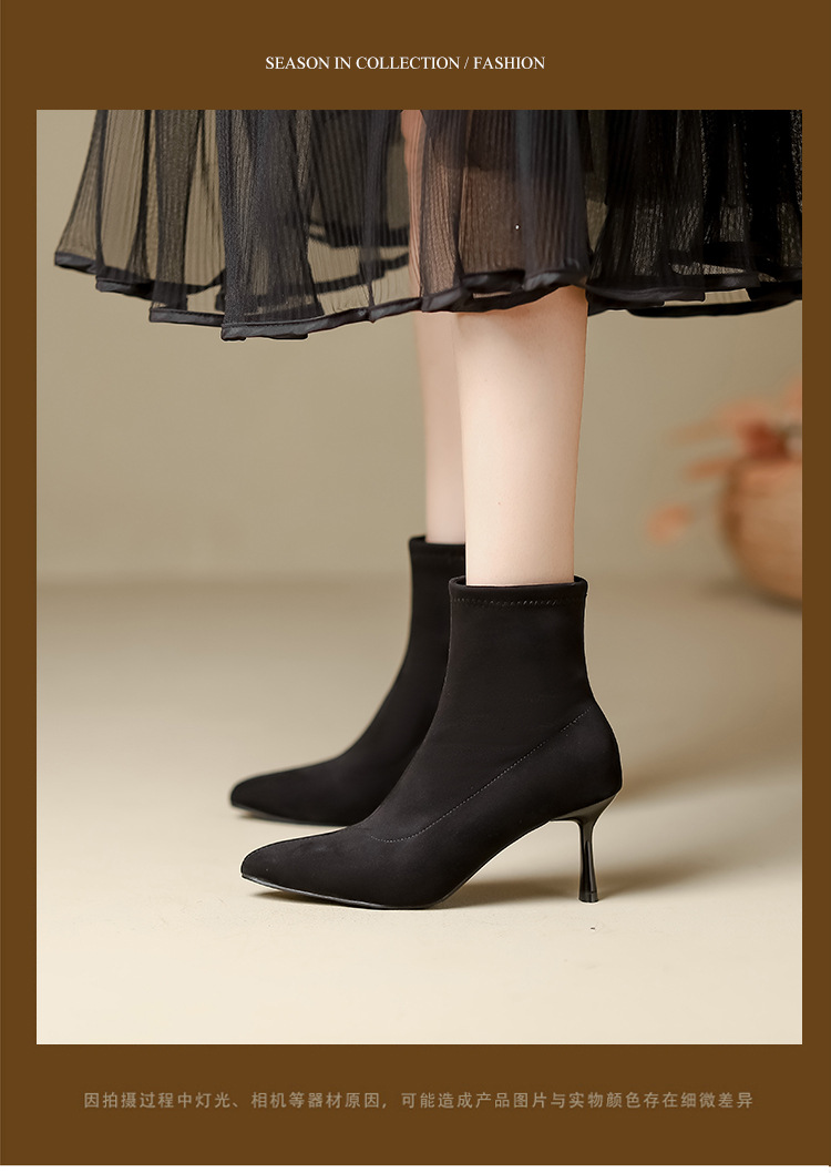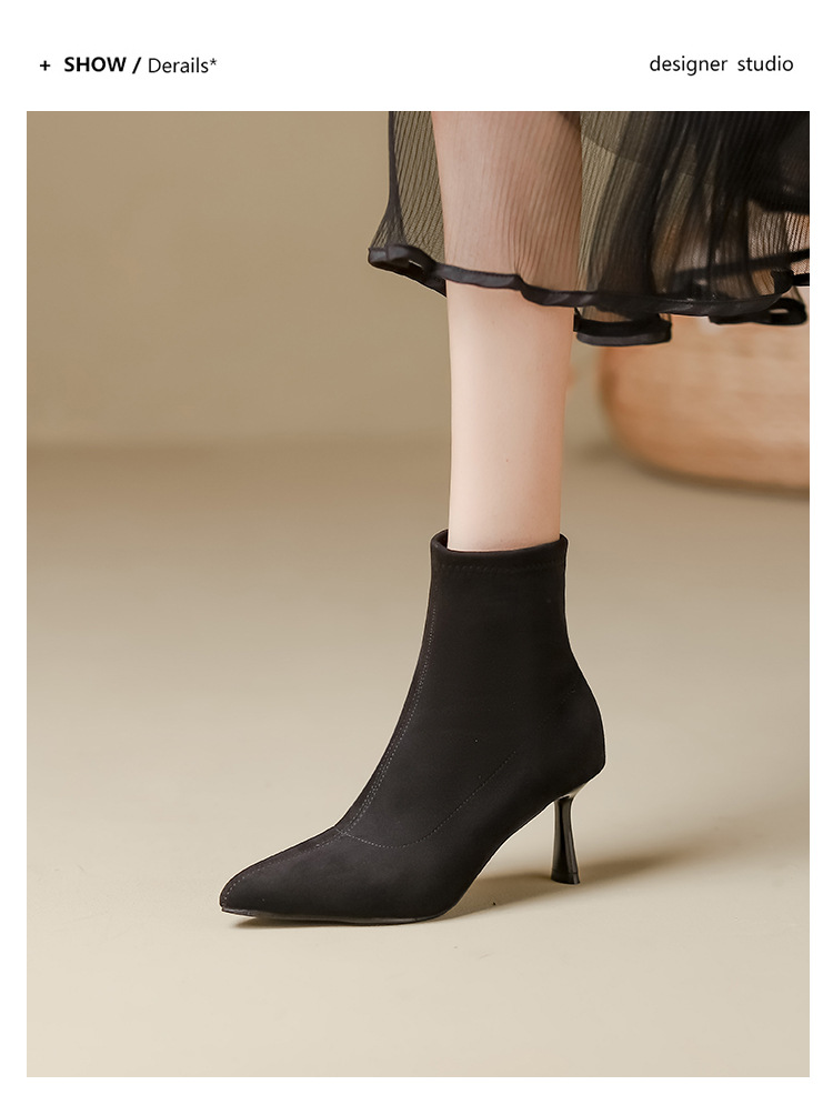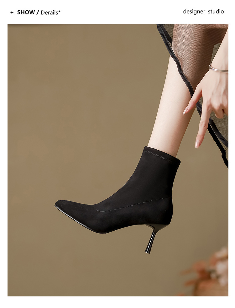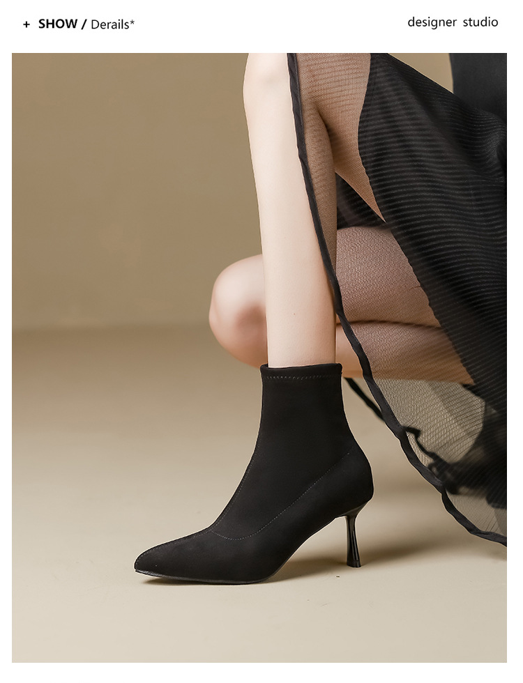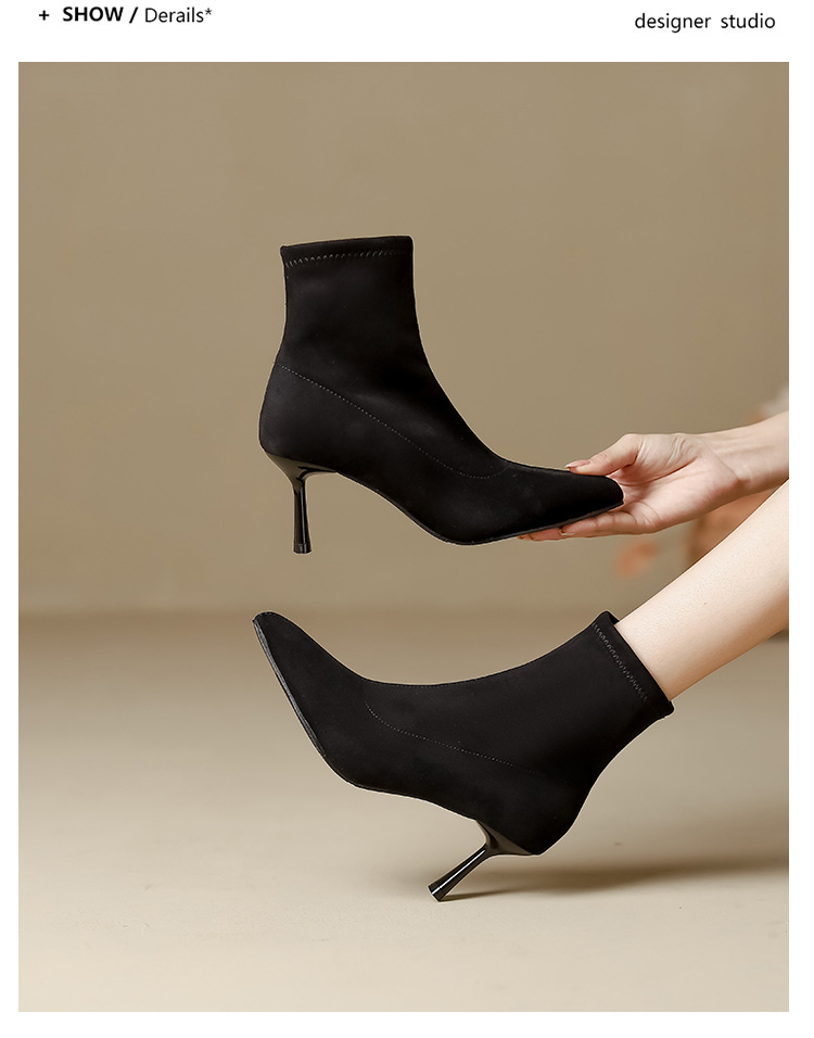 2024 가을과 겨울 새로운 얇은 힐 블랙 스웨이드 스트레치 얇은 부츠 양말 부츠 뾰족한 하이힐 짧은 부츠 여성