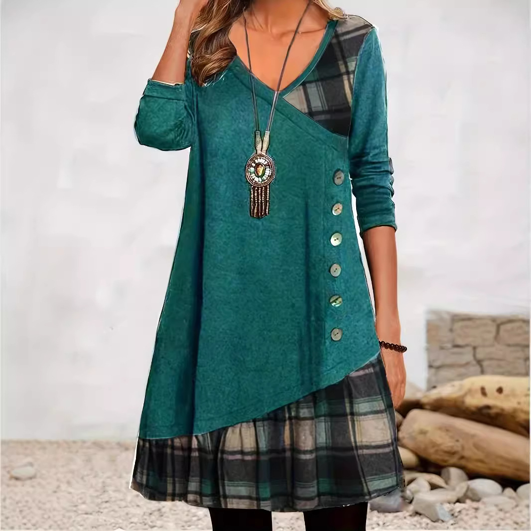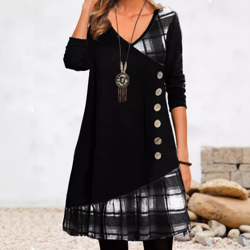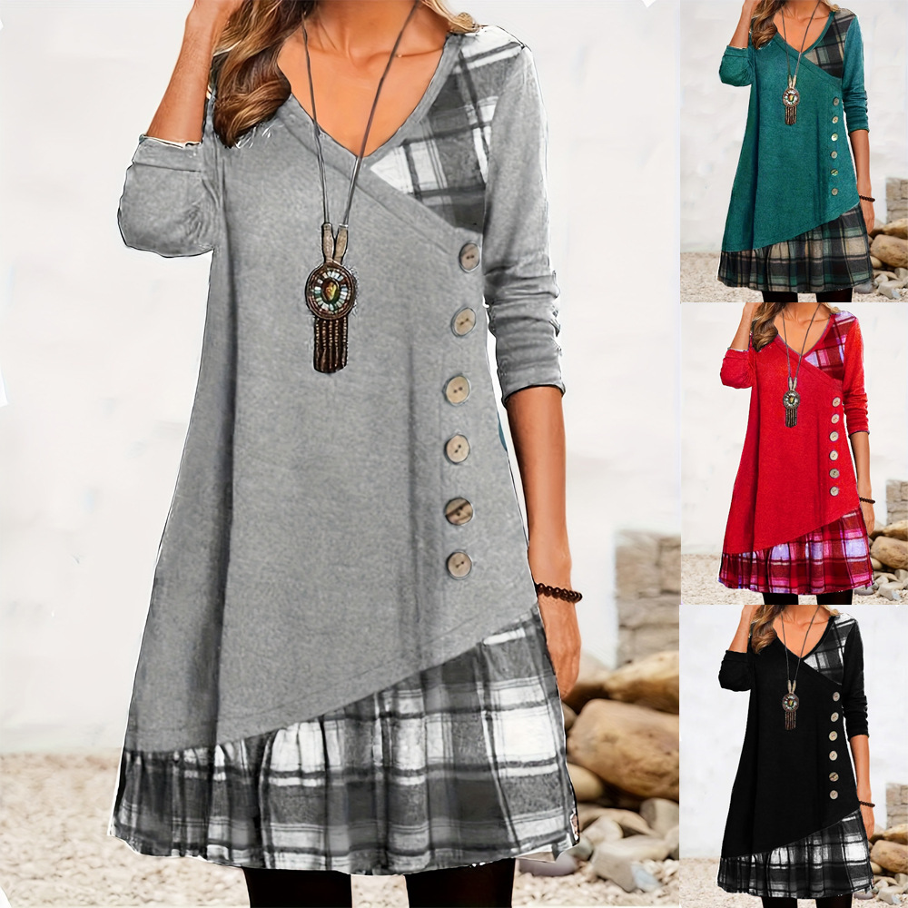 2025 가을 겨울 신상 유럽 및 미국 스타일 해외 직구 아마존 독립 사이트 체크무늬 배색 긴팔 원피스스토어 가기