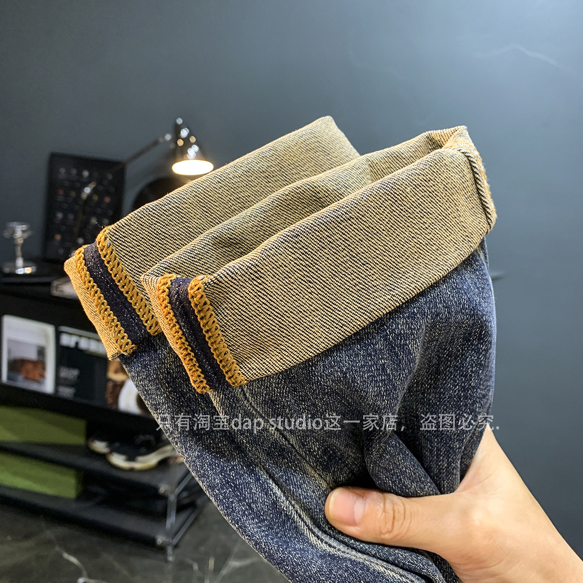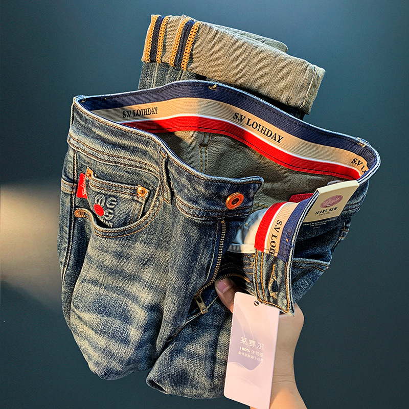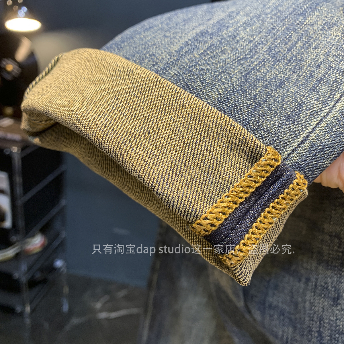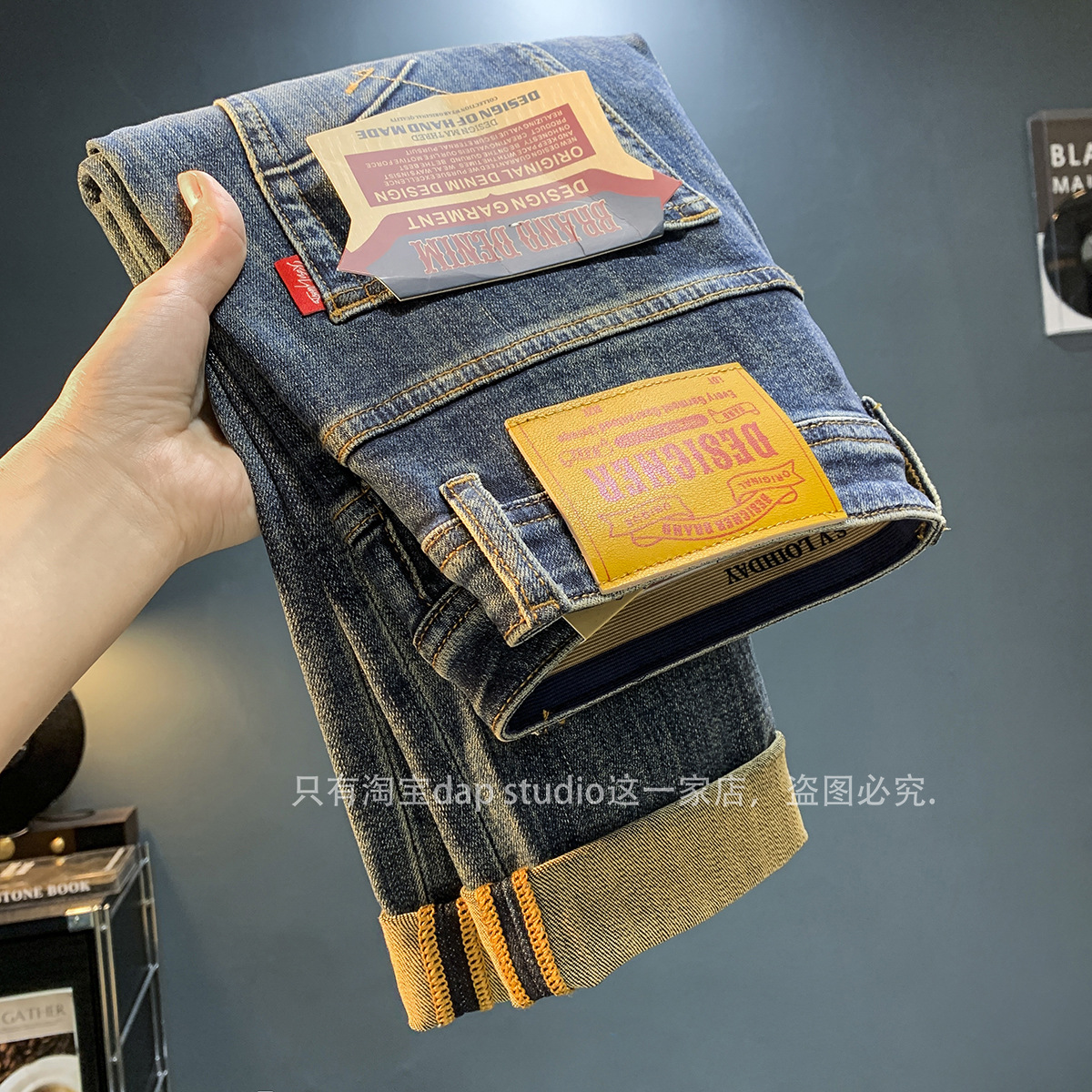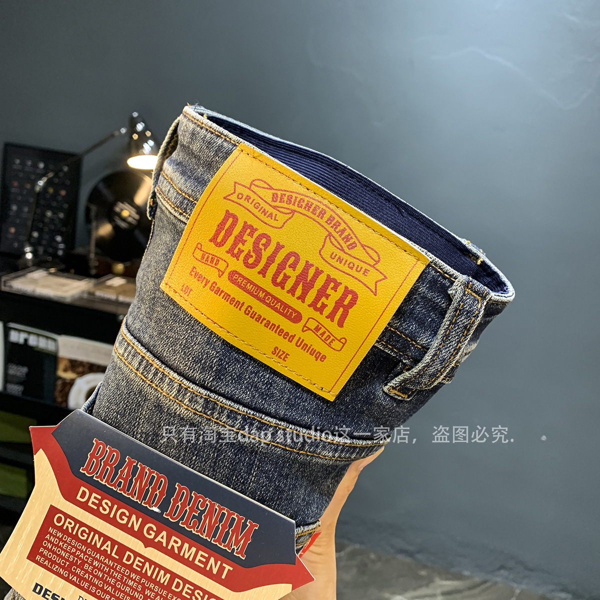 하이 엔드 청바지 남성용 가을 골동품 느낌 조난 작은 스트레이트 레그 캐주얼 바지 디자인 느낌 트렌디 한 프린트 슬림 핏 바지스토어 가기