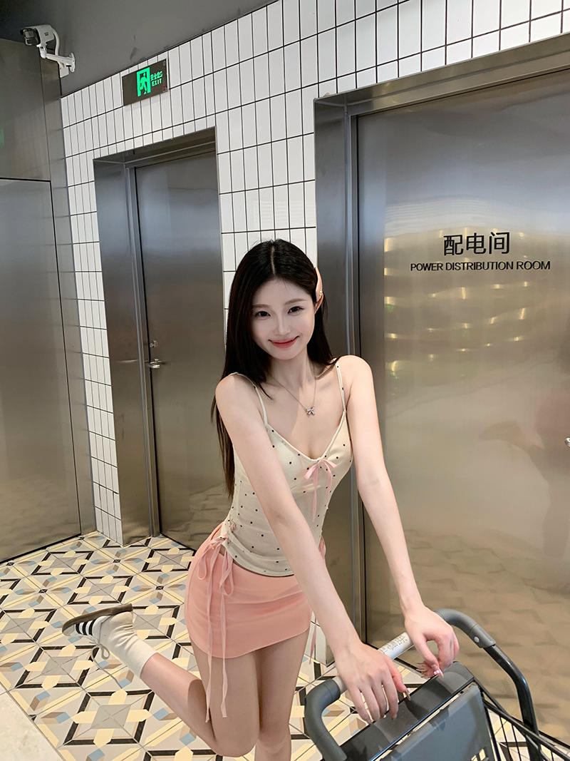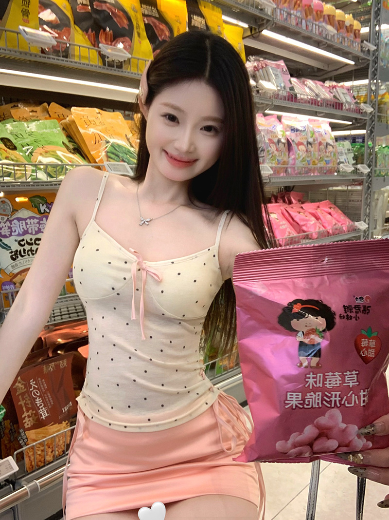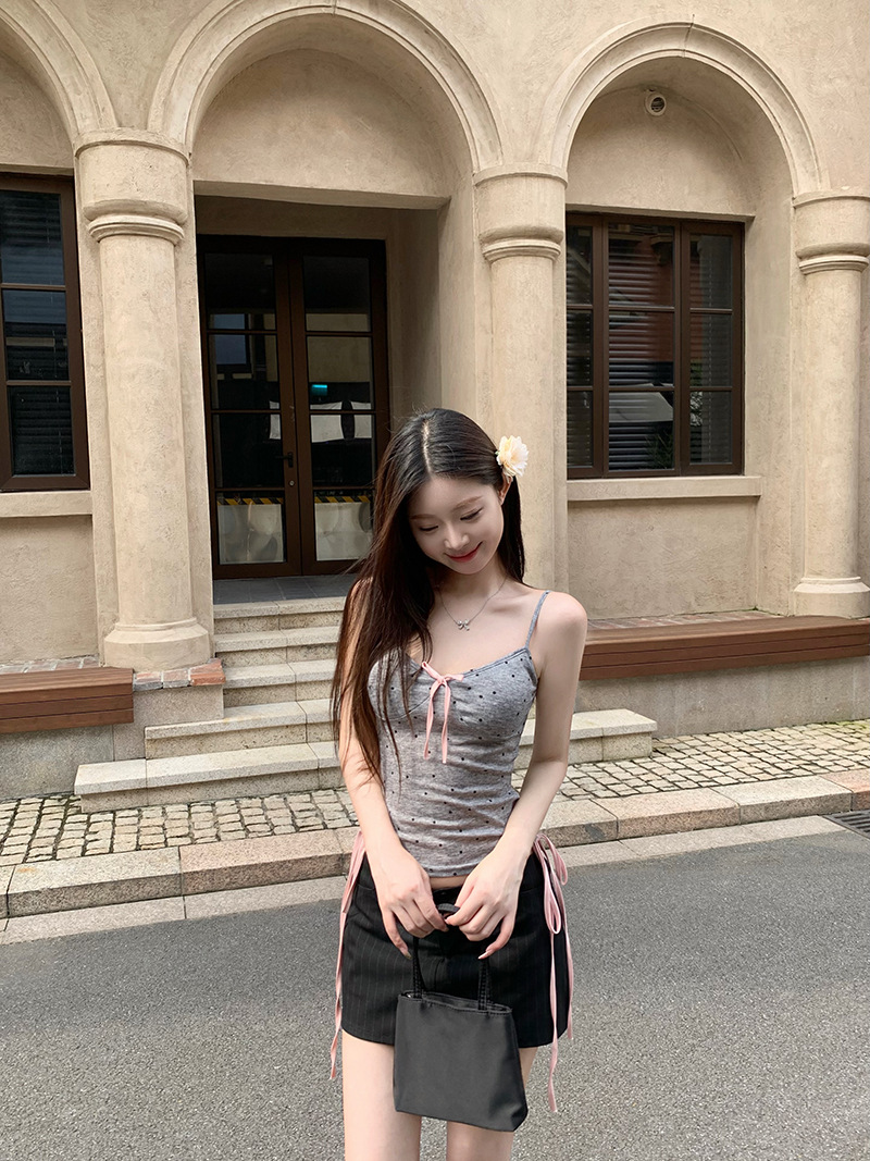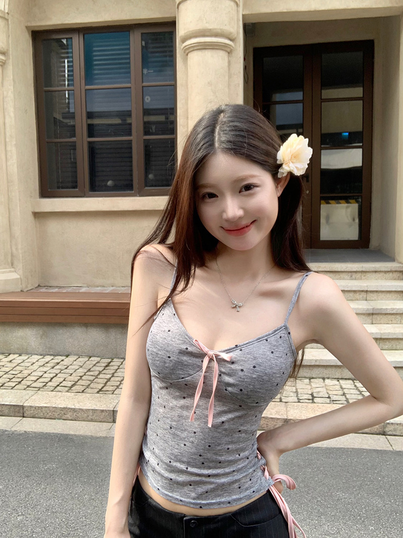 달콤하고 매운 스타일 보우 폴도트 디자인 카미솔 여성 여름 한국 스타일 짧은 슬림 핏 슬리밍 아우터웨어 탑
