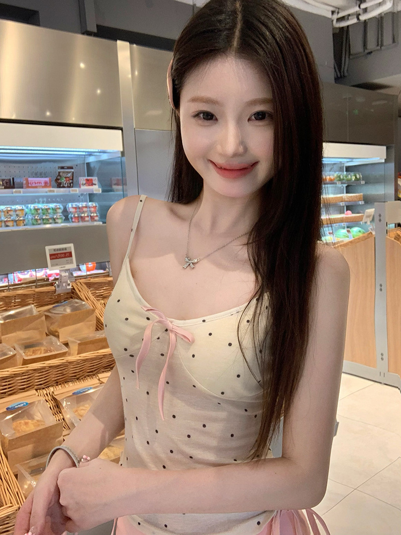 달콤하고 매운 스타일 보우 폴도트 디자인 카미솔 여성 여름 한국 스타일 짧은 슬림 핏 슬리밍 아우터웨어 탑스토어 가기