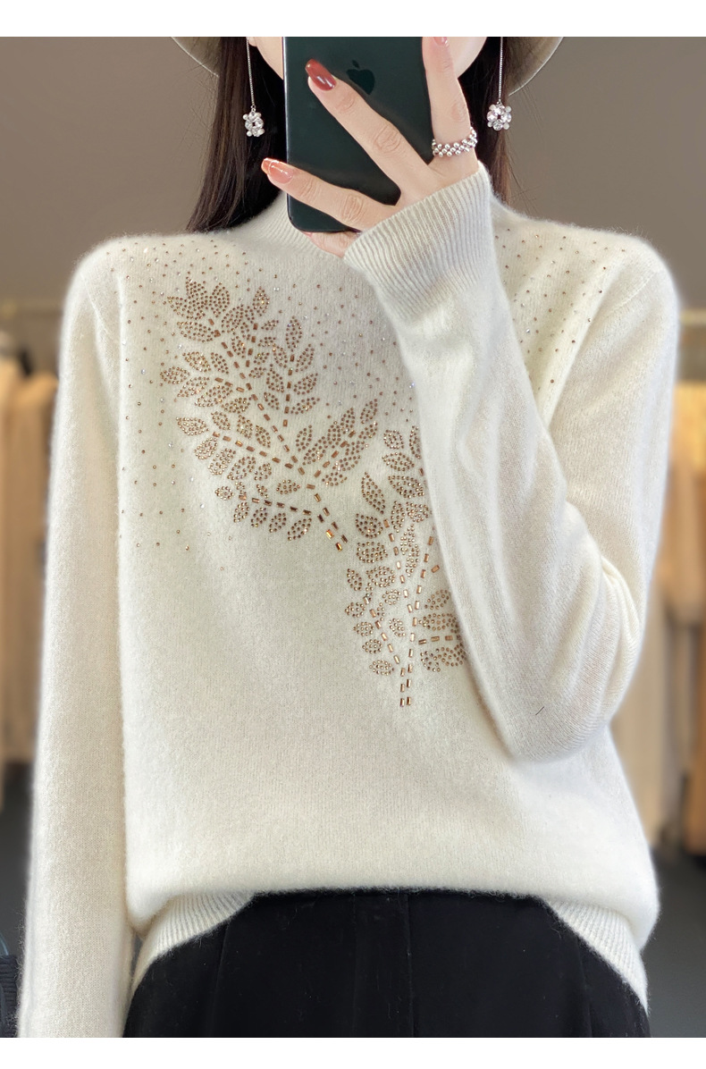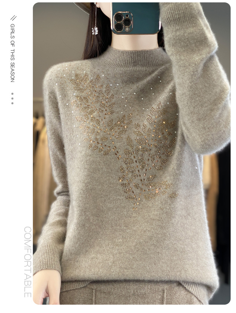 패셔너블하고 나이를 줄여주는 루즈하고 슬림한 긴팔 풀오버 스웨터, 핫 다이아몬드 스플라이싱 하프 터틀넥 스웨터