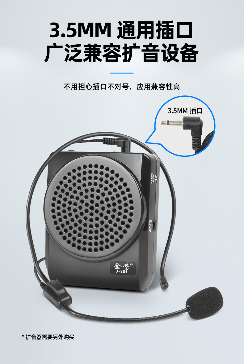 答:扩音器一般采用3.5毫米麦克风插口,我们产品是通用型,可以使用。但是如果您的扩音器采用的是螺口插口即不能使用。
