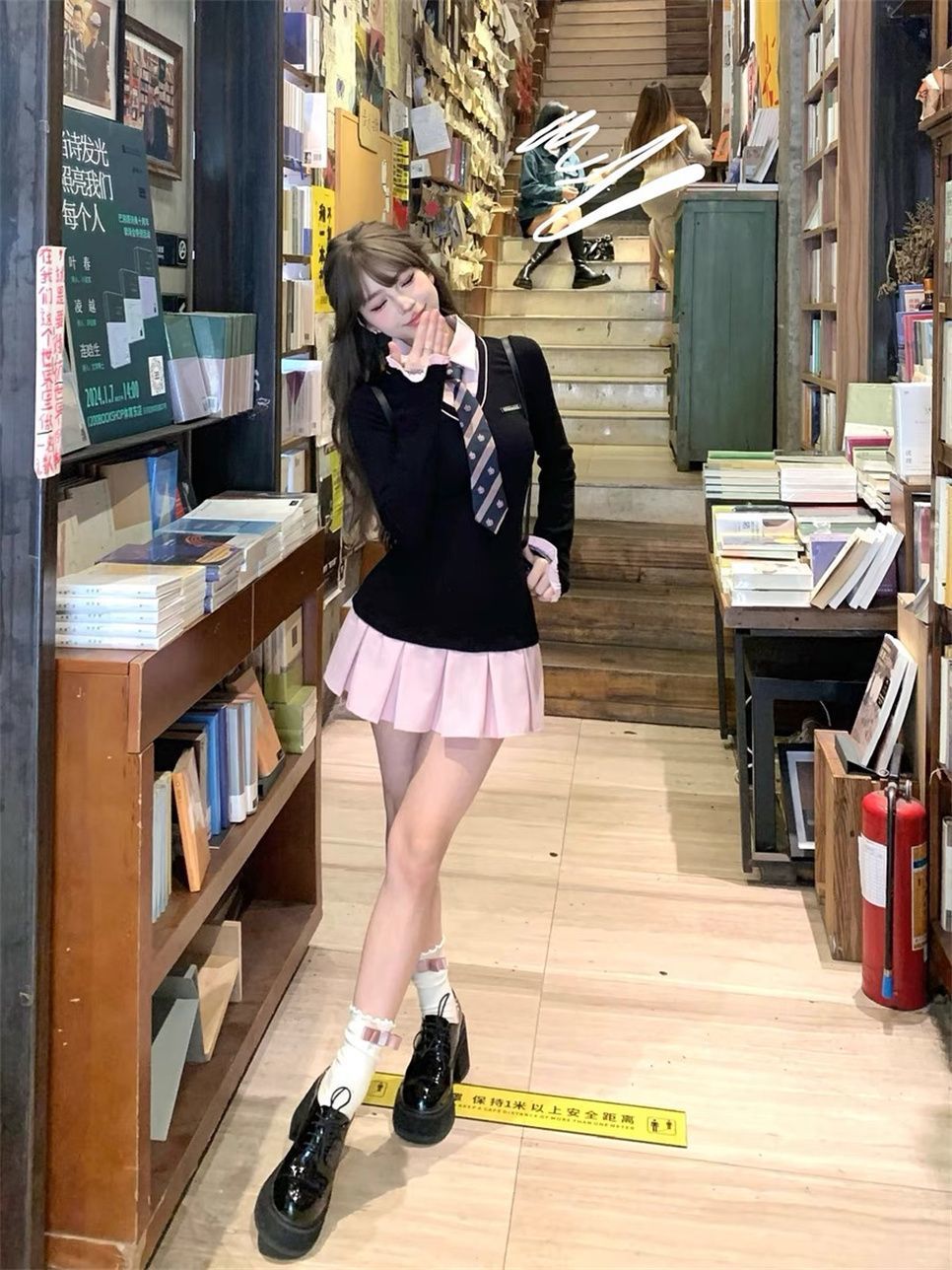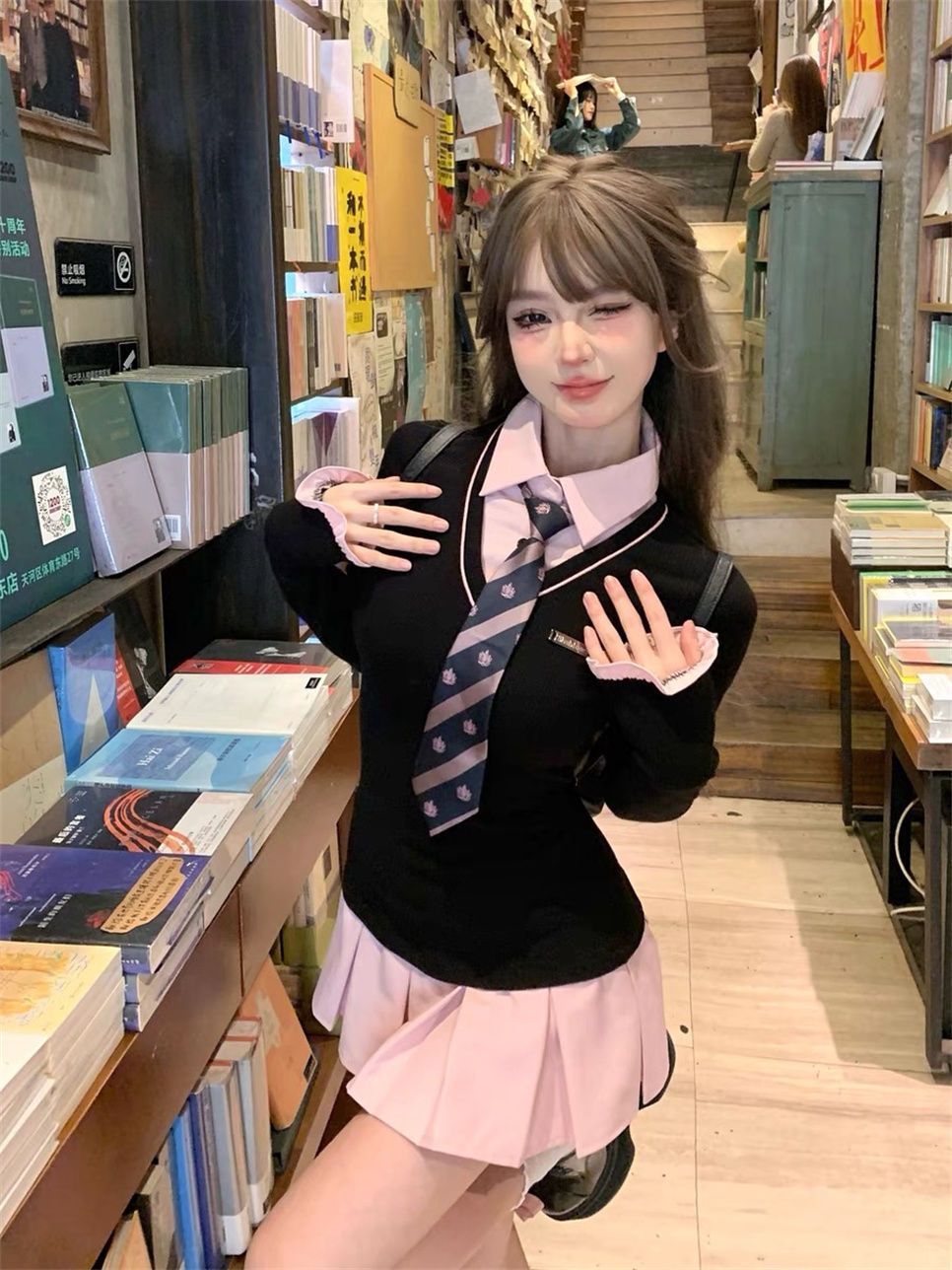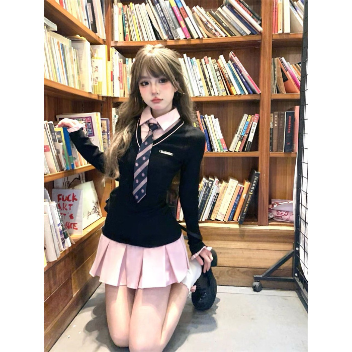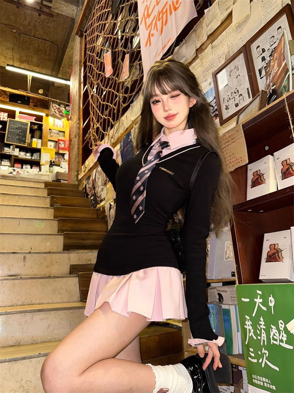 가짜 투피스 슬림 주름 치마 긴 소매 대학 스타일 스커트 달콤한 스파이스 소녀 슬림 폴로 넥 슬림-적합 높은 원피스스토어 가기