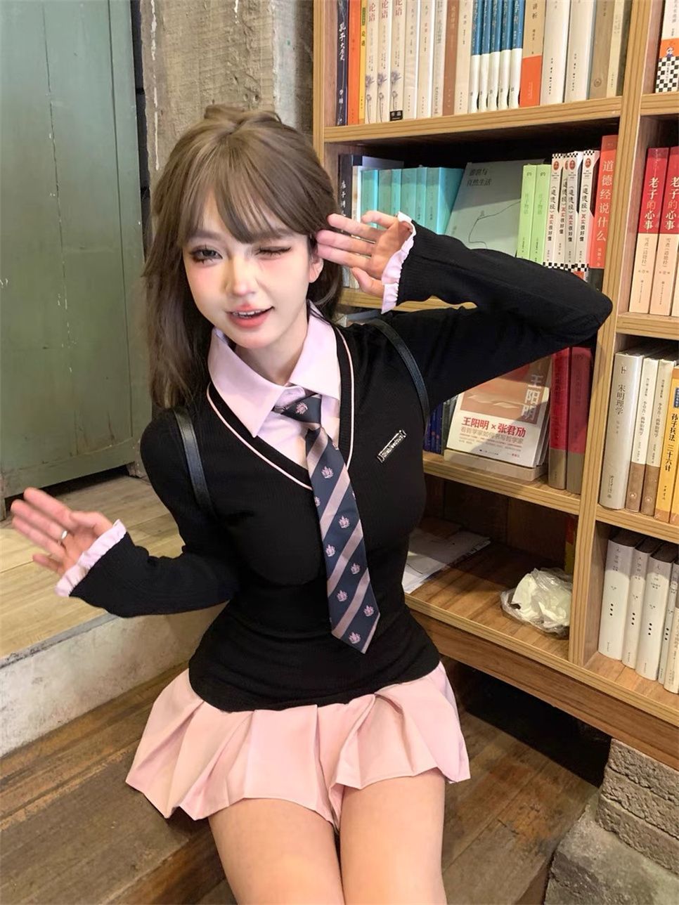 가짜 투피스 슬림 주름 치마 긴 소매 대학 스타일 스커트 달콤한 스파이스 소녀 슬림 폴로 넥 슬림-적합 높은 원피스
