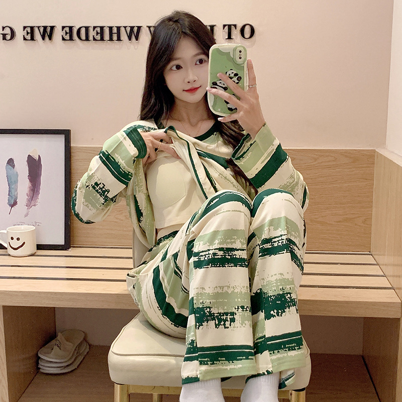 가슴 패드가 달린 잠옷 여성의 가을과 겨울 긴 소매 풀오버 여성 학생 만화 귀여운 홈 옷 세트 외모 착용 면화스토어 가기