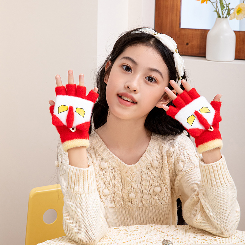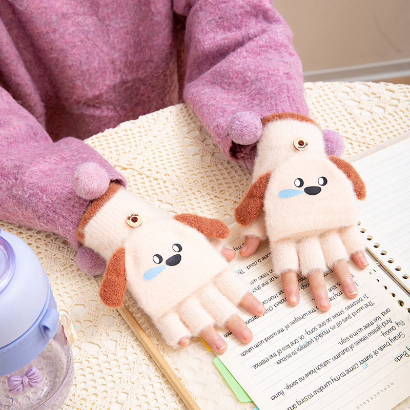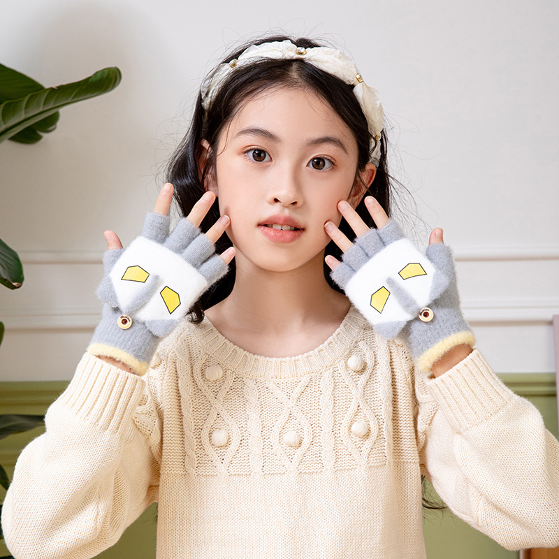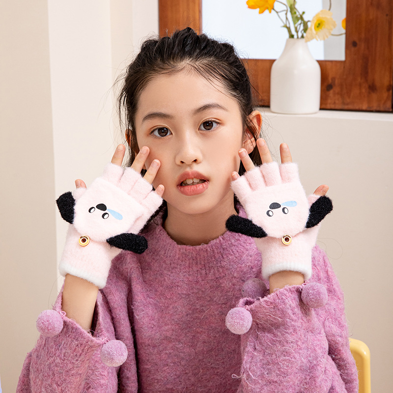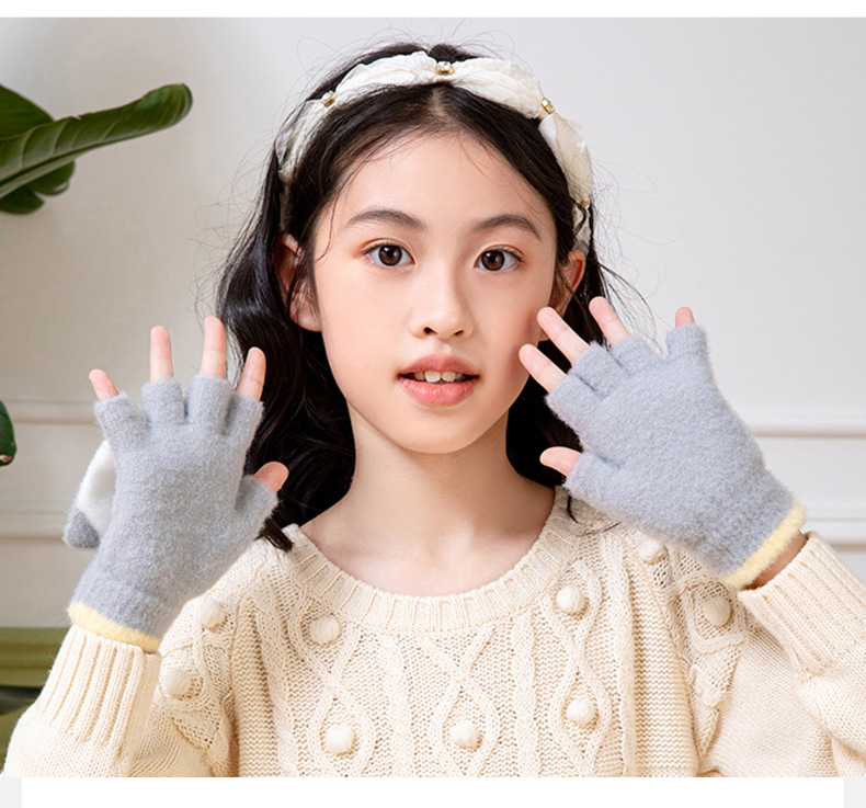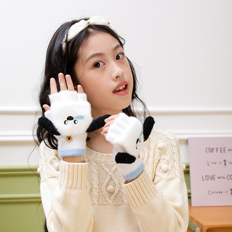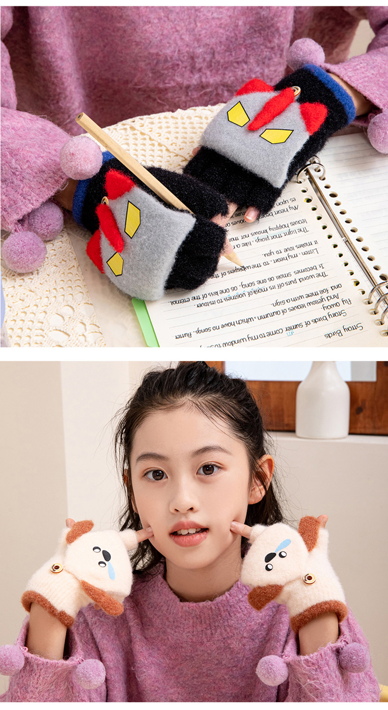 가을 겨울 어린이용 따뜻한 장갑, 학생용 글쓰기용 다섯 손가락 반손가락 플립업 방한 플러시 두꺼운 남녀 공용 장갑