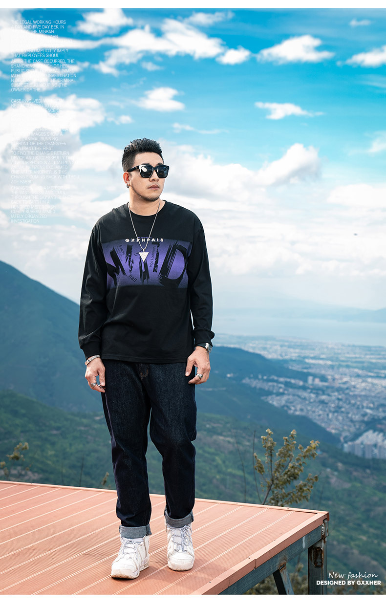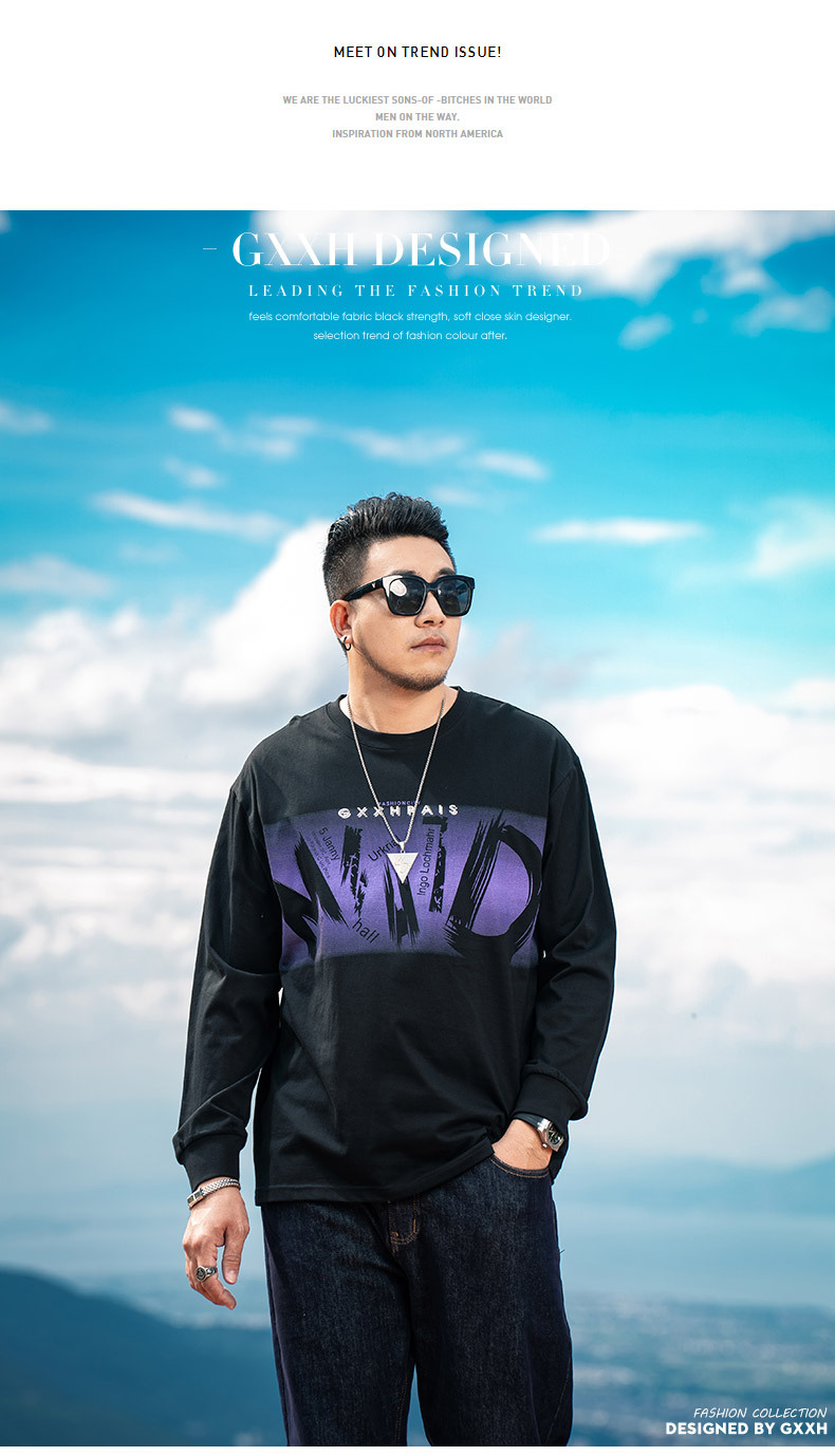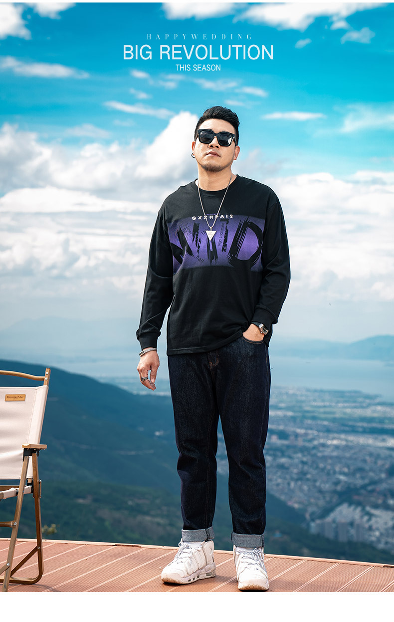 플러스 사이즈 남성 2024 가을 새로운 성격 편지 인쇄 트렌드 긴팔 티셔츠 남성 둥근 목 탑스토어 가기
