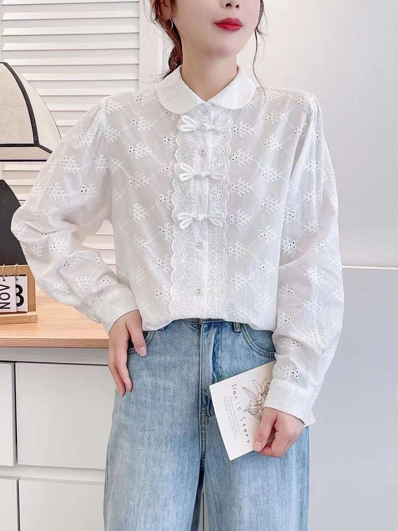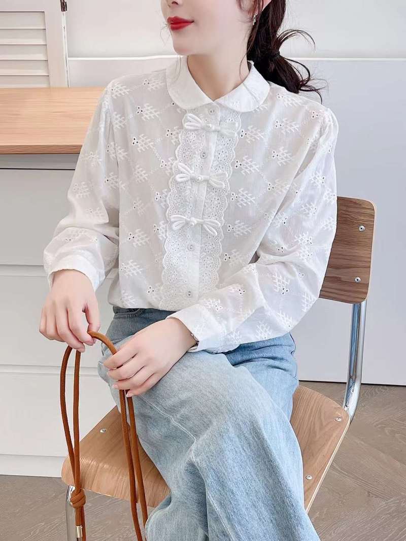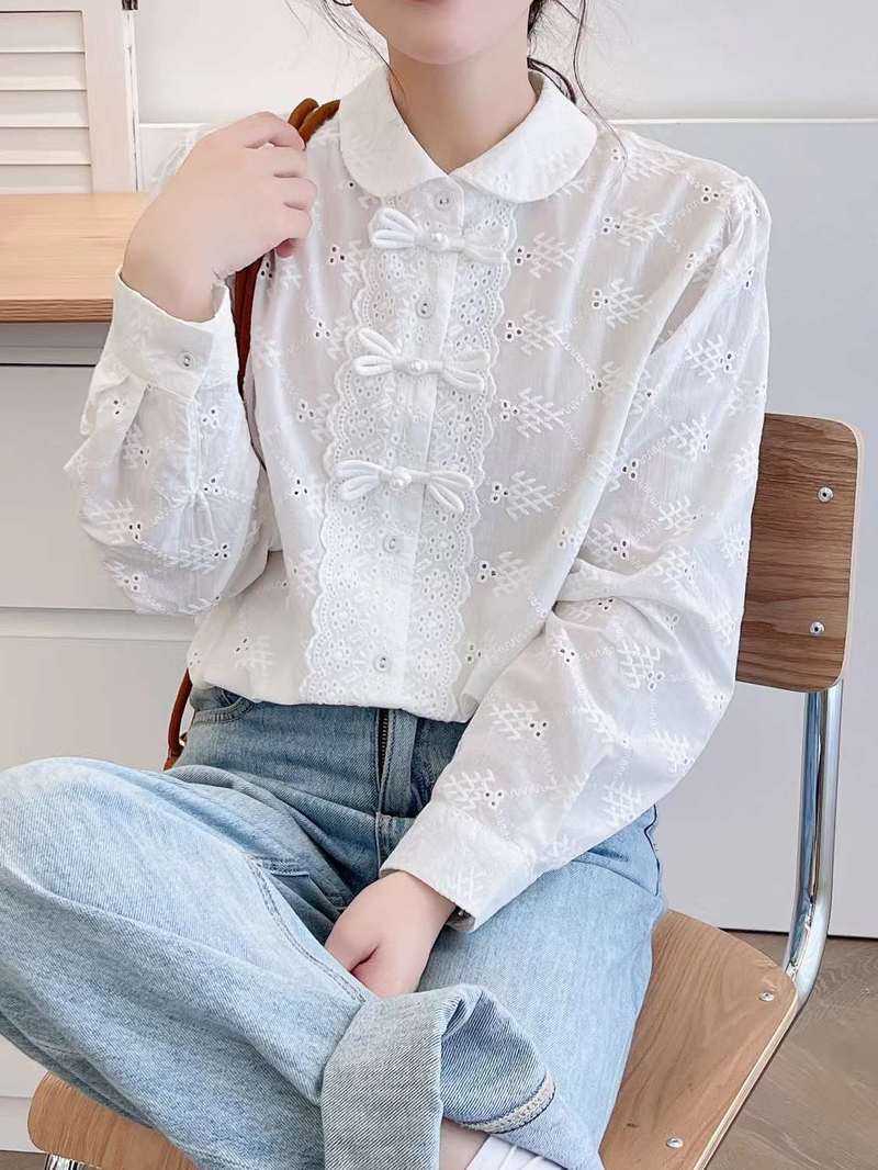 일본 모리 여성의 새로운 도착 자수 중공 버튼 활 느슨한 여성의 긴 소매 셔츠스토어 가기