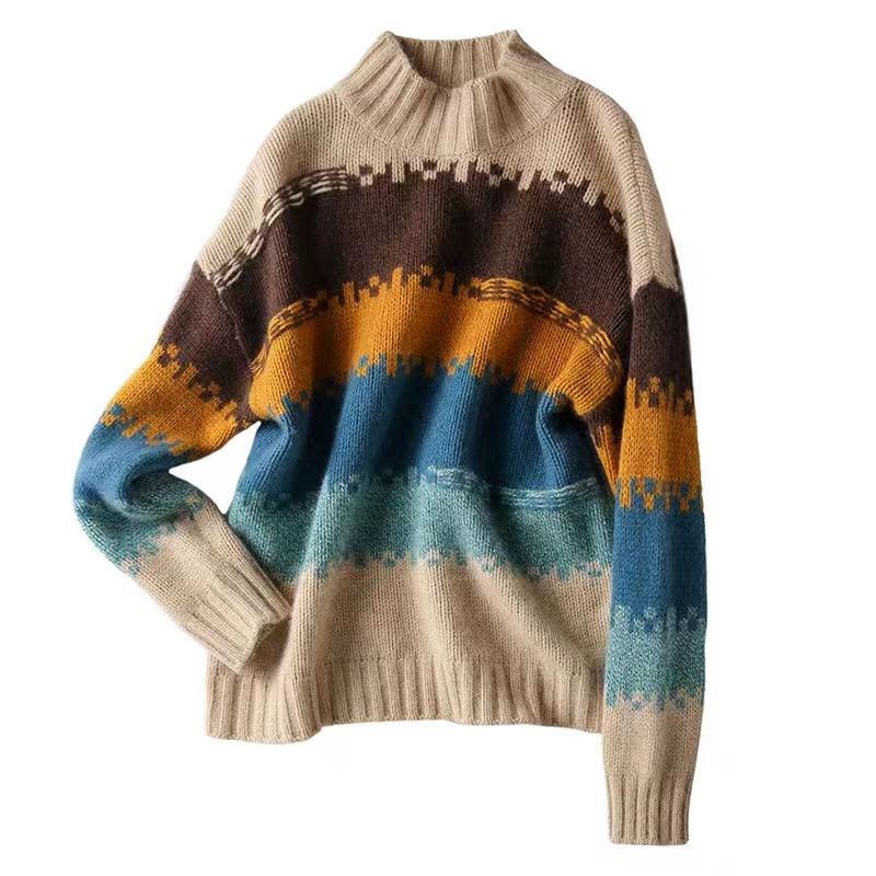 2024 가을과 겨울 새로운 한국 스타일 우아한 레인보우 스트라이프 컬러 매칭 하프 터틀넥 니트 베이스 스웨터 여성 의류스토어 가기