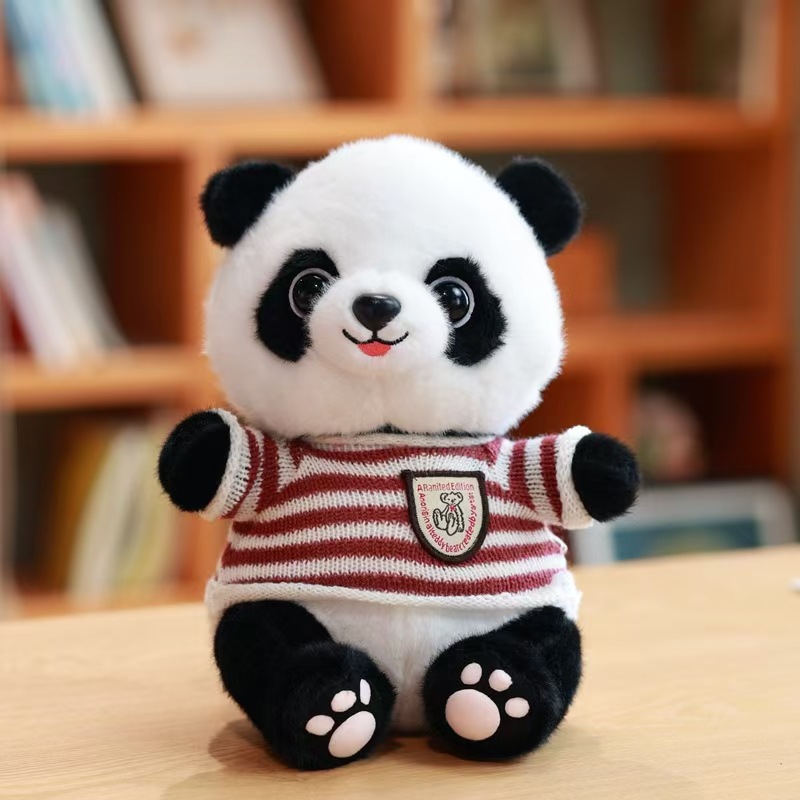 • 앉아있는 팬더 빨간색과 흰색 줄무늬 스웨터