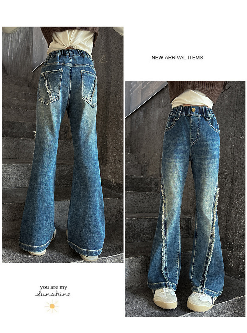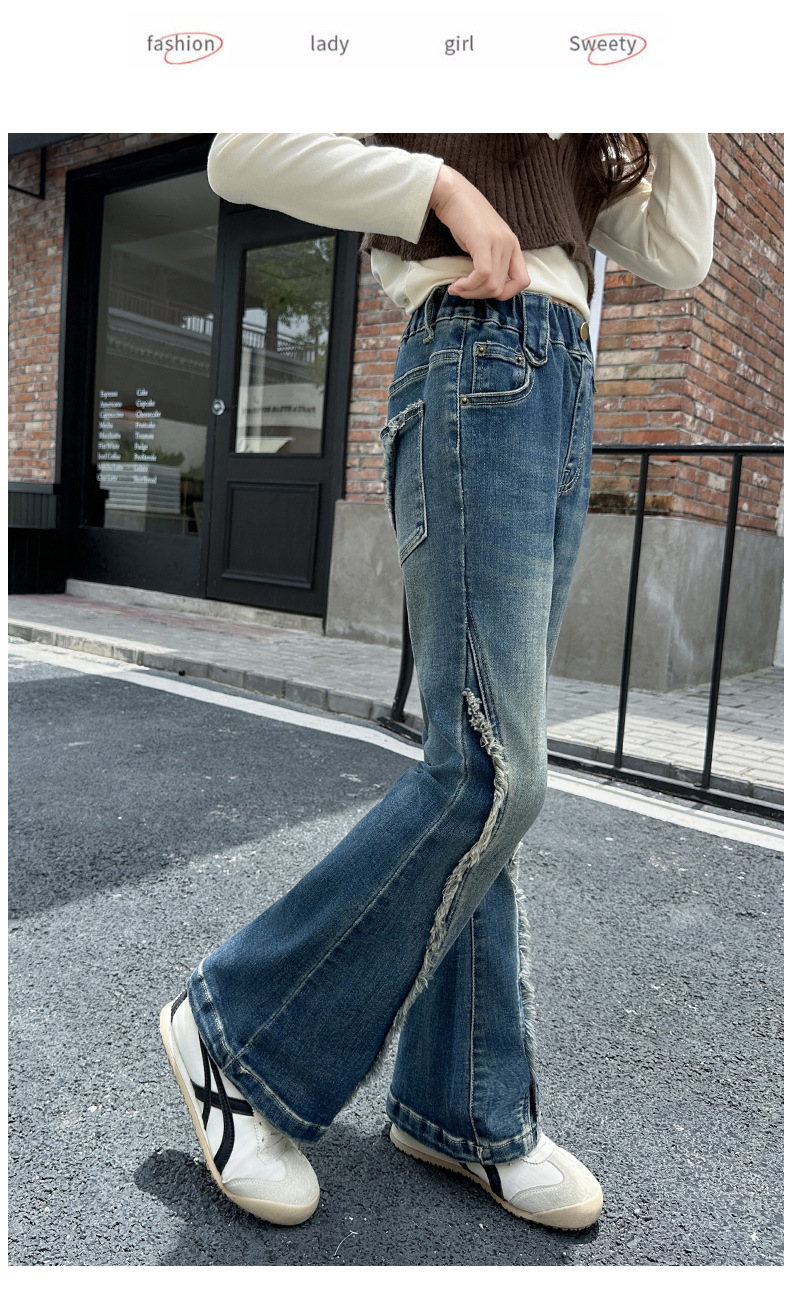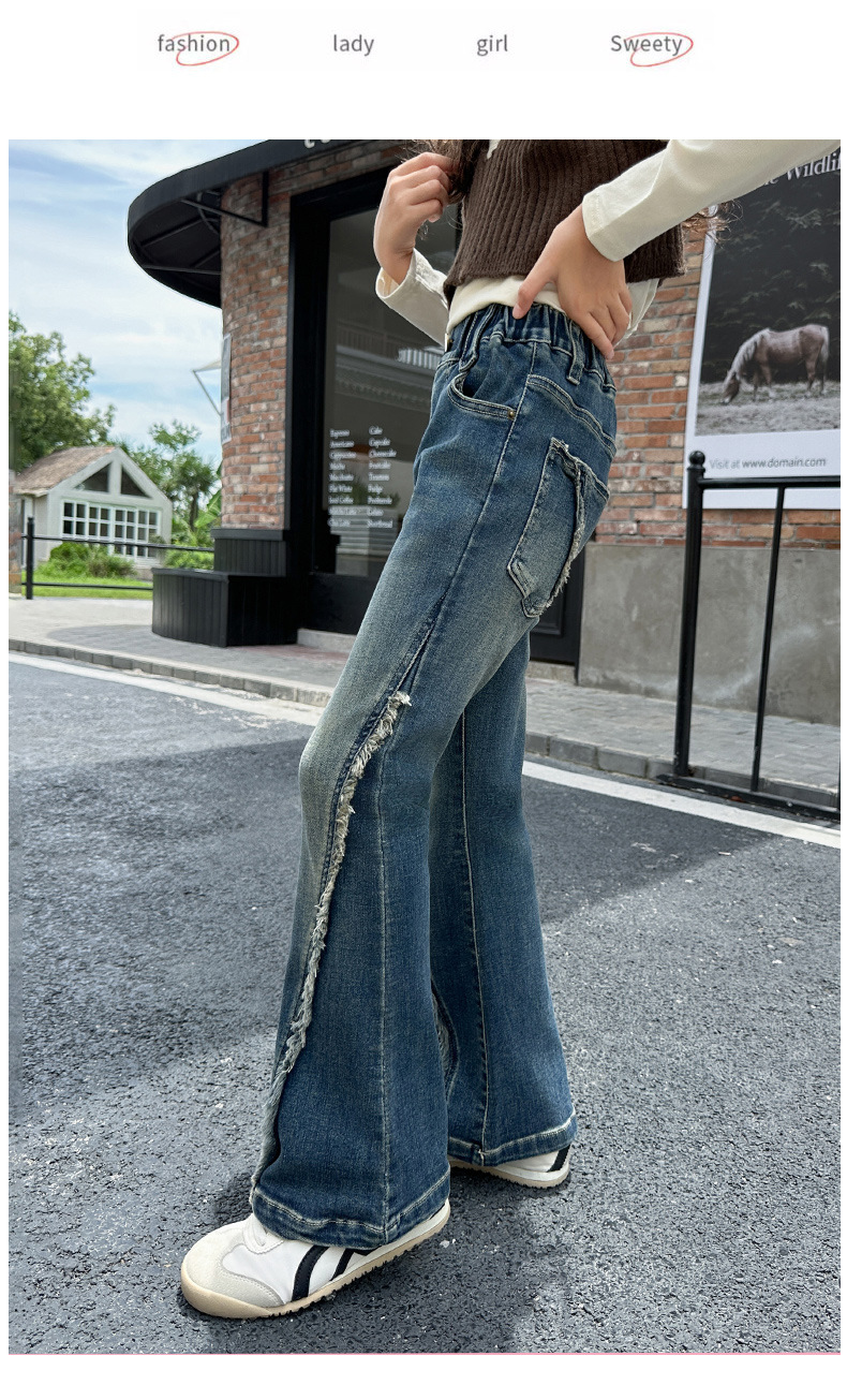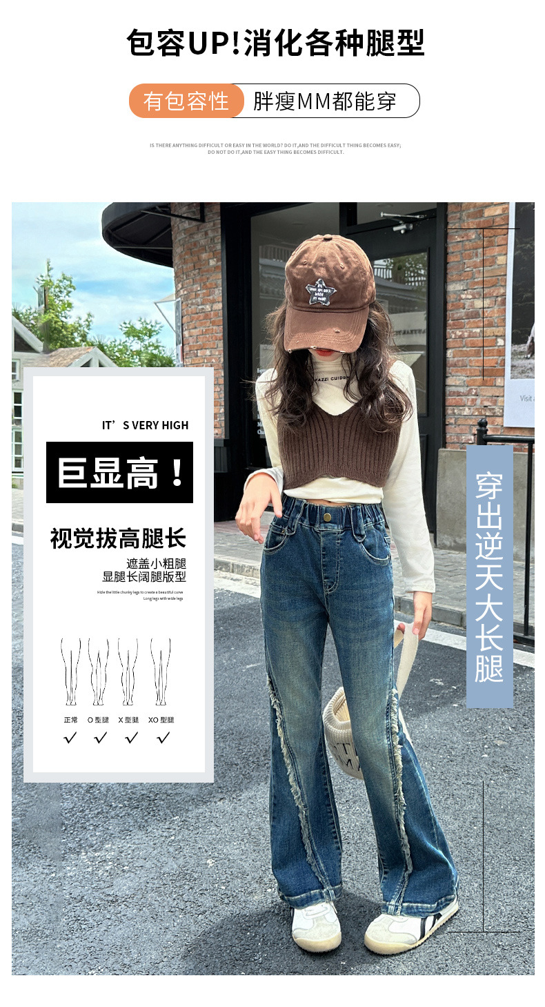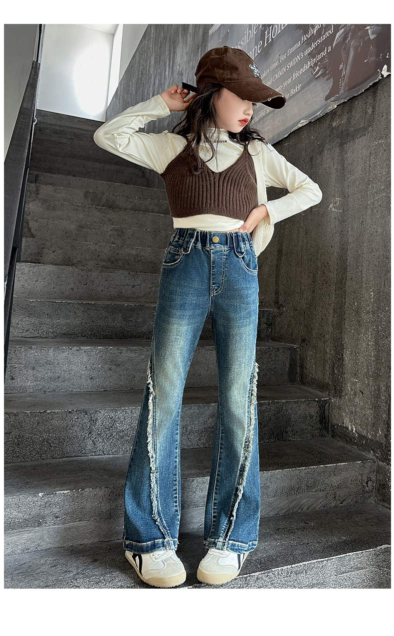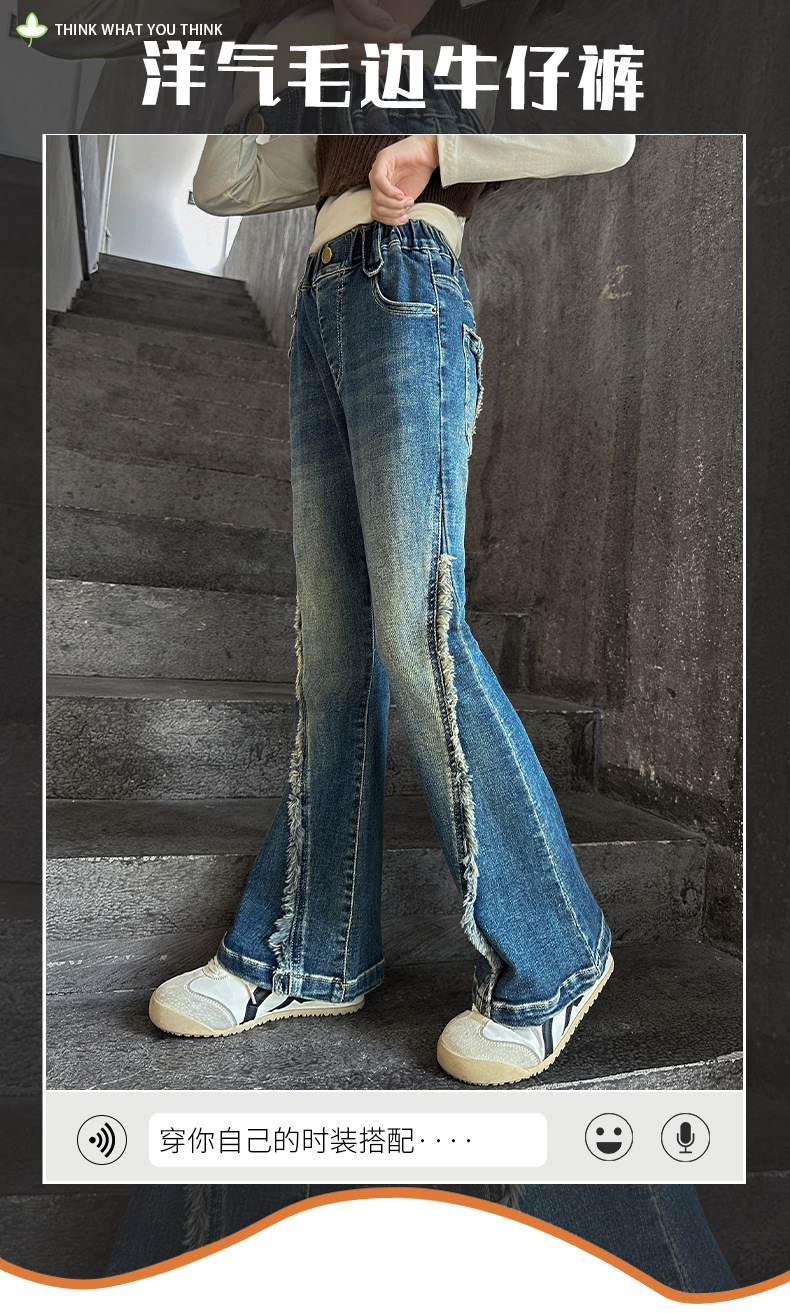 소녀 청바지 가을 2024 년 새로운 패션 어린이 스트레치 바지 대형 어린이 슬림 핏 모피 가장자리 플라 바지 어린이 바지스토어 가기
