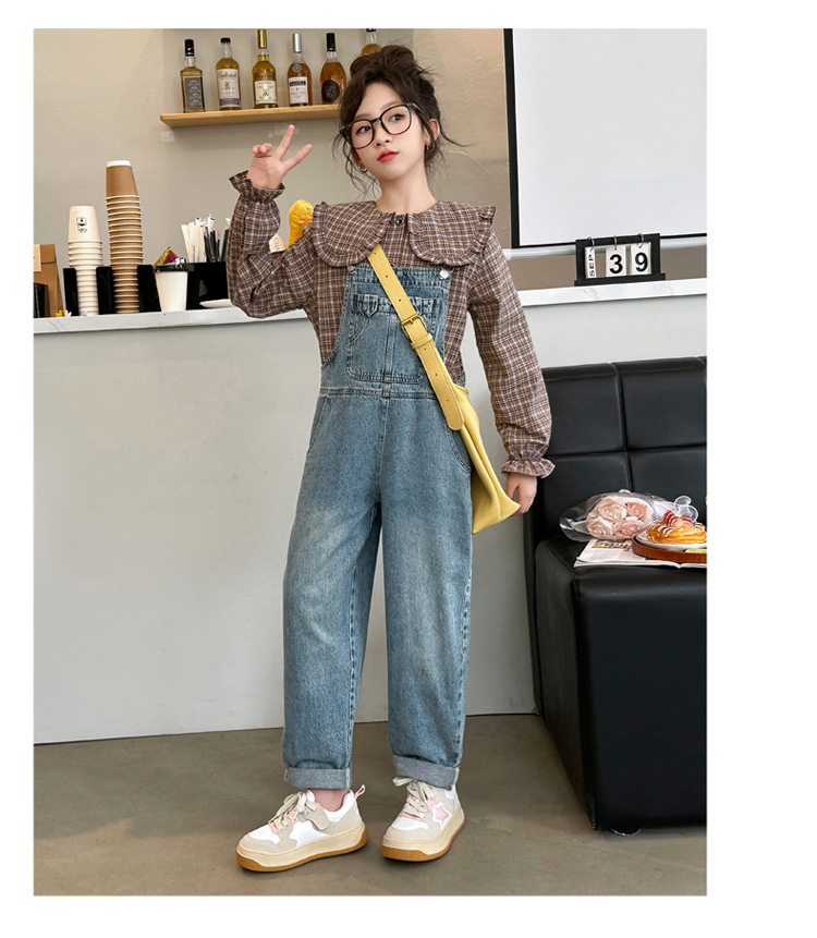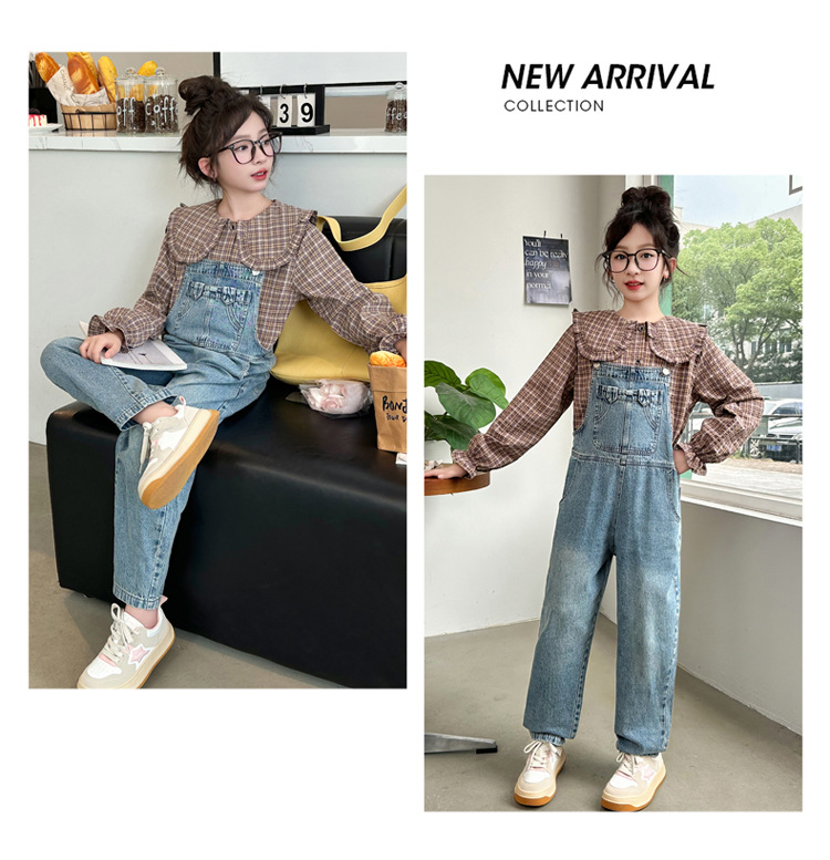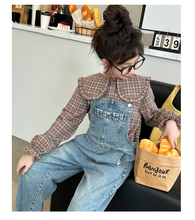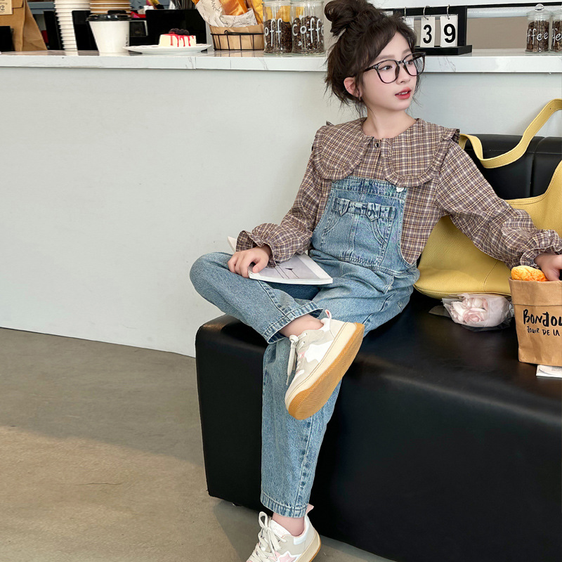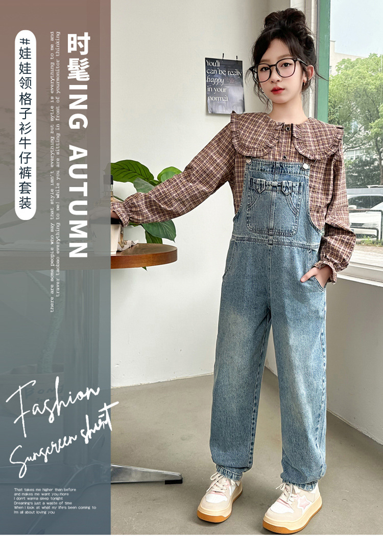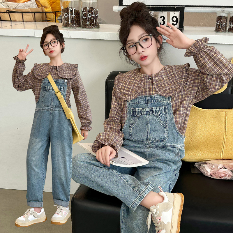 소녀 가을 서양식 스트랩 바지 세트 2024 새로운 한국식 어린이 격자 무늬 셔츠 중대형 아동복 2 피스 세트스토어 가기