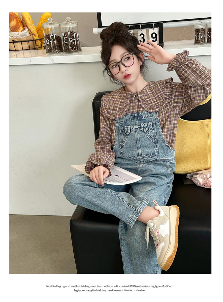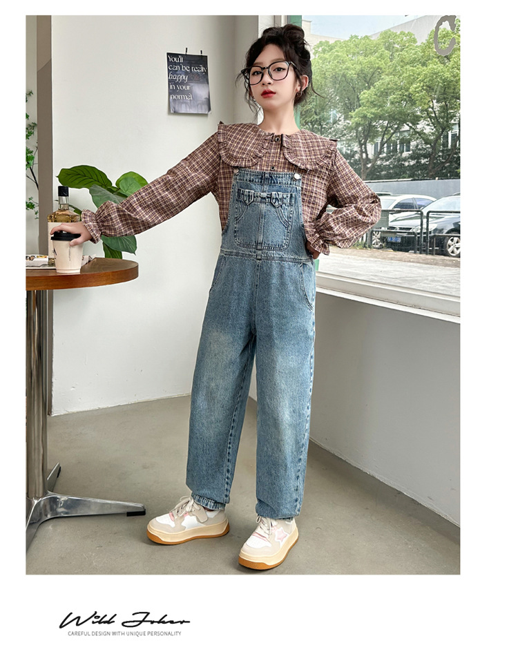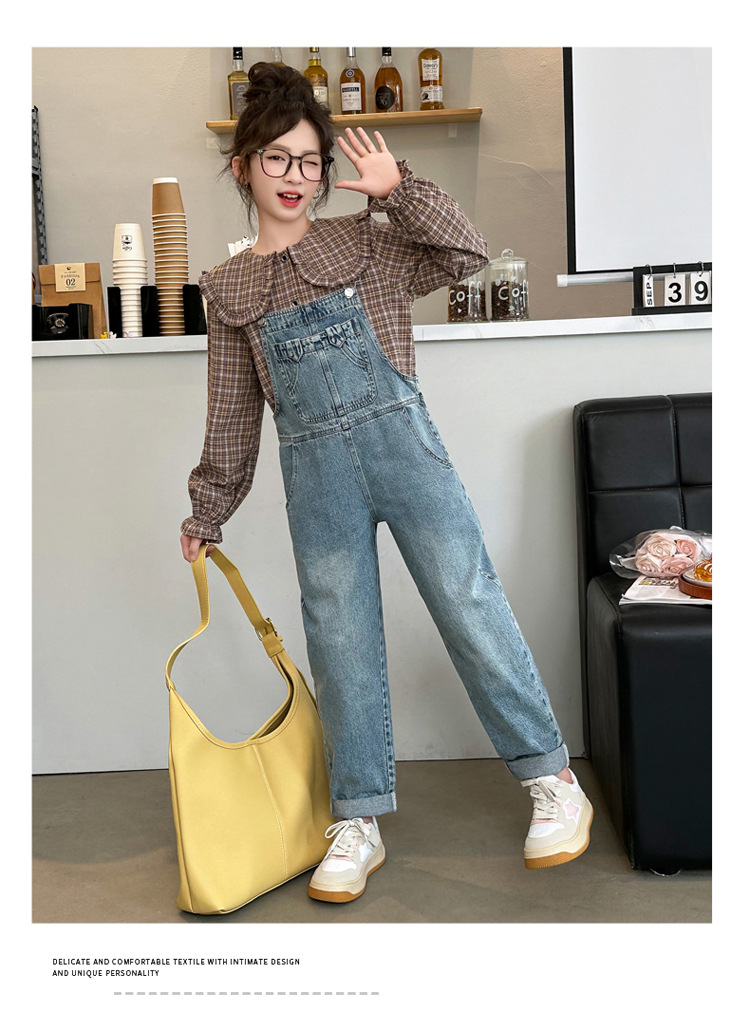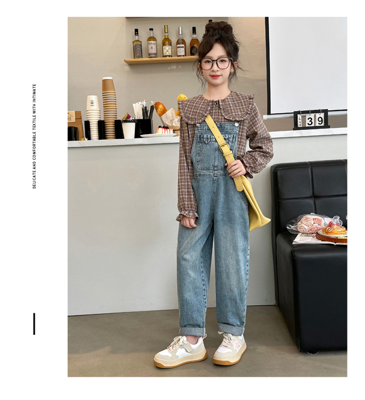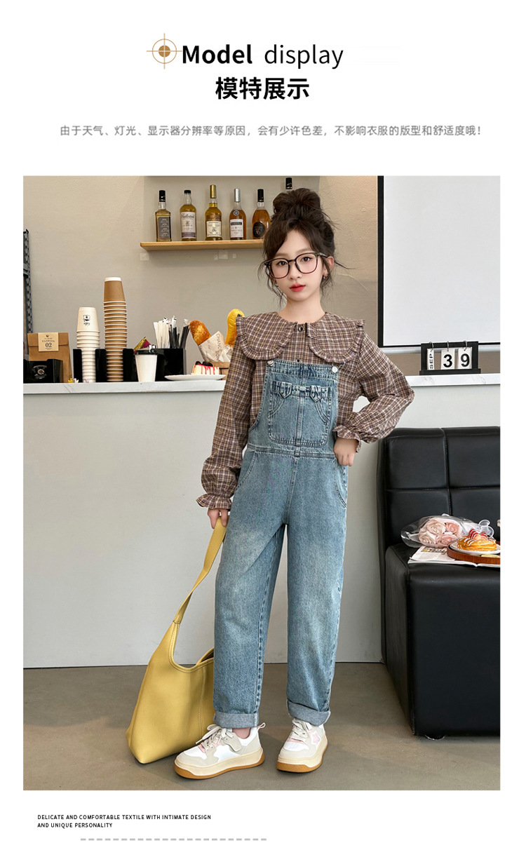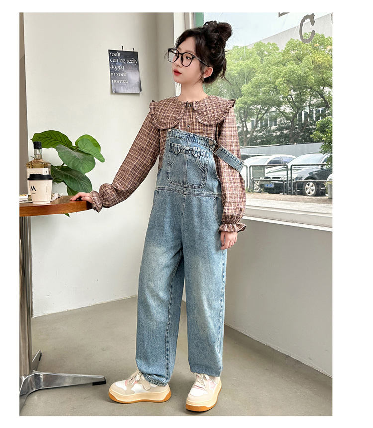소녀 가을 서양식 스트랩 바지 세트 2024 새로운 한국식 어린이 격자 무늬 셔츠 중대형 아동복 2 피스 세트스토어 가기