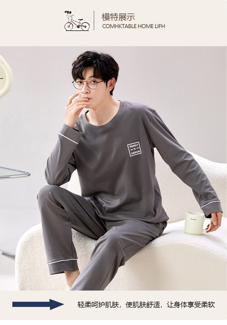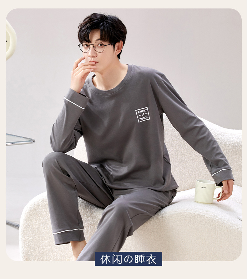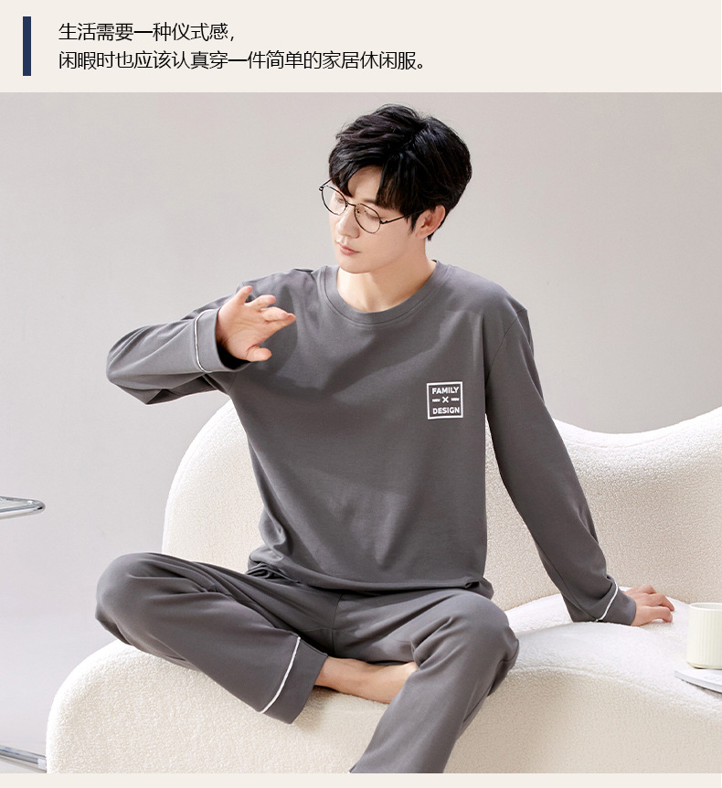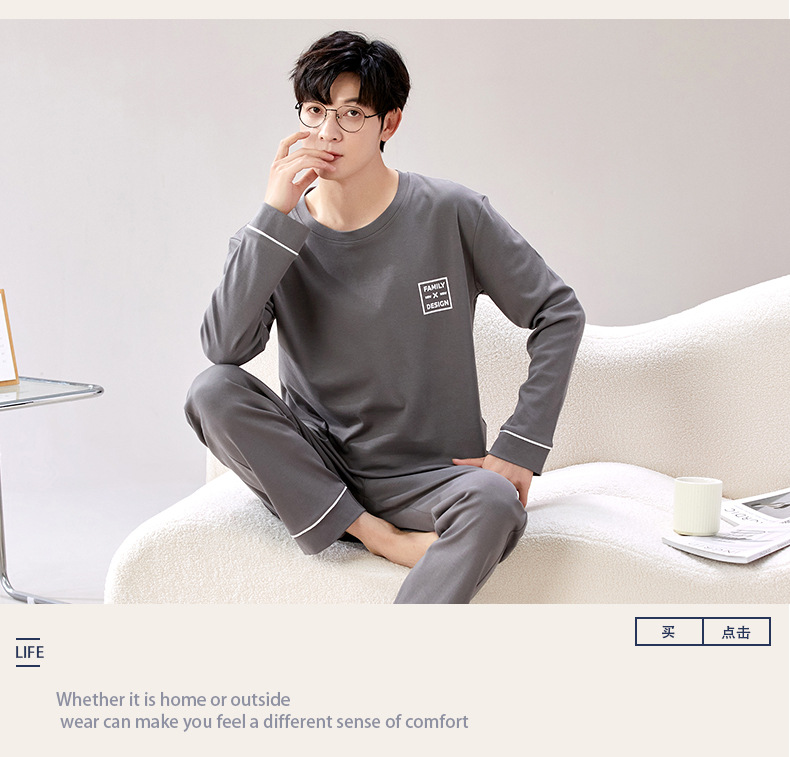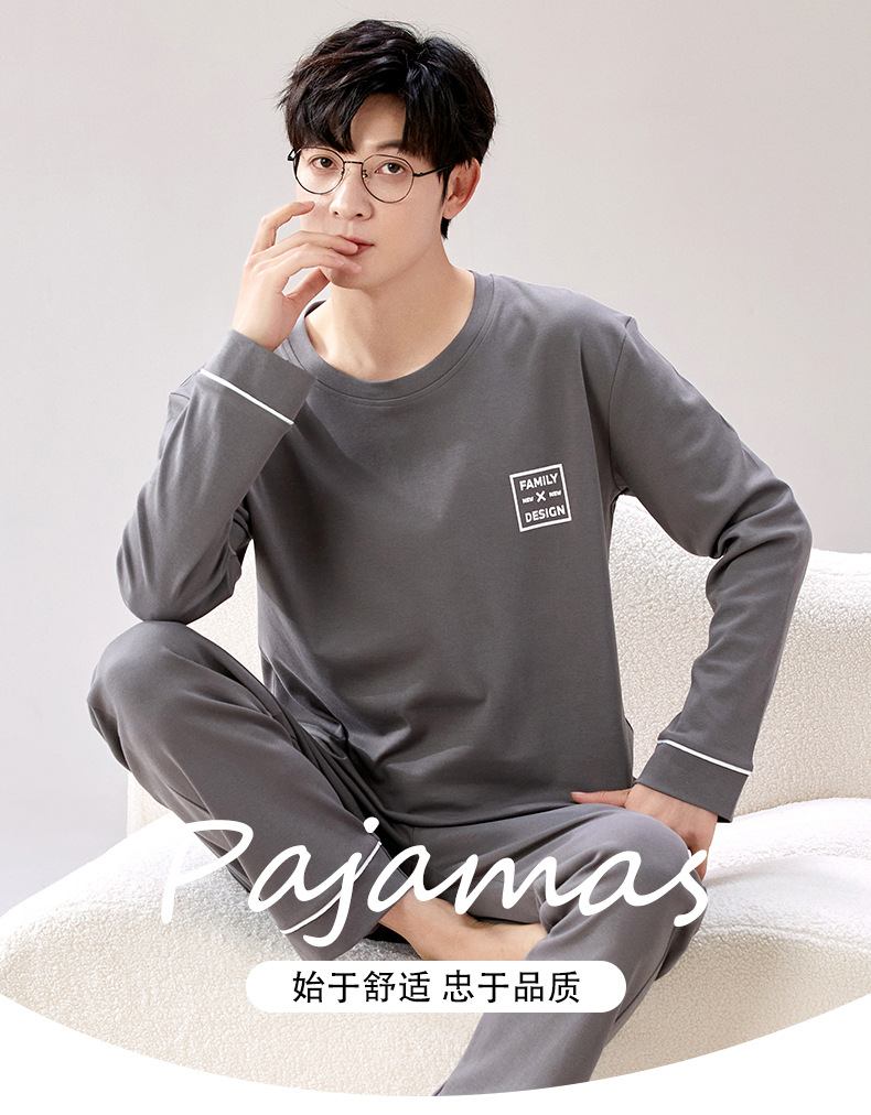 라이브 방송 봄과 가을 순면 잠옷 남자 긴팔 둥근 목 풀오버 순면 청소년 풀오버는 가정 옷 밖에서 입을 수 세트스토어 가기