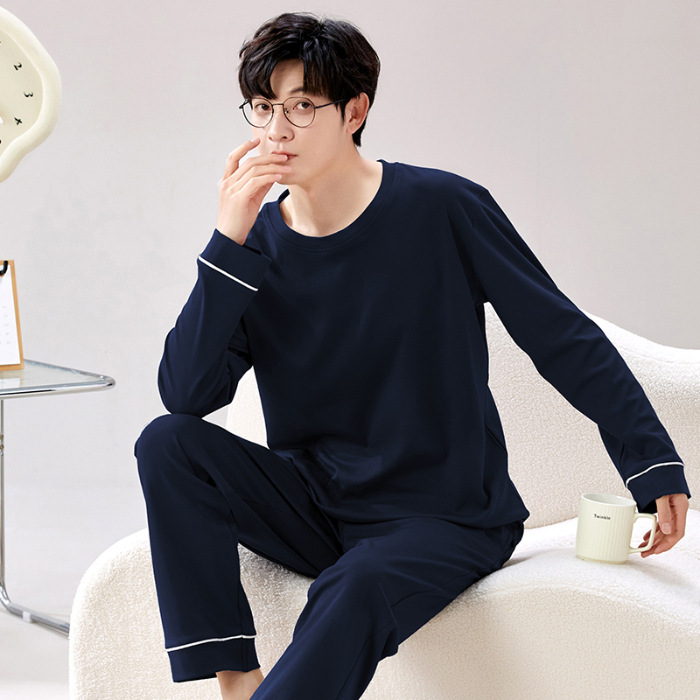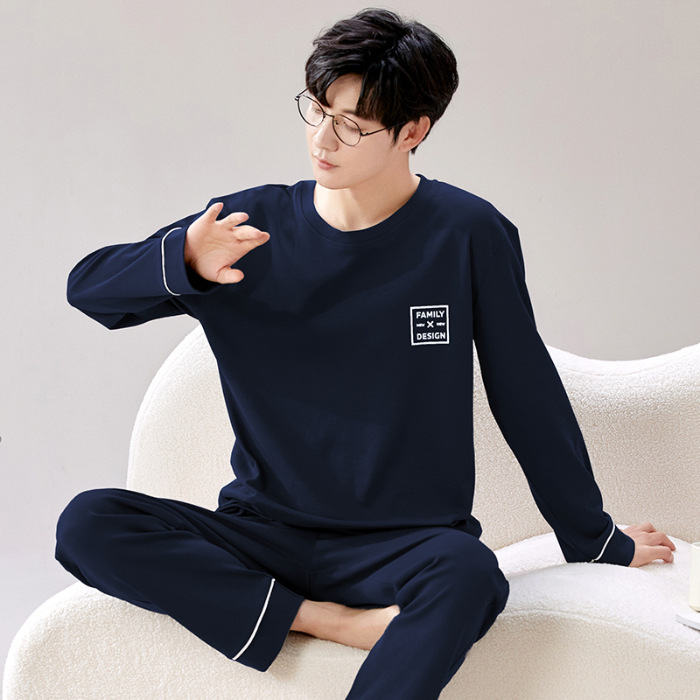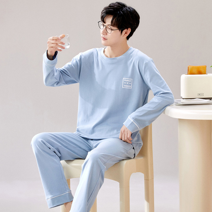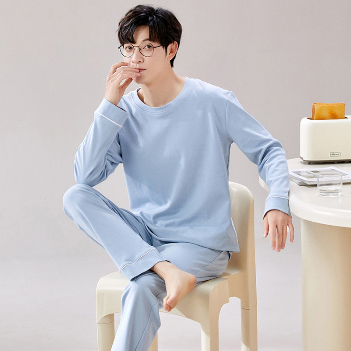 라이브 방송 봄과 가을 순면 잠옷 남자 긴팔 둥근 목 풀오버 순면 청소년 풀오버는 가정 옷 밖에서 입을 수 세트