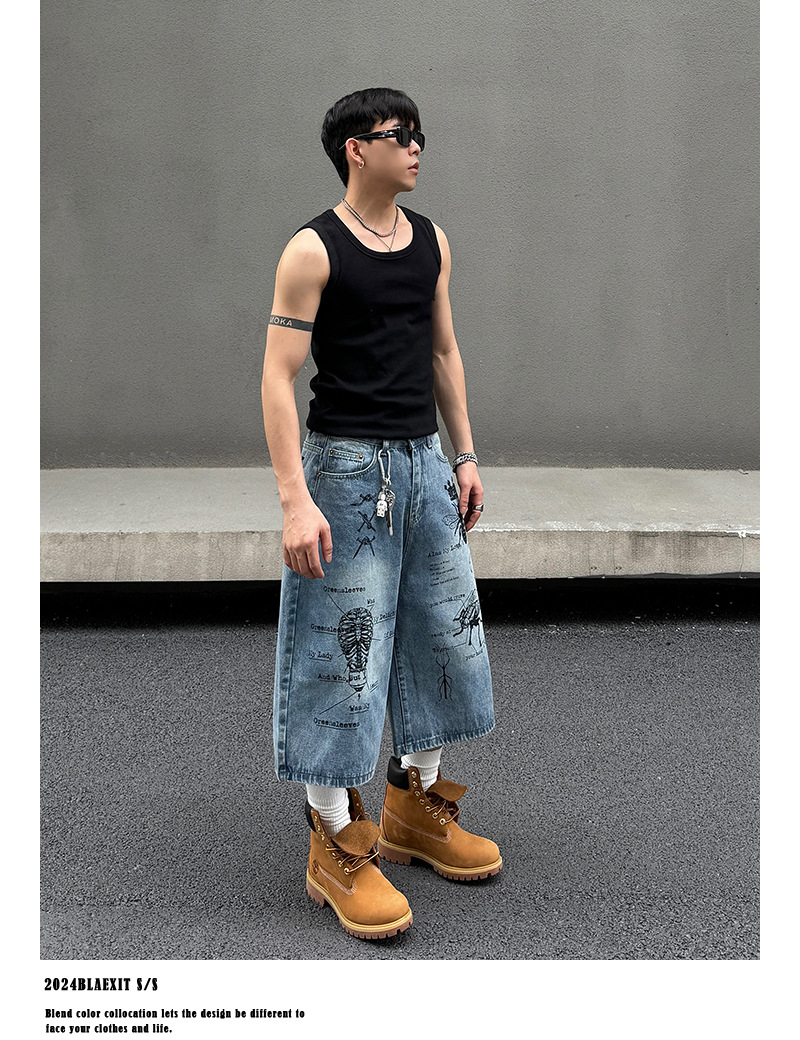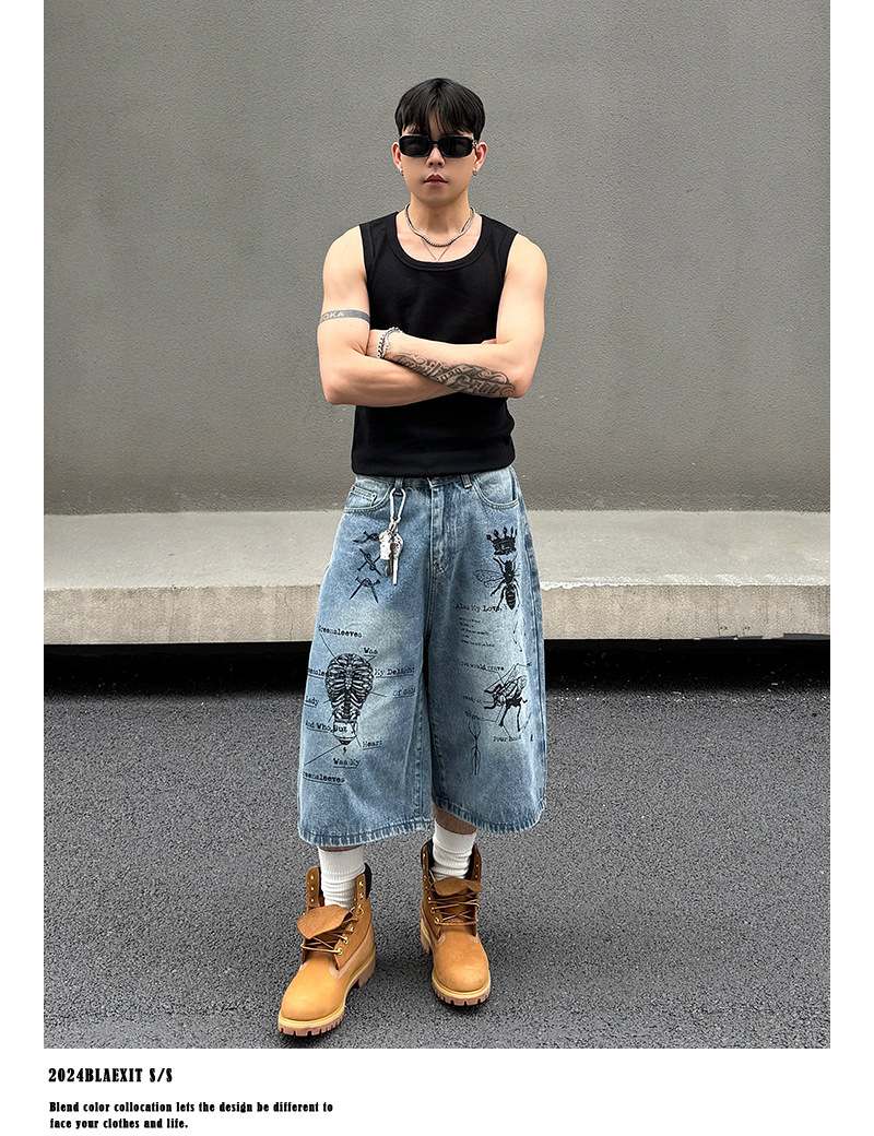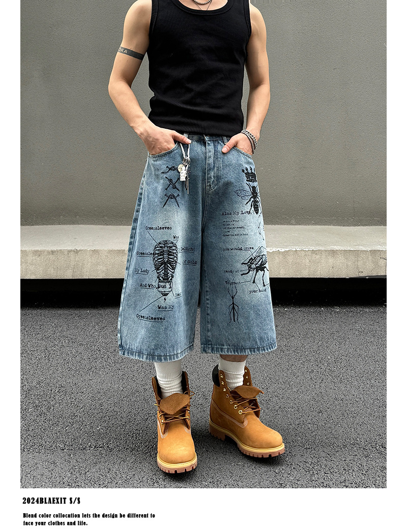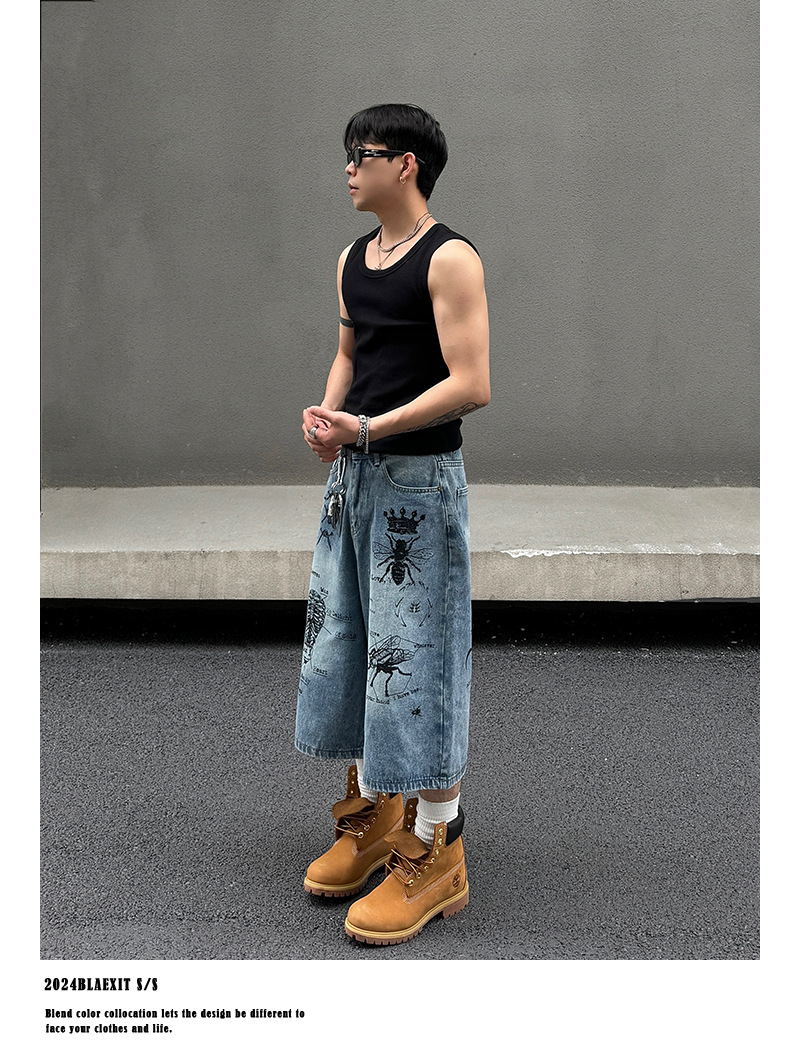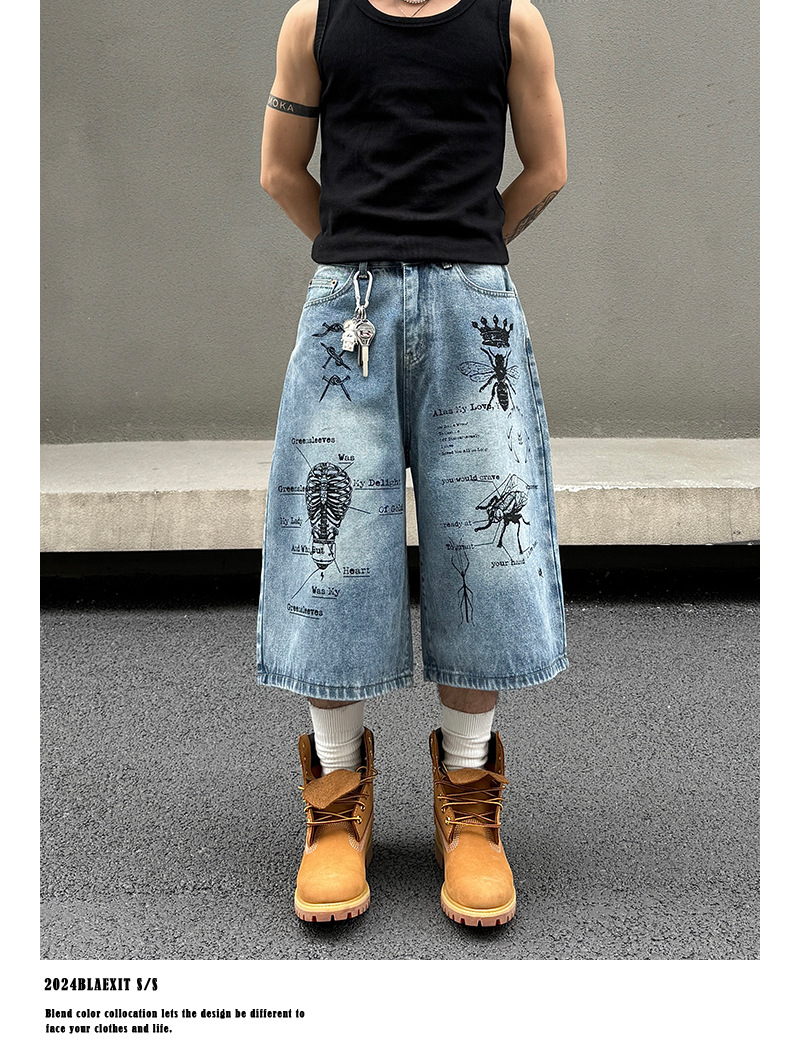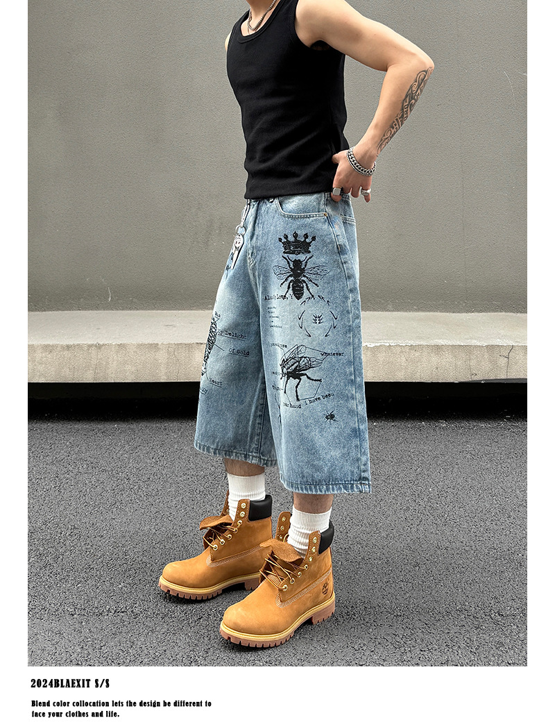 2024 미국 거리 세척 곤충 낙서 데님 반바지 남자 느슨한 직선 캐주얼 카프리 바지 여름