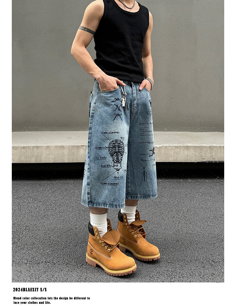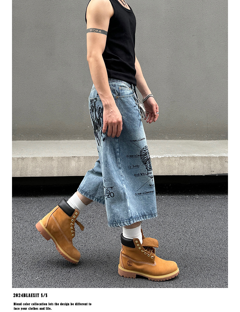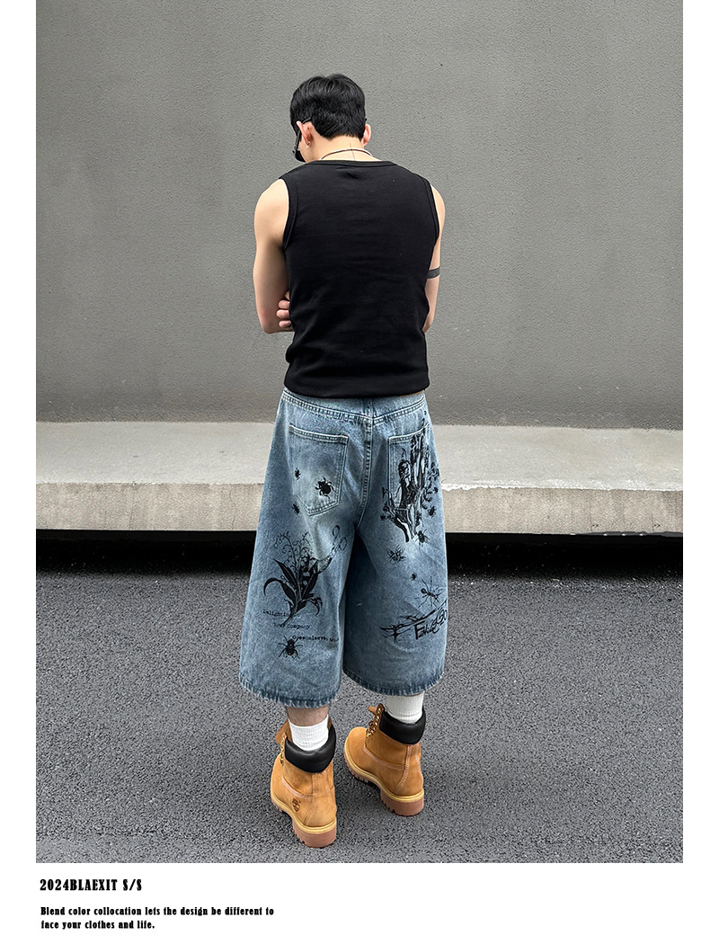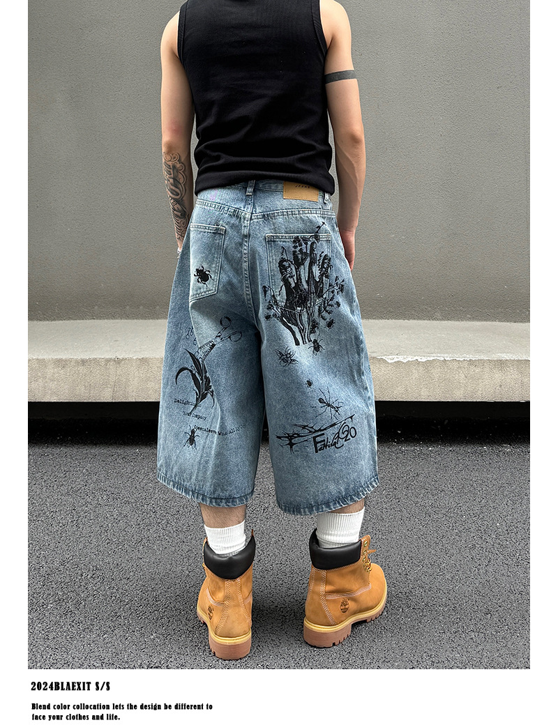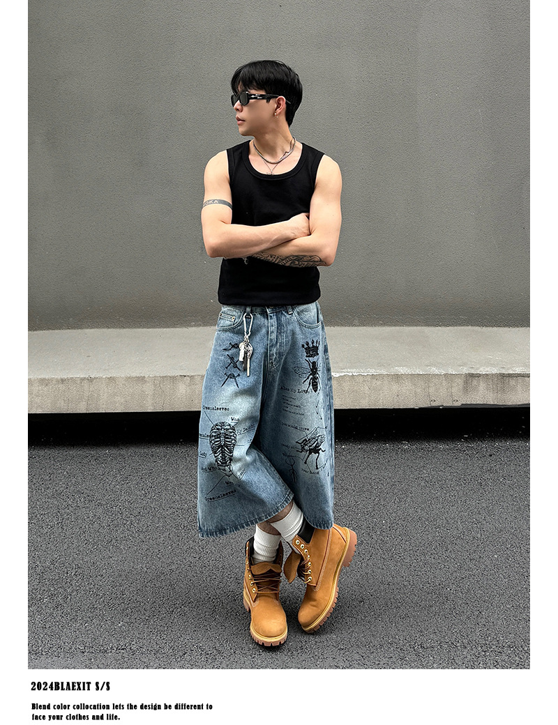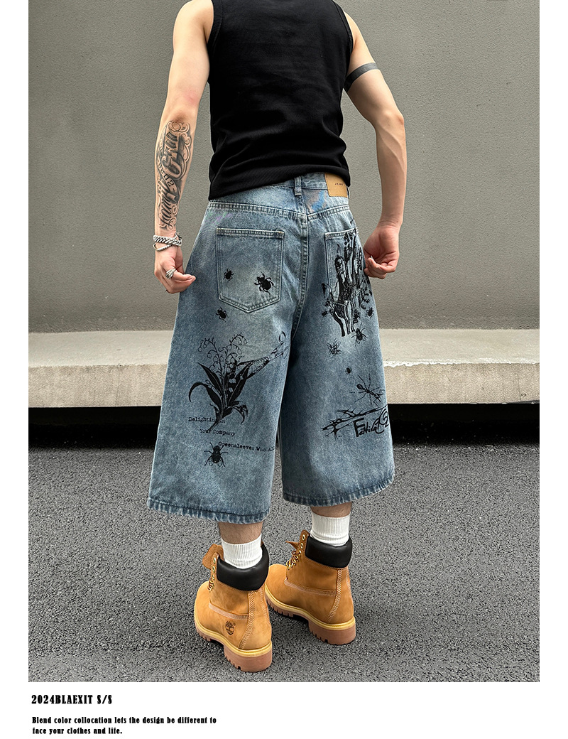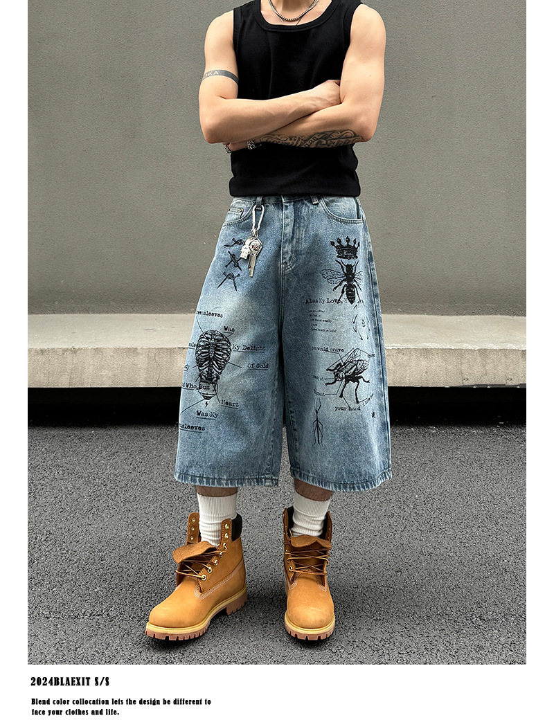2024 미국 거리 세척 곤충 낙서 데님 반바지 남자 느슨한 직선 캐주얼 카프리 바지 여름스토어 가기