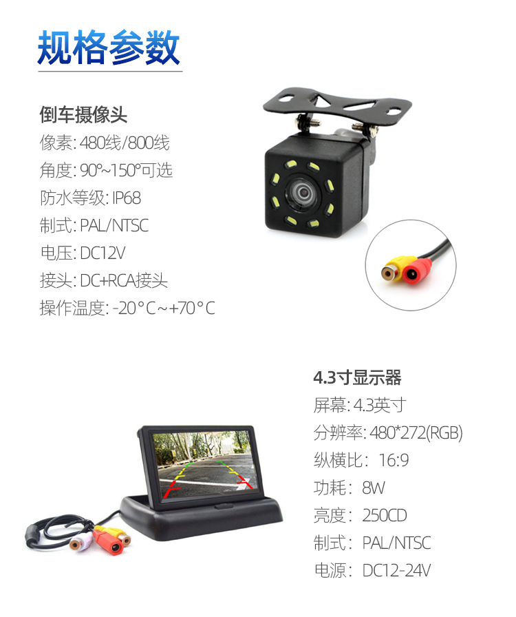 • 4.3inch 스택형 스크린 + 외부 8등 카메라 + 7m 연장 케이블