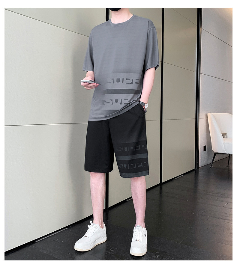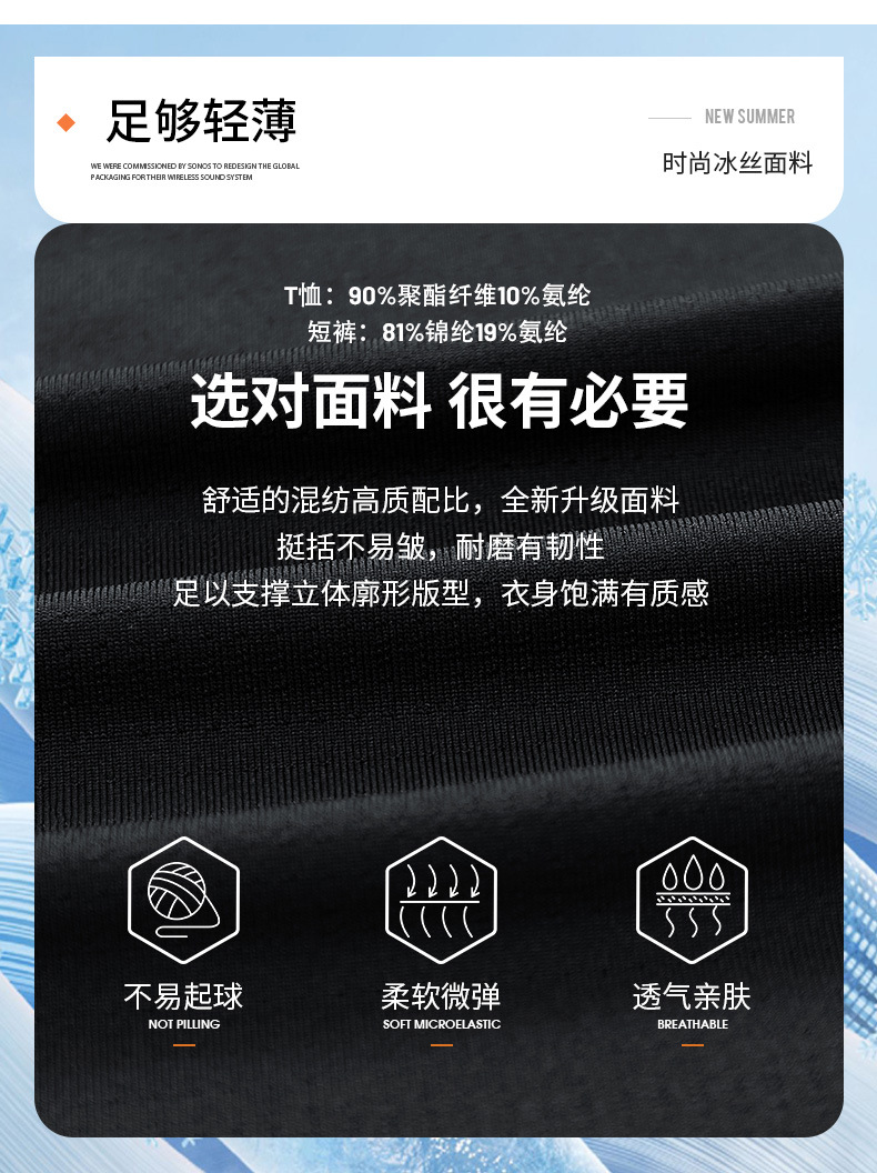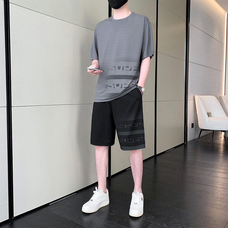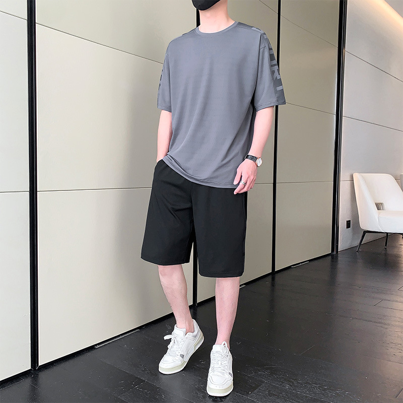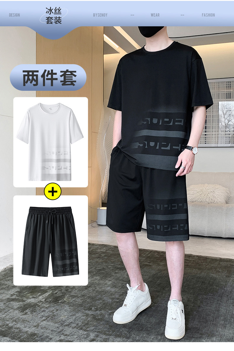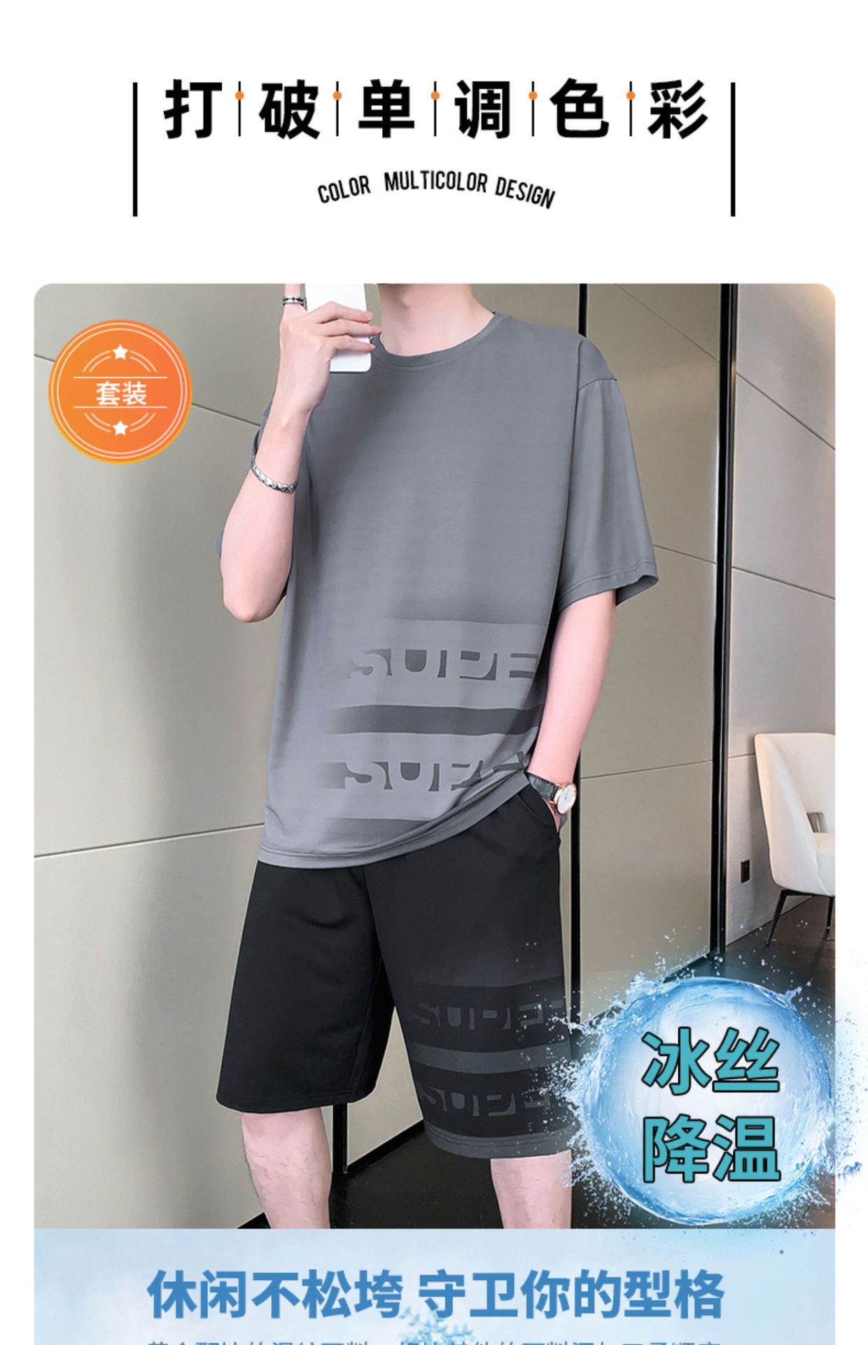 남성용 새로운 반팔 티셔츠 정장 여름 얼음 실크 얇은 잘 생긴 캐주얼 운동복 러닝 속건 반바지 유행스토어 가기
