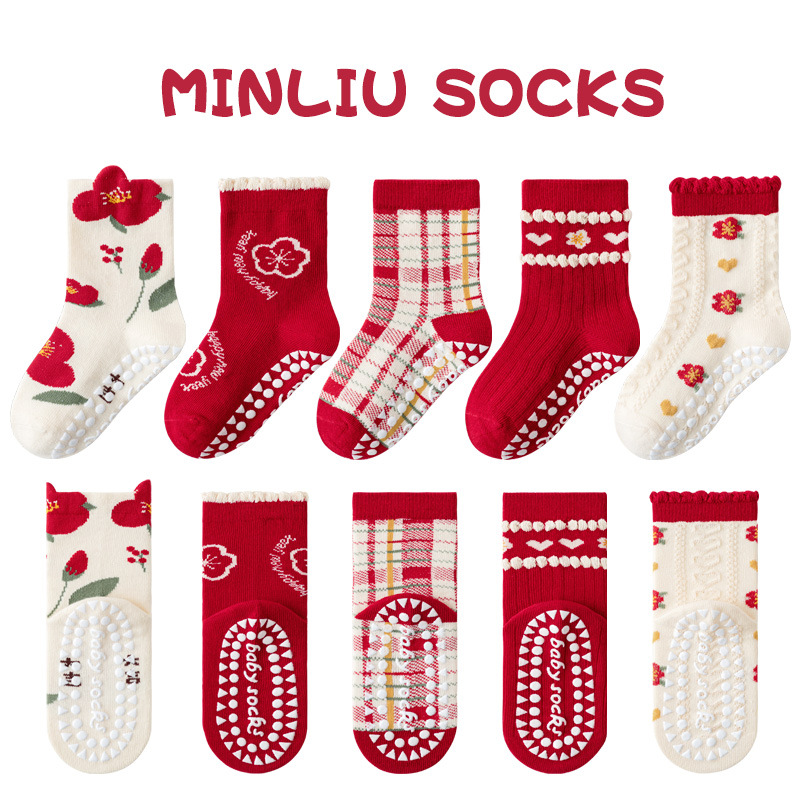 봄과 가을 어린이 양말 디스펜싱 트램폴린 레드 크리스마스 아기 면 양말 중간 길이 양말 만화 안티 슬립 양말 소년 소녀를위한