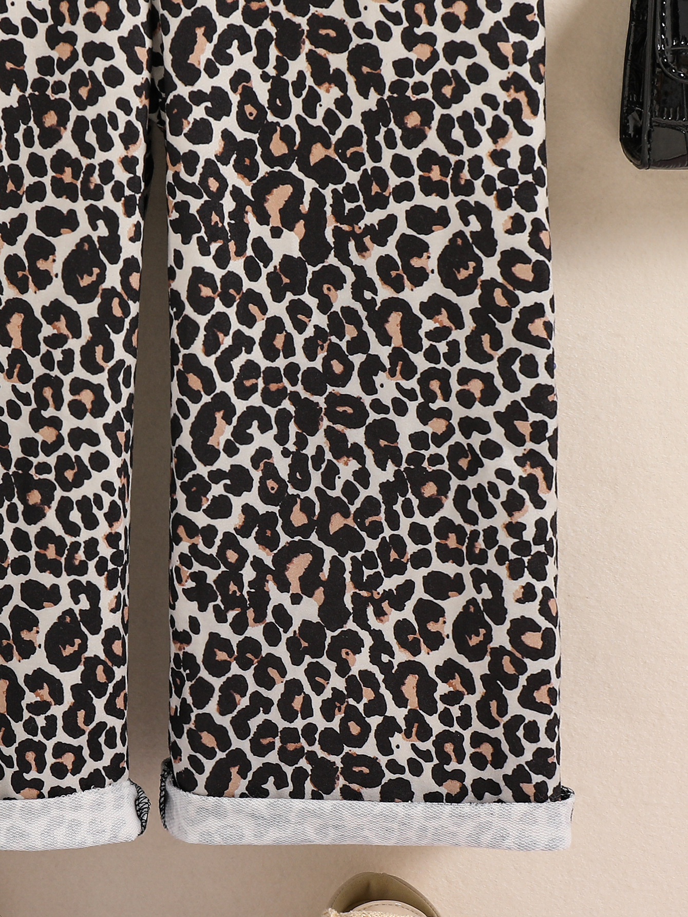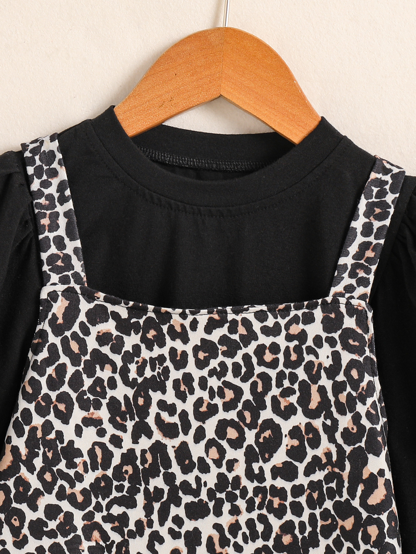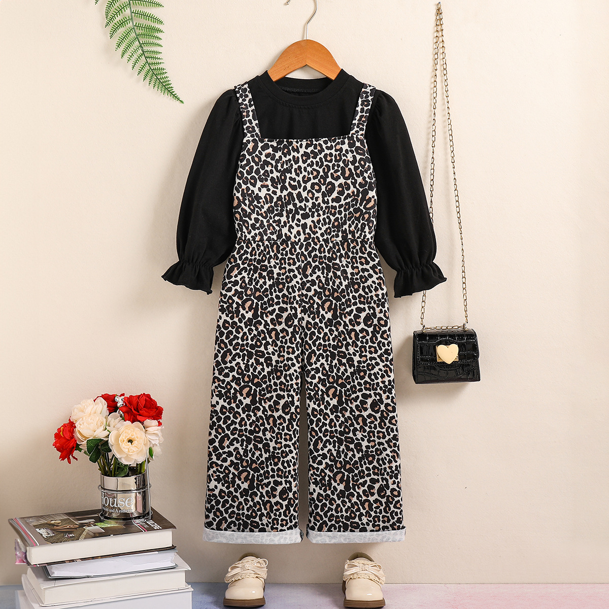 跨境女童秋季韩版豹纹吊带连体裤欧美风泡泡袖T恤两件套秋款套装