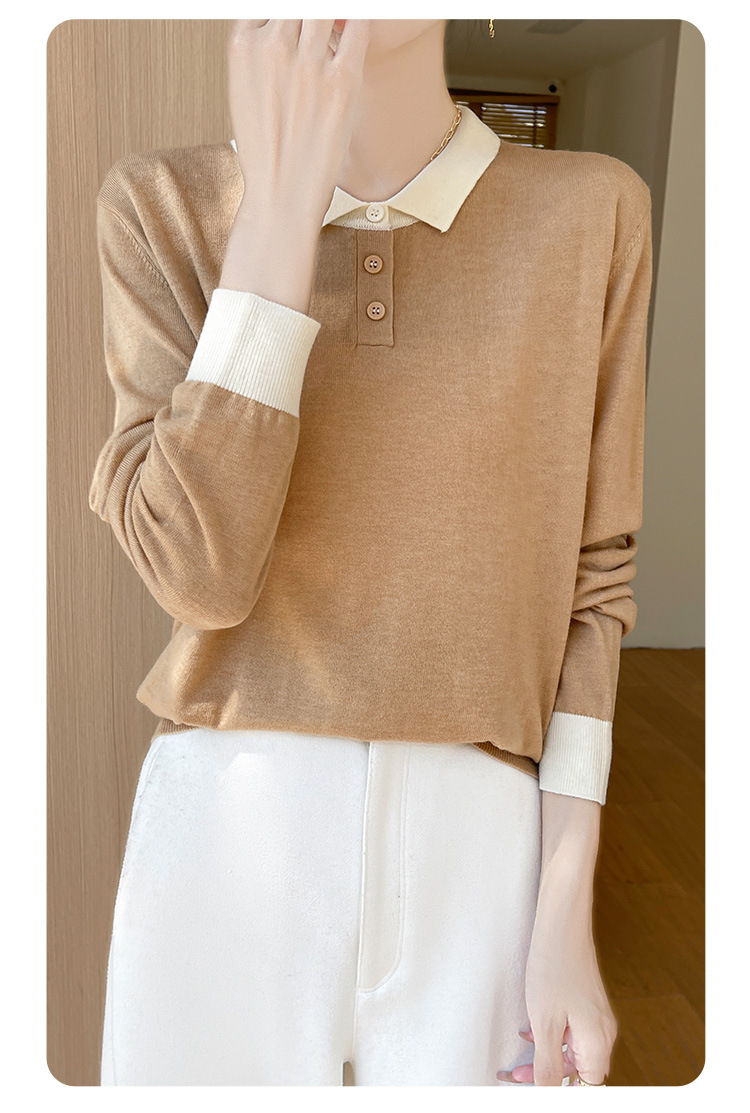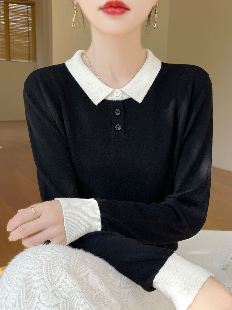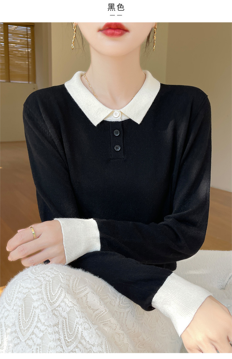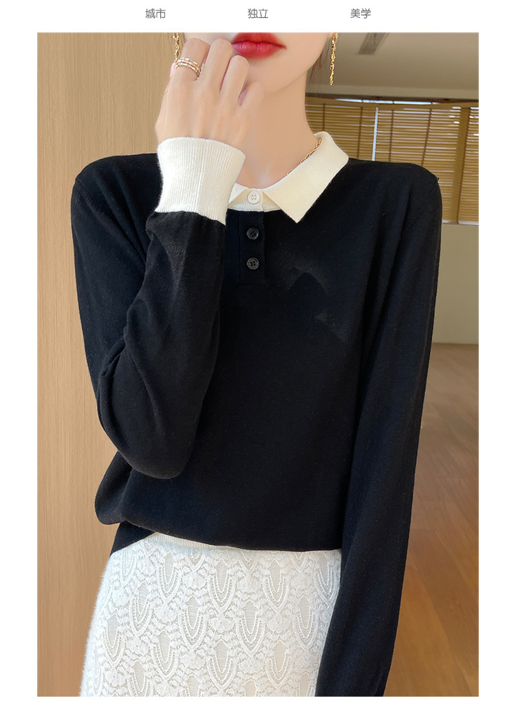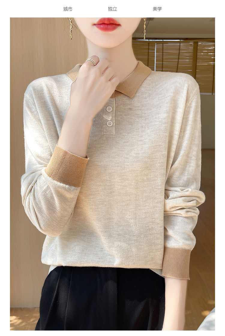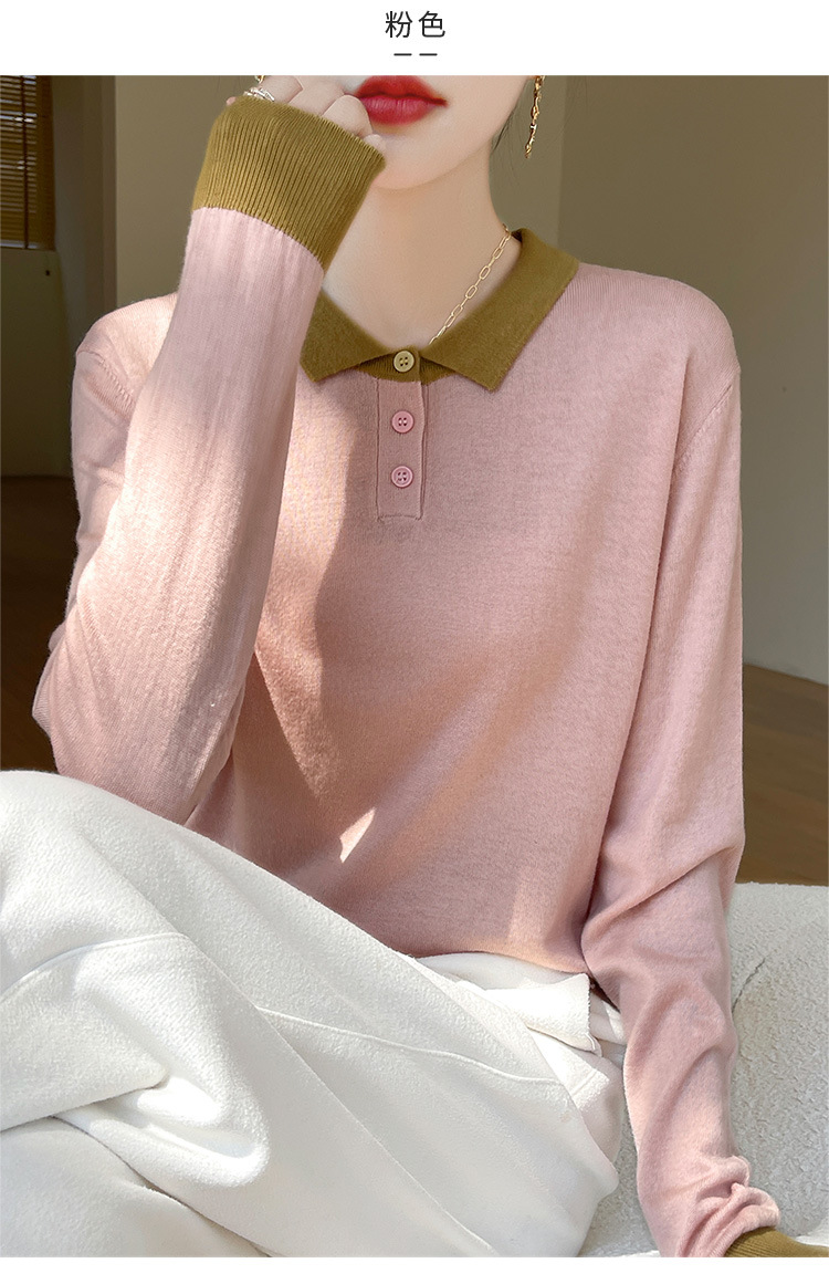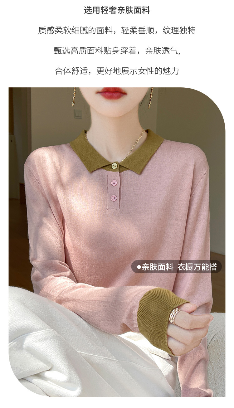 Colorblock POLO 칼라 니트 긴팔 티셔츠 여성용 서양식 연령 감소 콘트라스트 컬러 루즈베이스 탑 초가을 얇은 스웨터