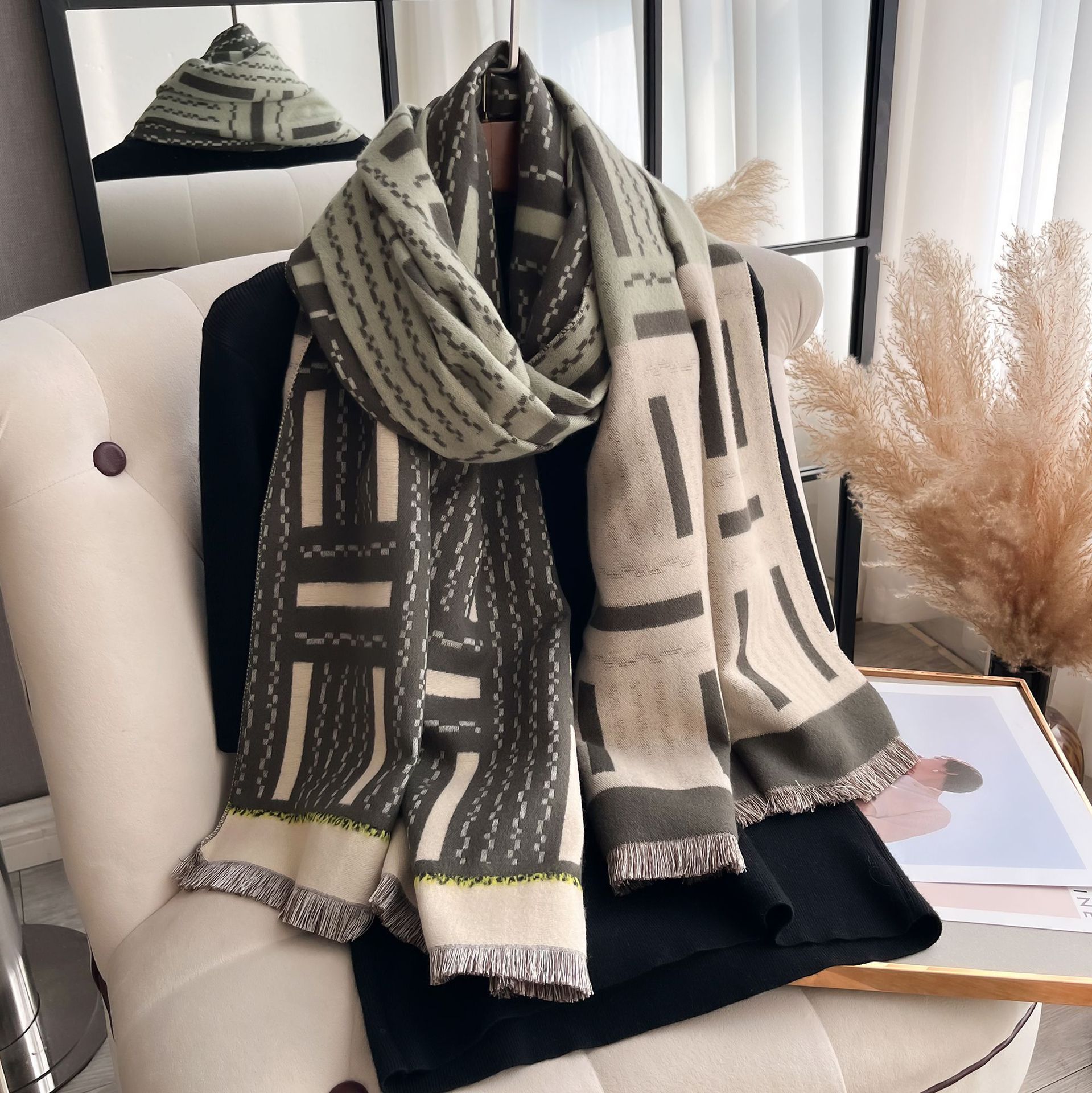 가을과 겨울 스카프 캐시미어 두꺼운 긴 따뜻한 에어컨 목도리 짧은 수염 술 장식 웨이브 자카드 스카프스토어 가기