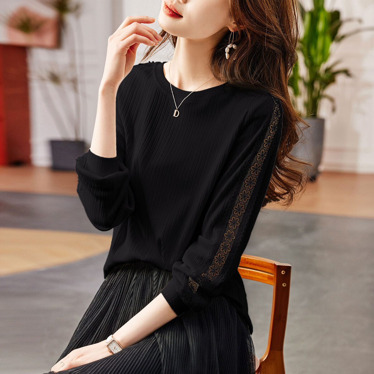 봄 일본과 한국의 새로운 라운드 넥 할로우 레이스 탑 여성의 세련된 서양식 슬리밍 우아한 니트 긴 소매 티셔츠스토어 가기