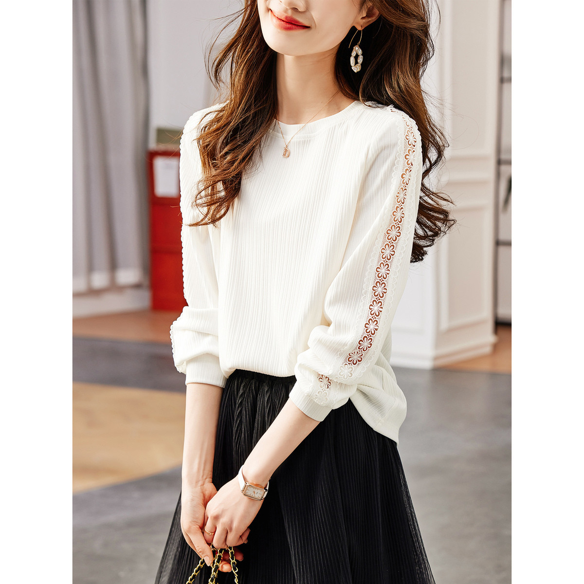봄 일본과 한국의 새로운 라운드 넥 할로우 레이스 탑 여성의 세련된 서양식 슬리밍 우아한 니트 긴 소매 티셔츠