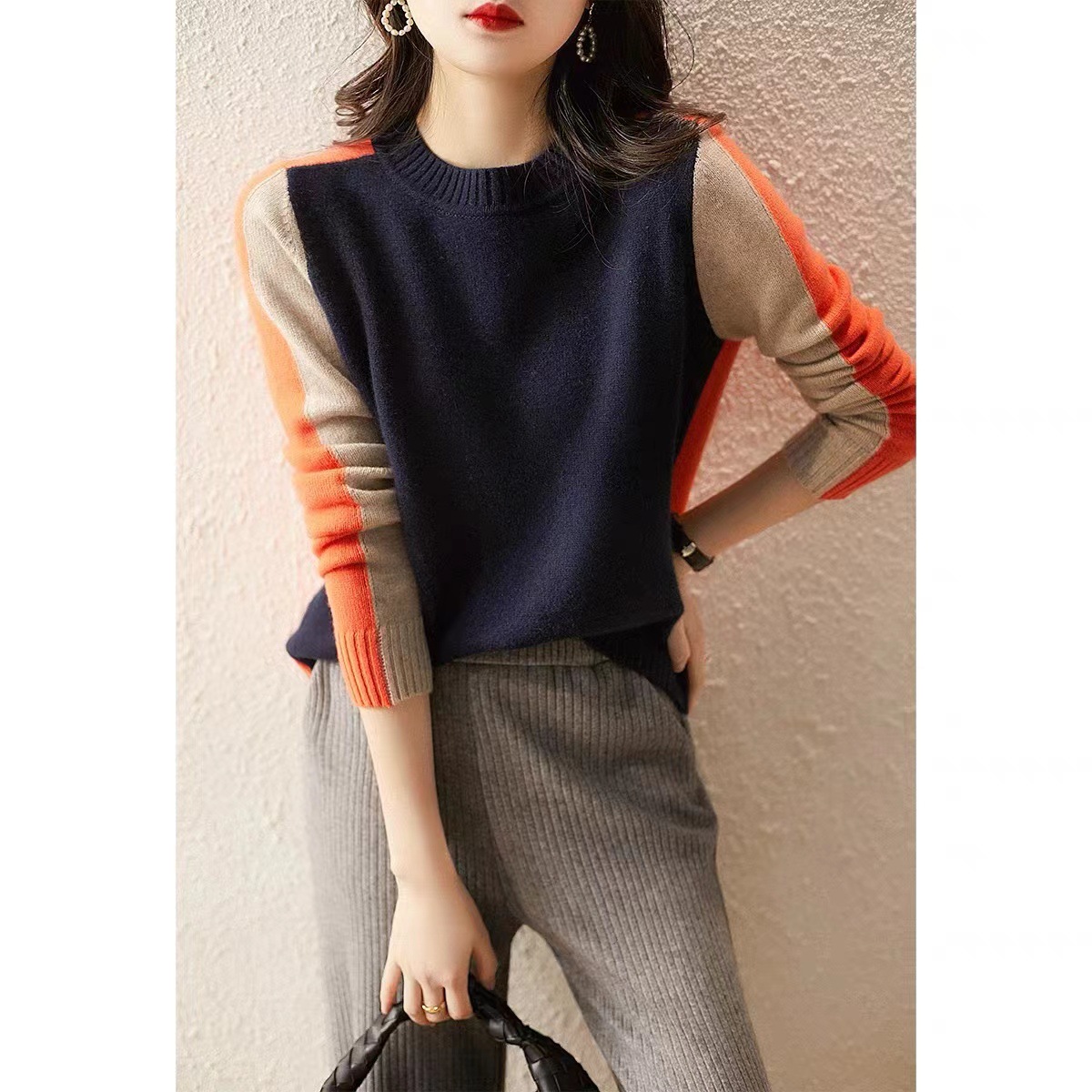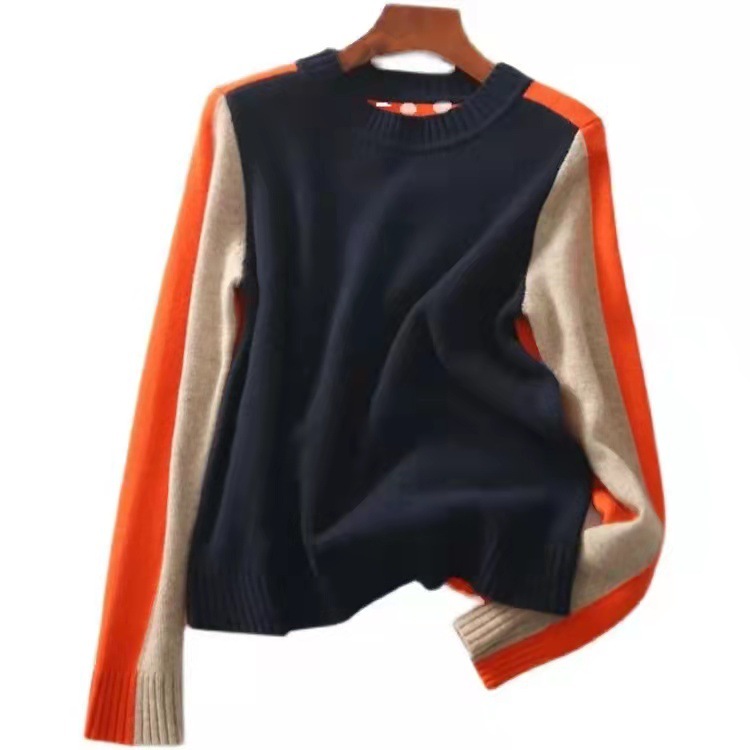 유럽 패션 라운드 넥 컬러 매칭 베이스 니트 스웨터 여성 가을 및 겨울 서양 스타일 나이 감소 느슨한 슬리밍 올 매치 스웨터
