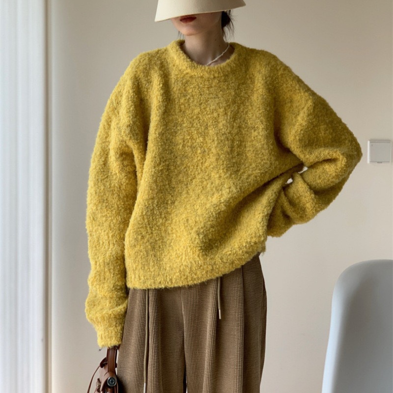 루프 원사 솔리드 컬러 라운드 넥 풀오버 스웨터 여성의 2025 가을 및 겨울 새로운 국경 한국 느슨한 게으른 스타일 니트 스웨터
