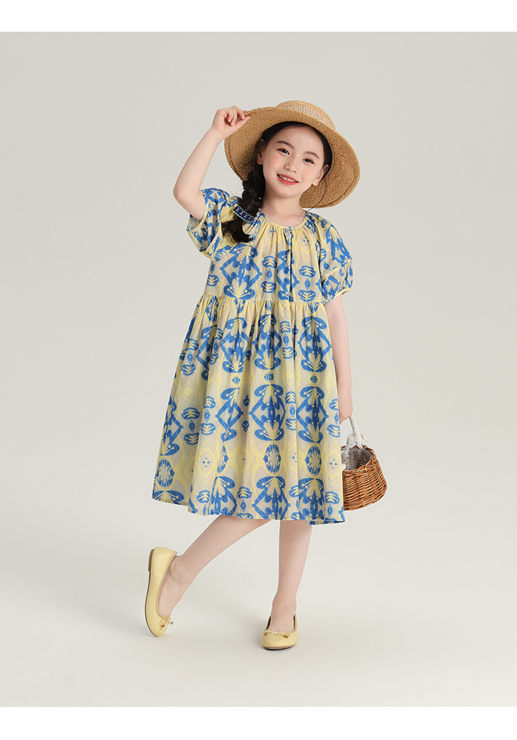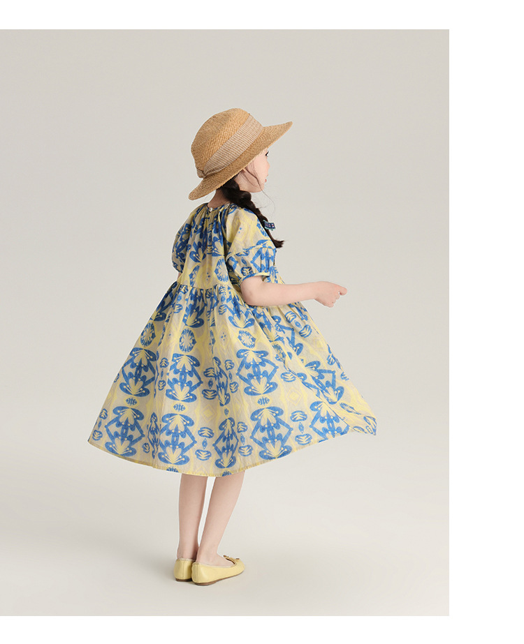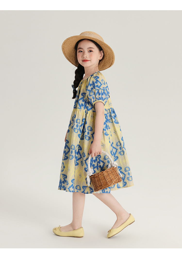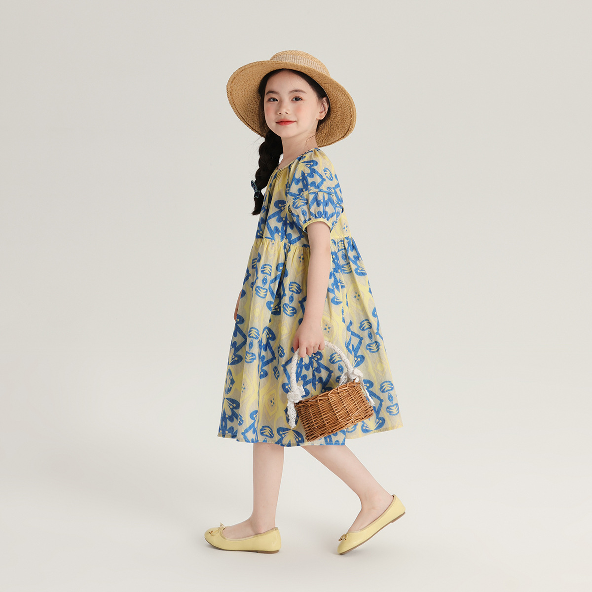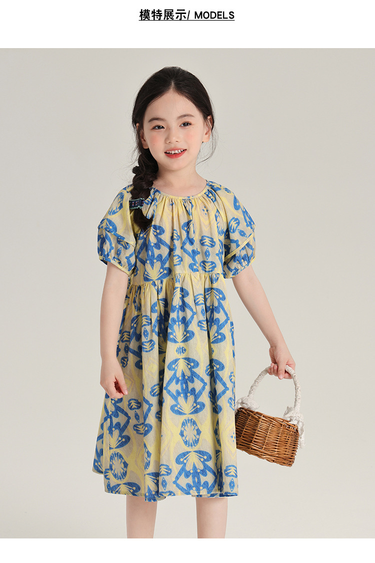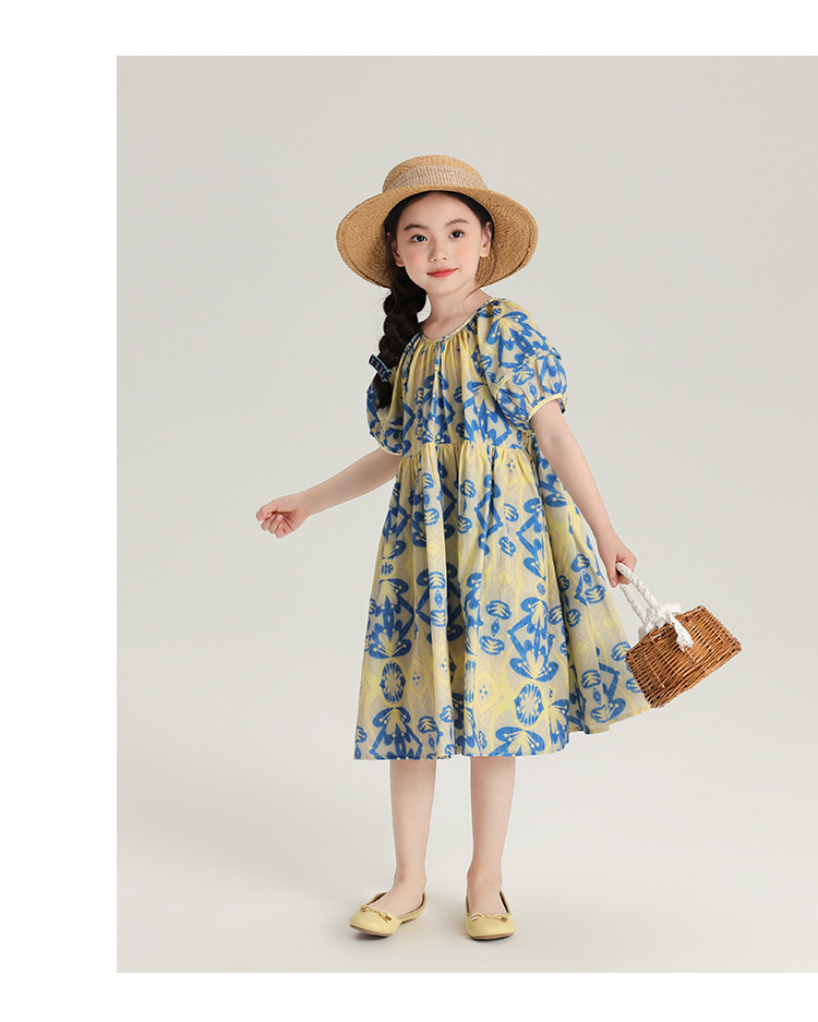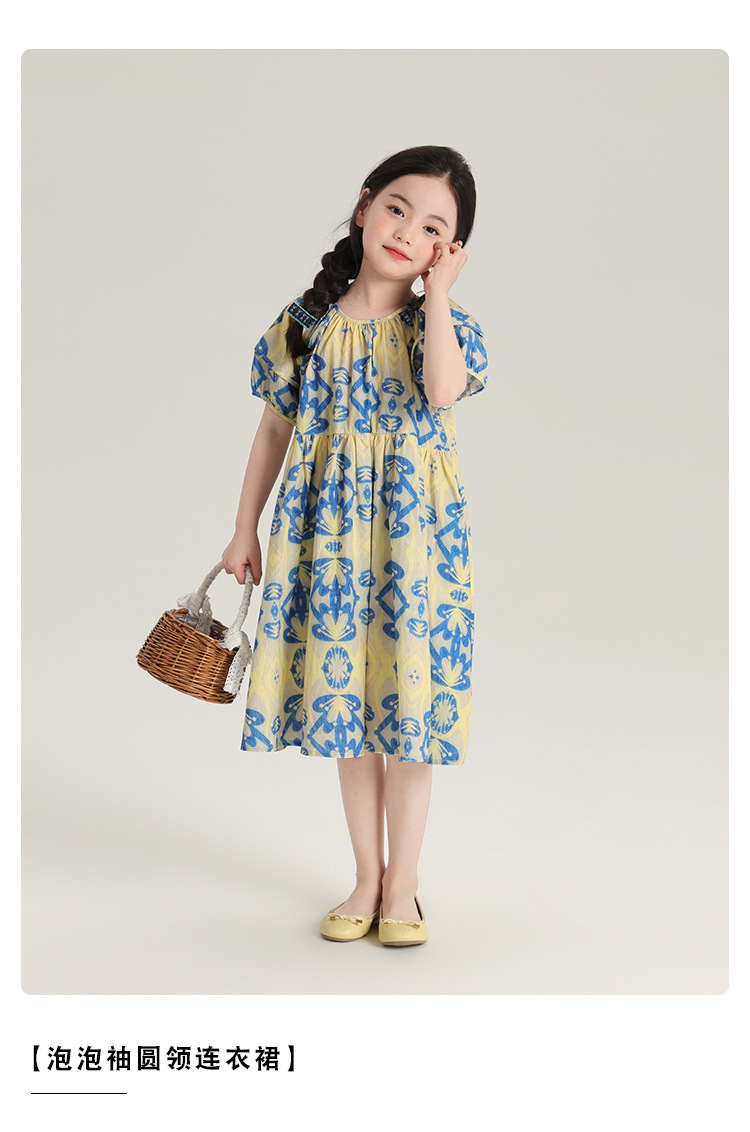 소녀의 원피스 서양식 치마 여름 순수한 면 어린이 퍼프 슬리브 소녀의 추상 공주 스커트 긴 치마스토어 가기