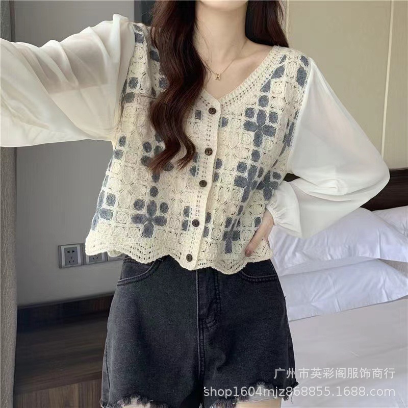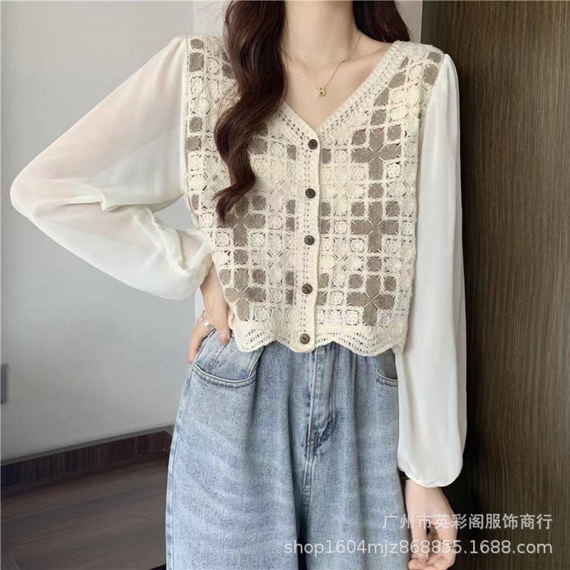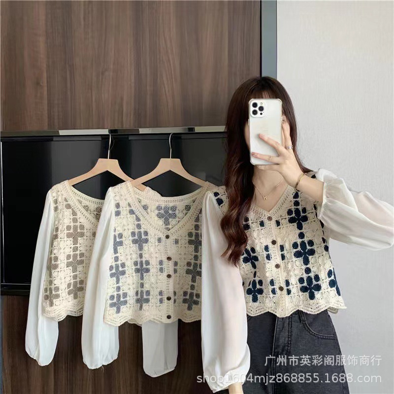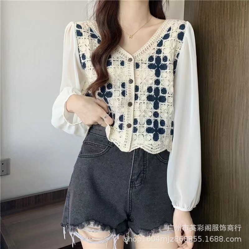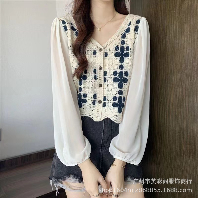 한국 스타일 최고 고급 루즈 스티칭 얇은 패셔블 니쉬 쉬폰 스티칭 프랑스 셔츠 여성용 캐주얼 니트 셔츠