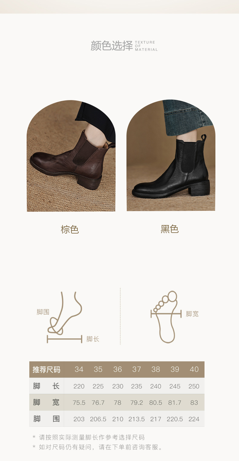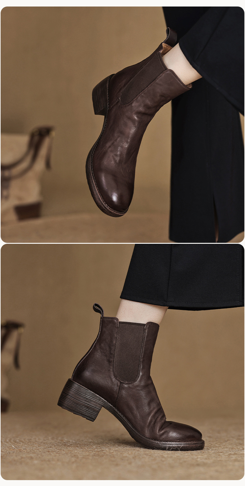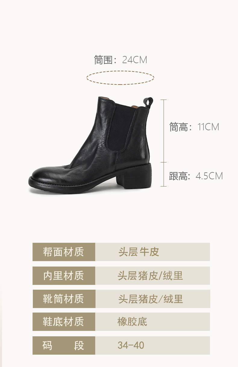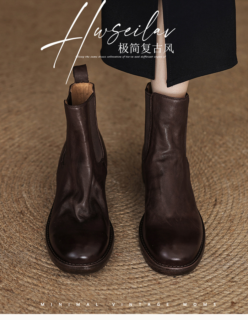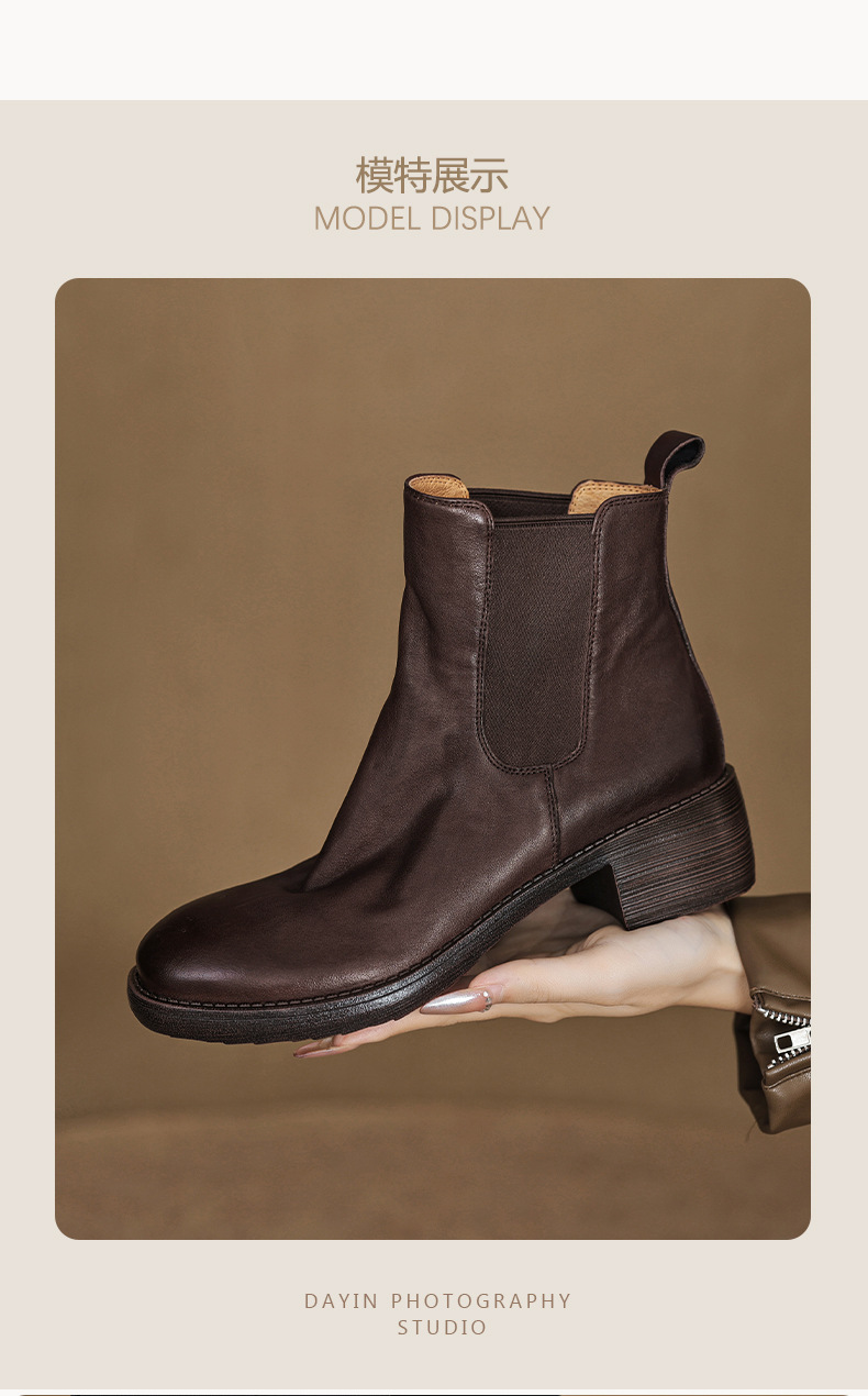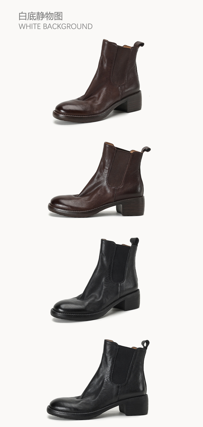 정품 가죽 쇼트 부츠 여자 2024 가을과 겨울 미드 힐 두꺼운 힐 라운드 헤드 워시 드 카우하이드 첼시 풀 가죽스토어 가기