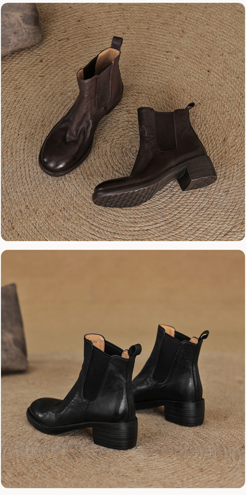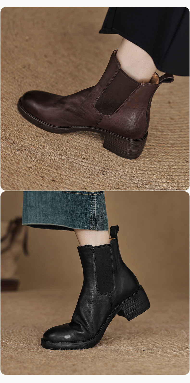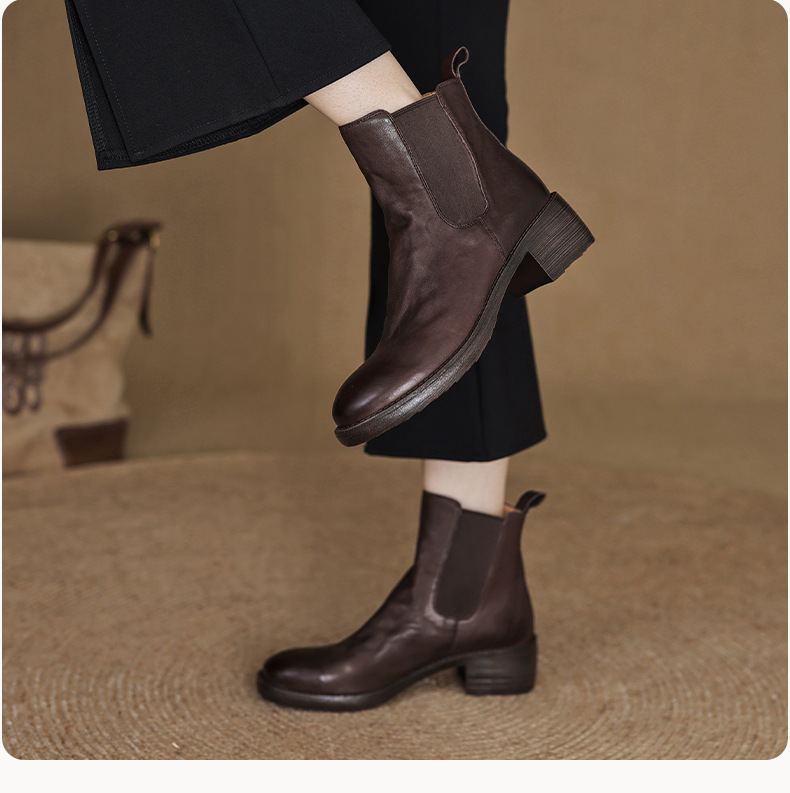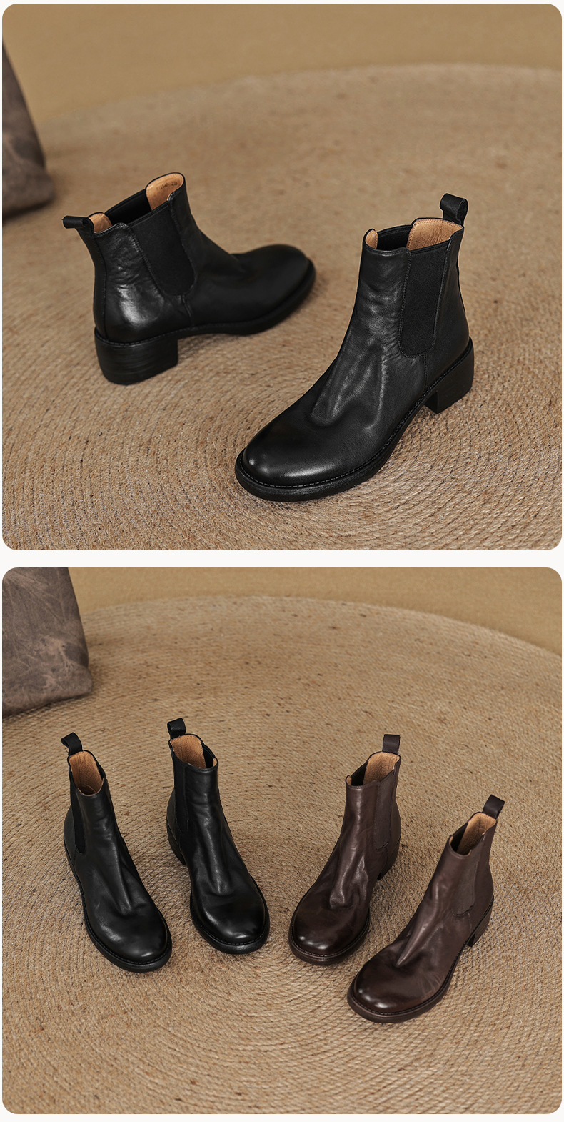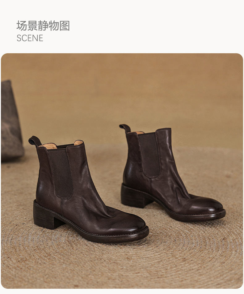 정품 가죽 쇼트 부츠 여자 2024 가을과 겨울 미드 힐 두꺼운 힐 라운드 헤드 워시 드 카우하이드 첼시 풀 가죽스토어 가기
