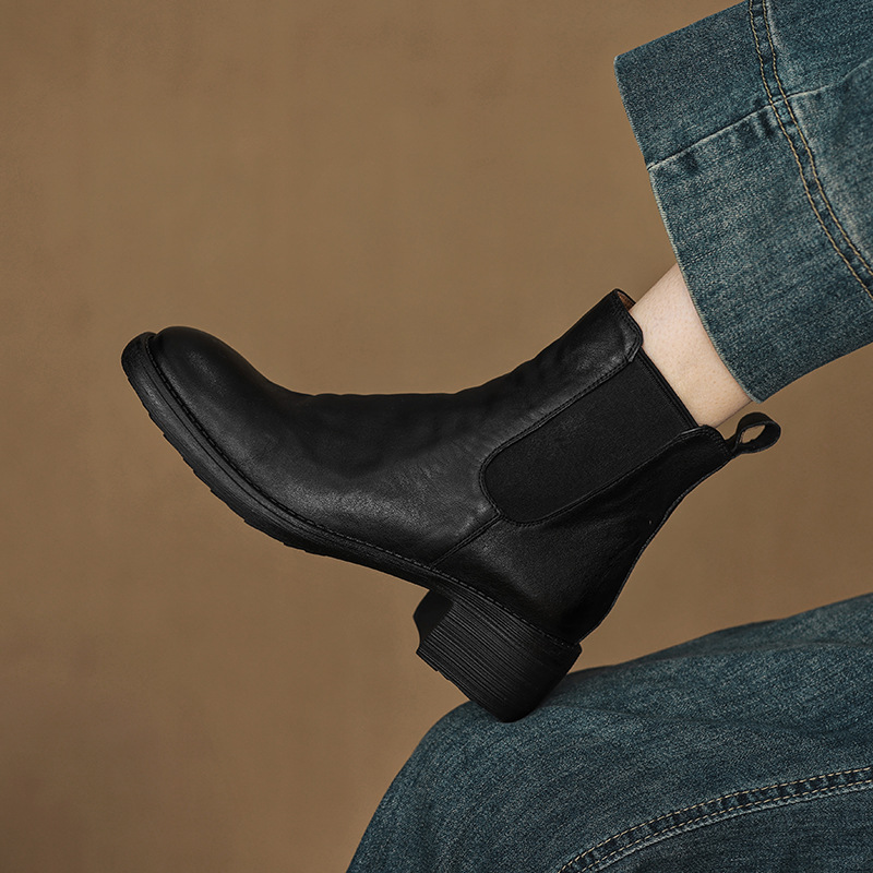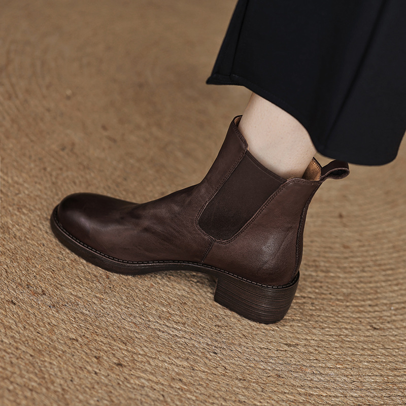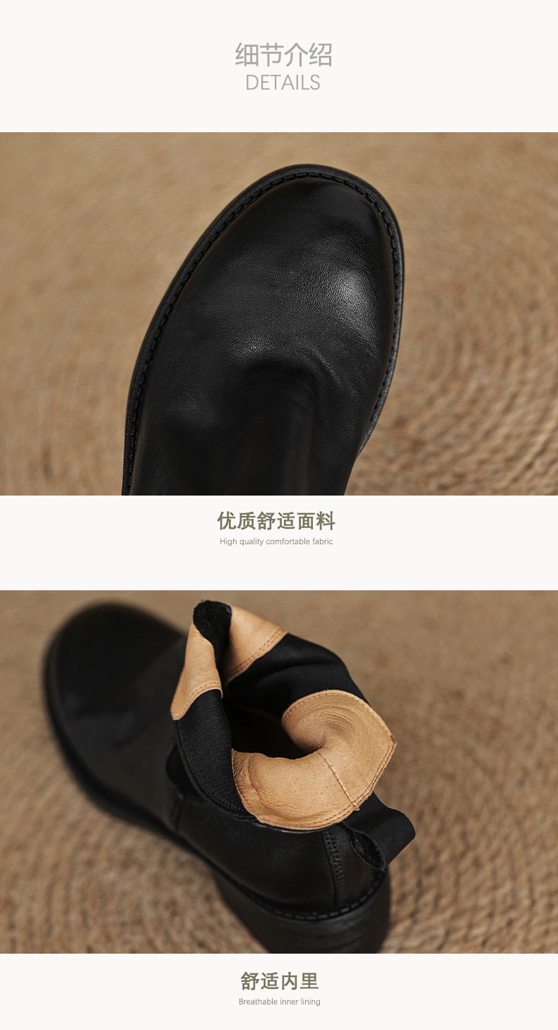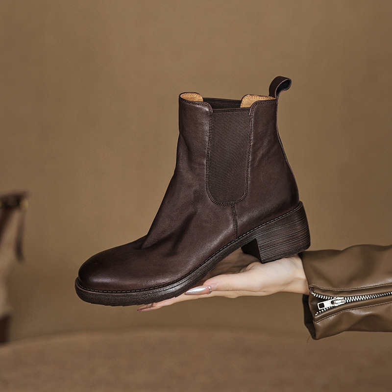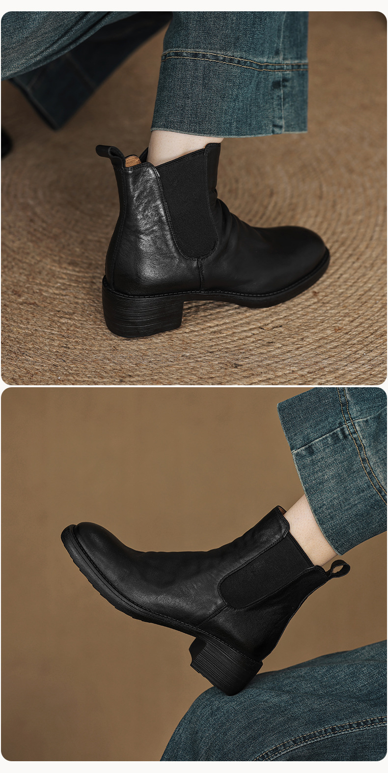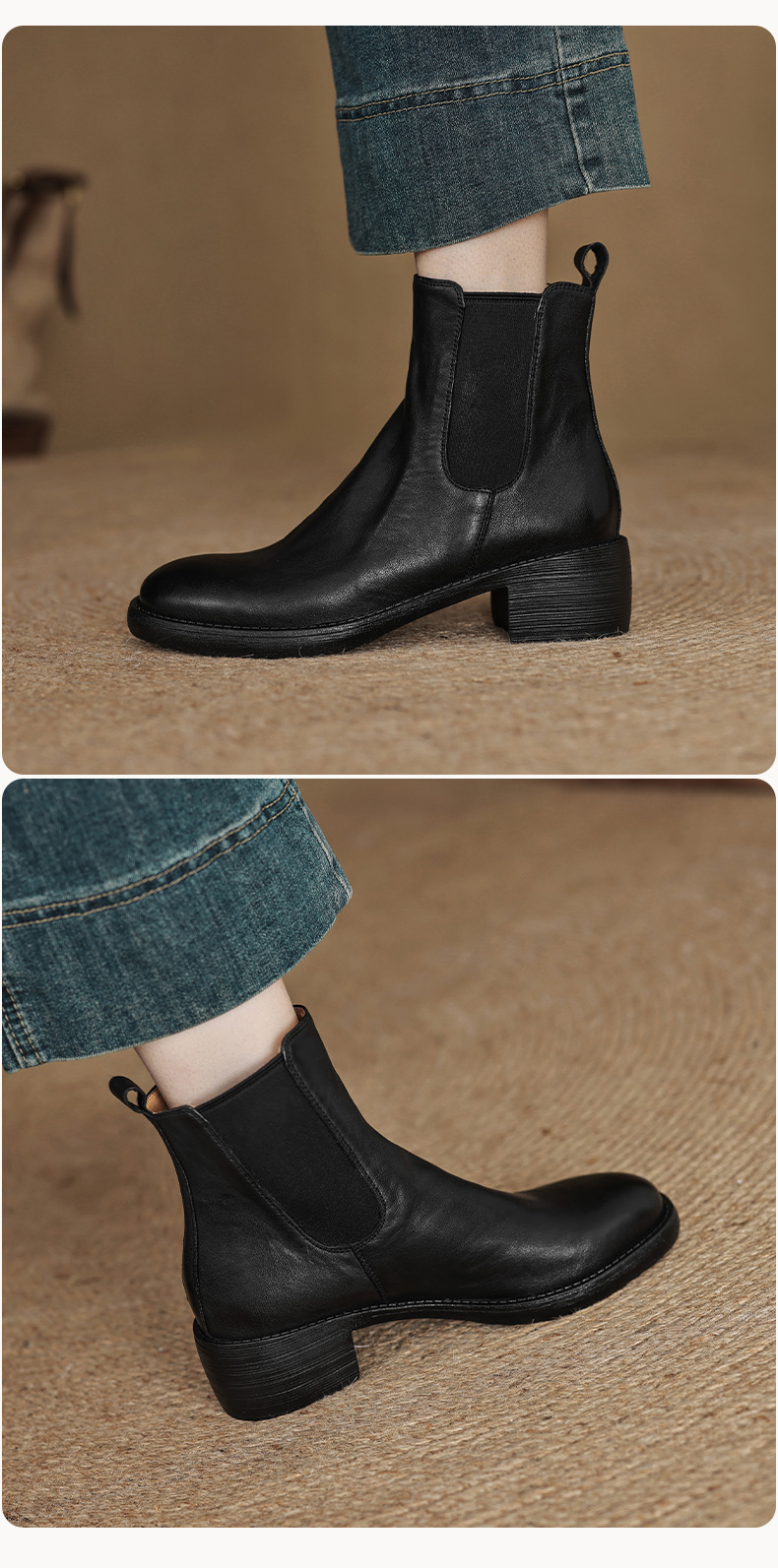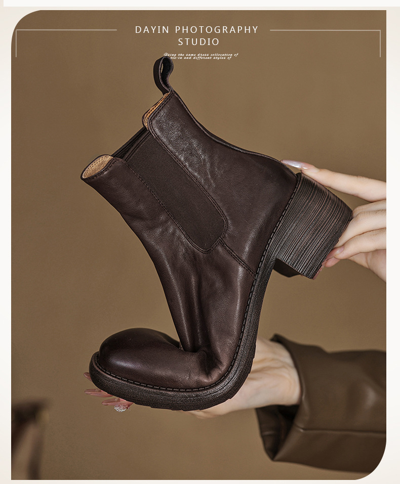 정품 가죽 쇼트 부츠 여자 2024 가을과 겨울 미드 힐 두꺼운 힐 라운드 헤드 워시 드 카우하이드 첼시 풀 가죽스토어 가기