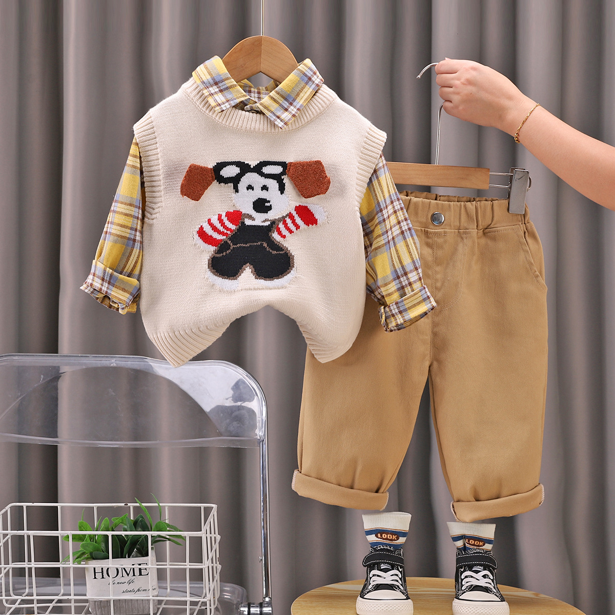 가을 2024 새로운 소년 만화 스웨터 조끼 셔츠 긴 소매 3 조각 세트 남성 아기 캐주얼 바지 세트