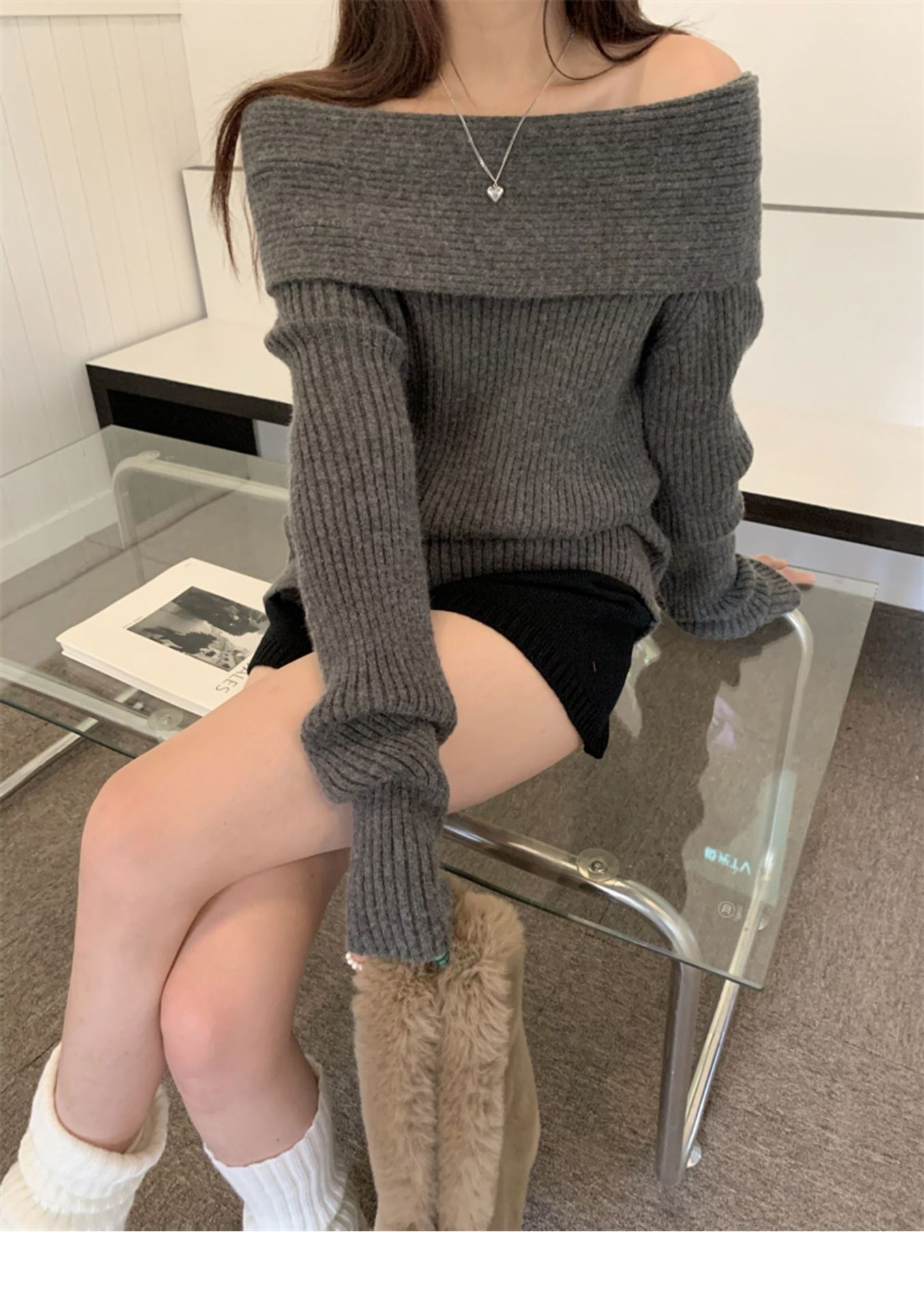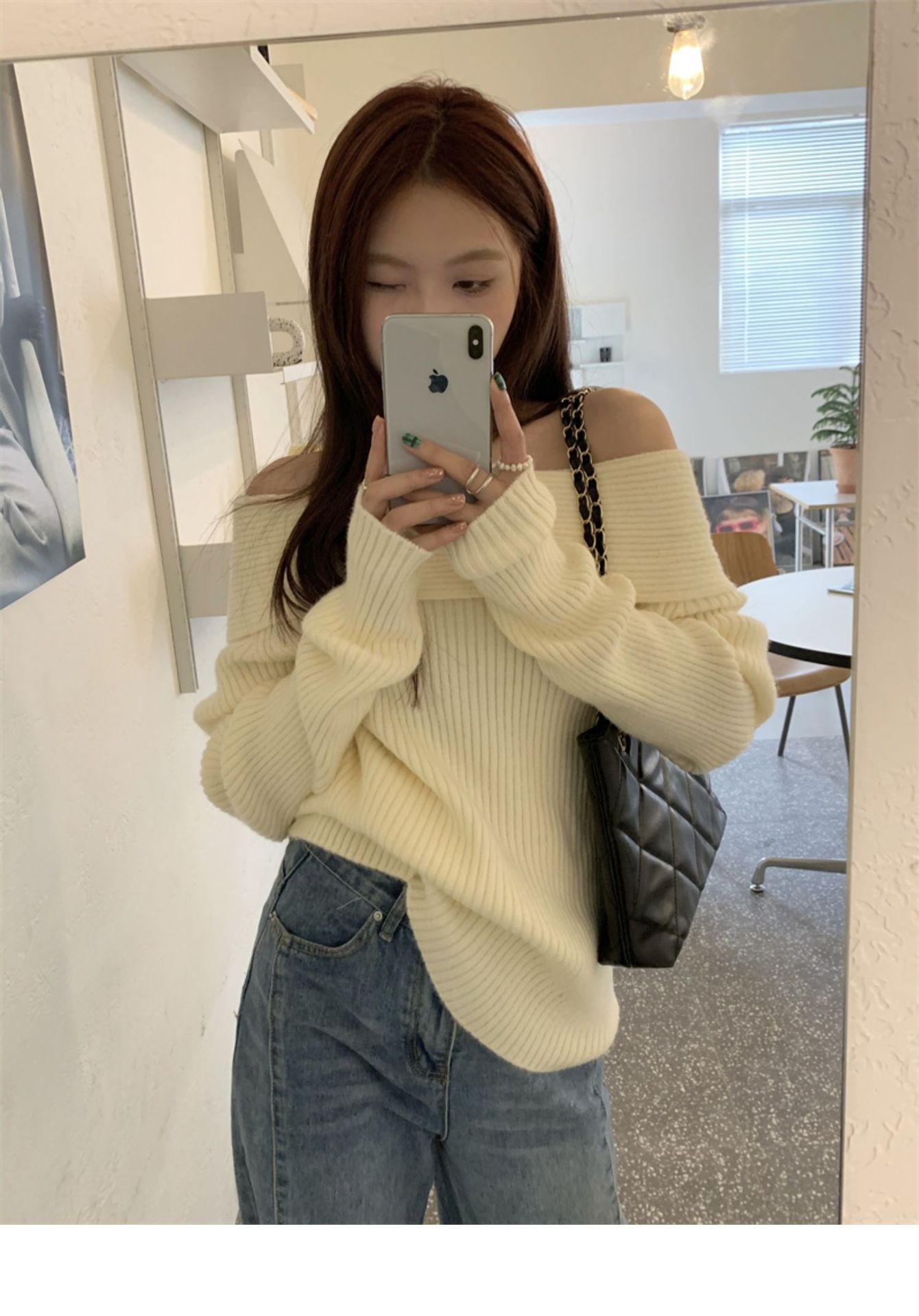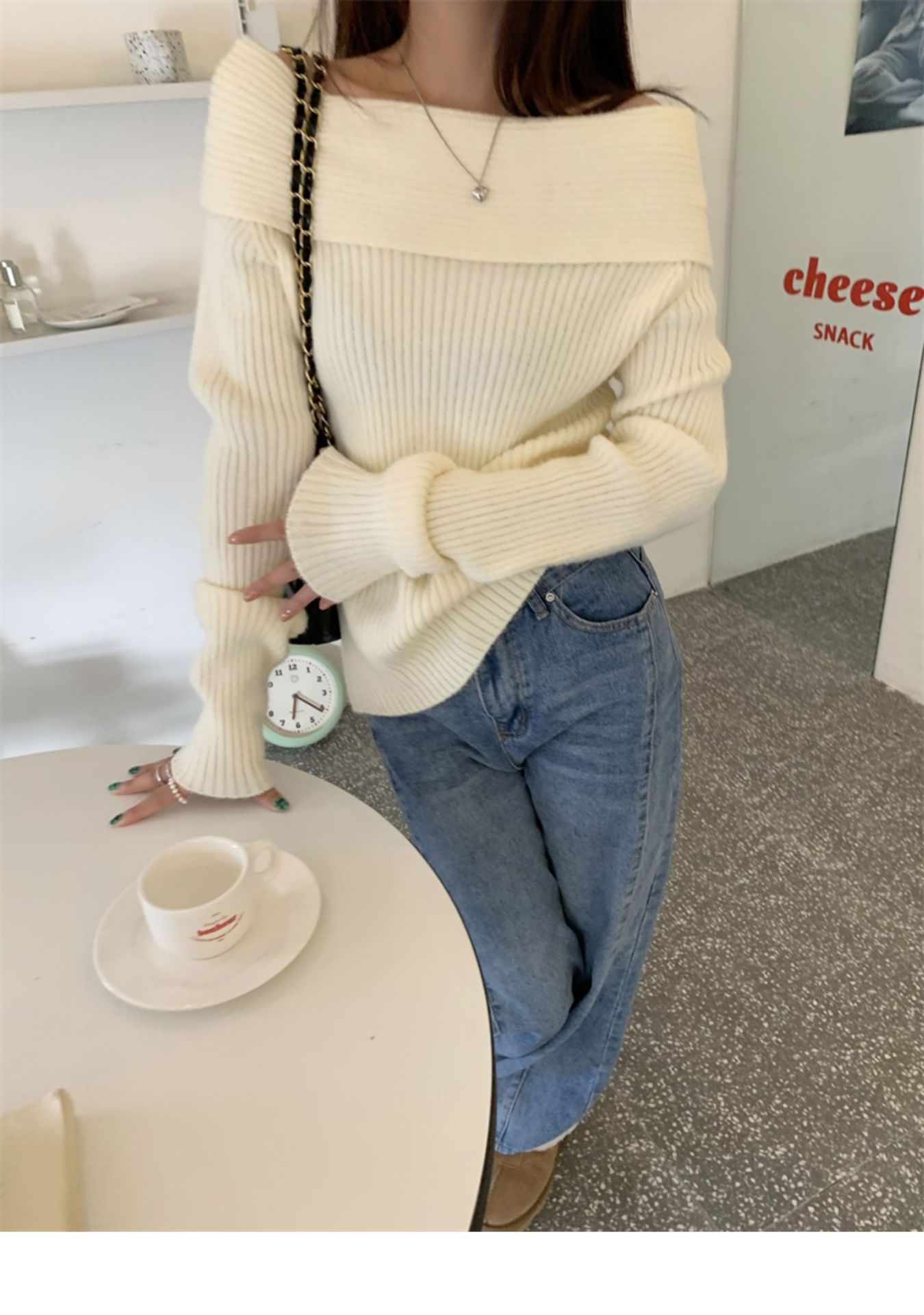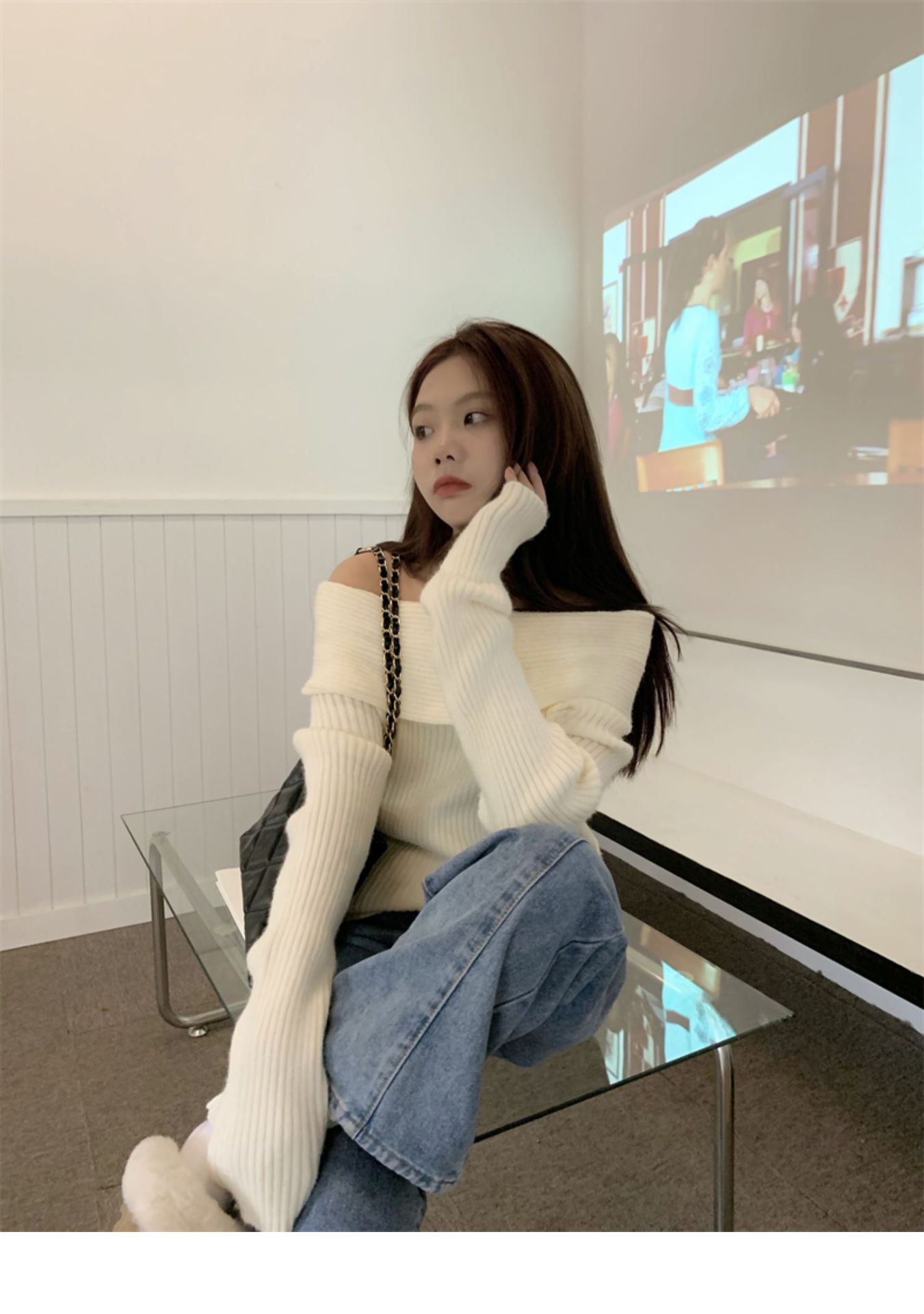 여성 기질 쇄골 어깨 노출 니트웨어 슬리밍 아우터웨어를 곁들인 섹시한 화이트 오프 칼라 스웨터베이스 셔츠스토어 가기