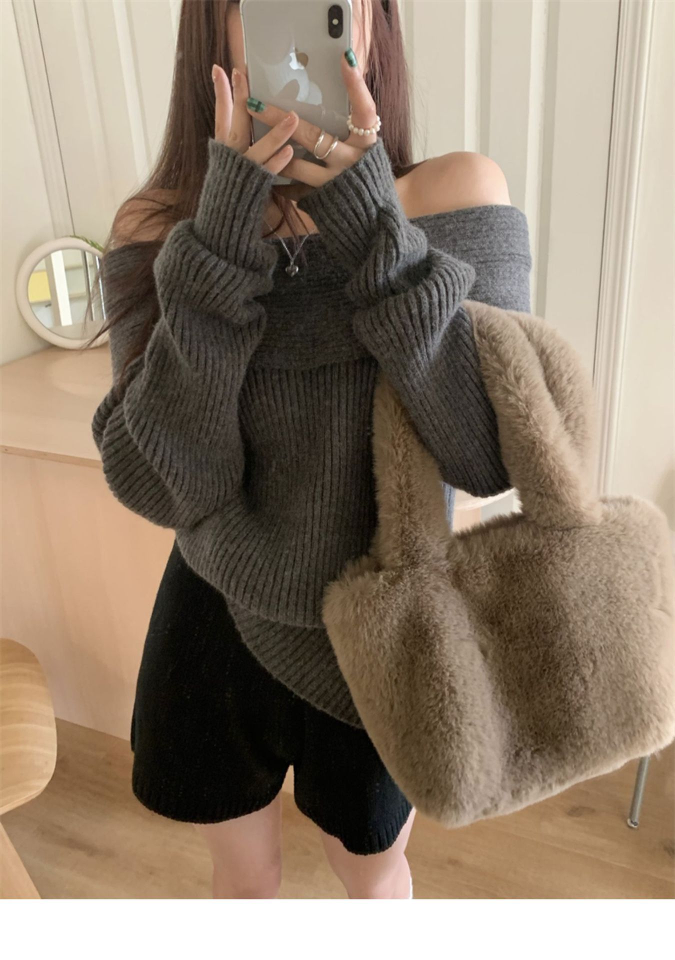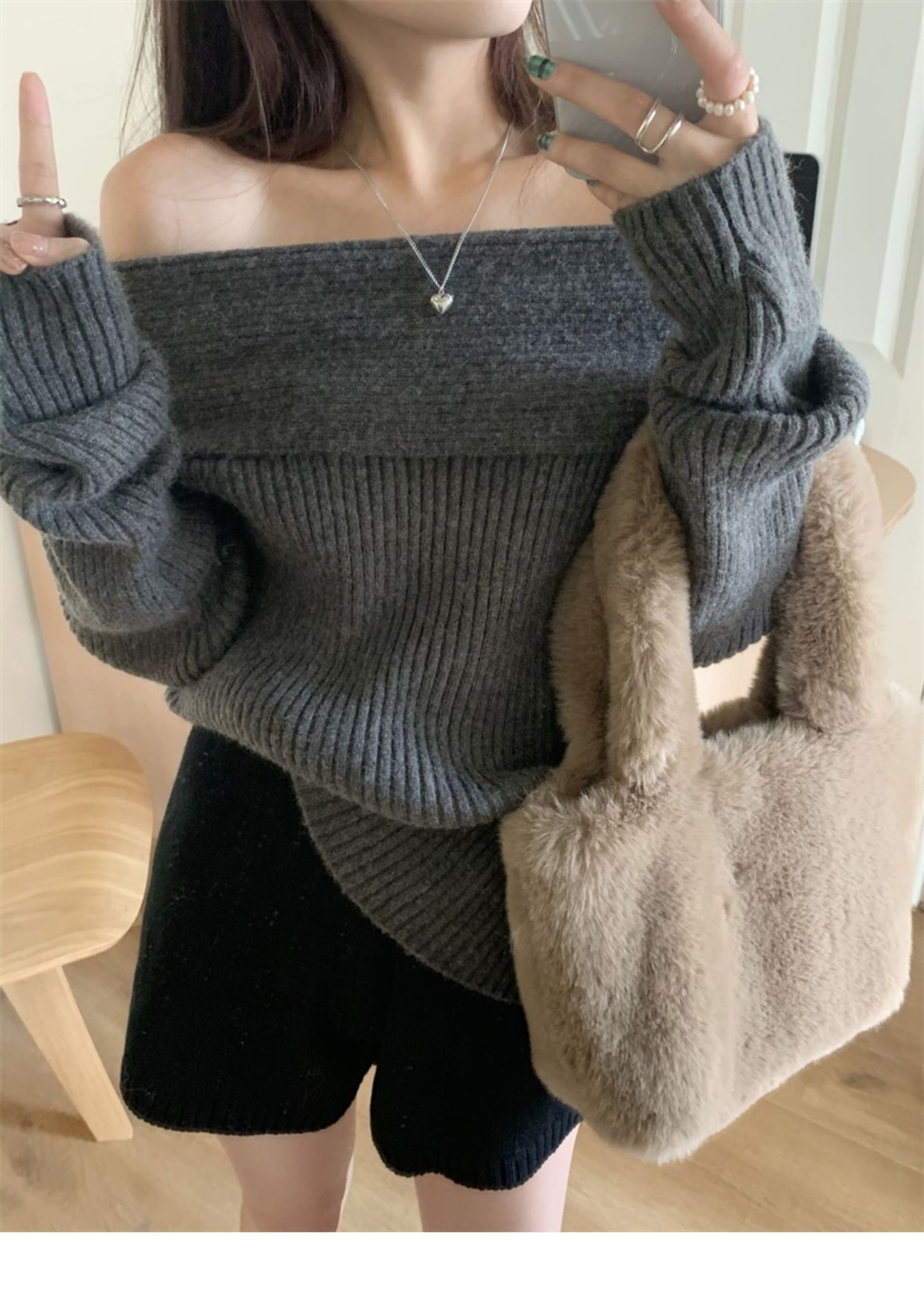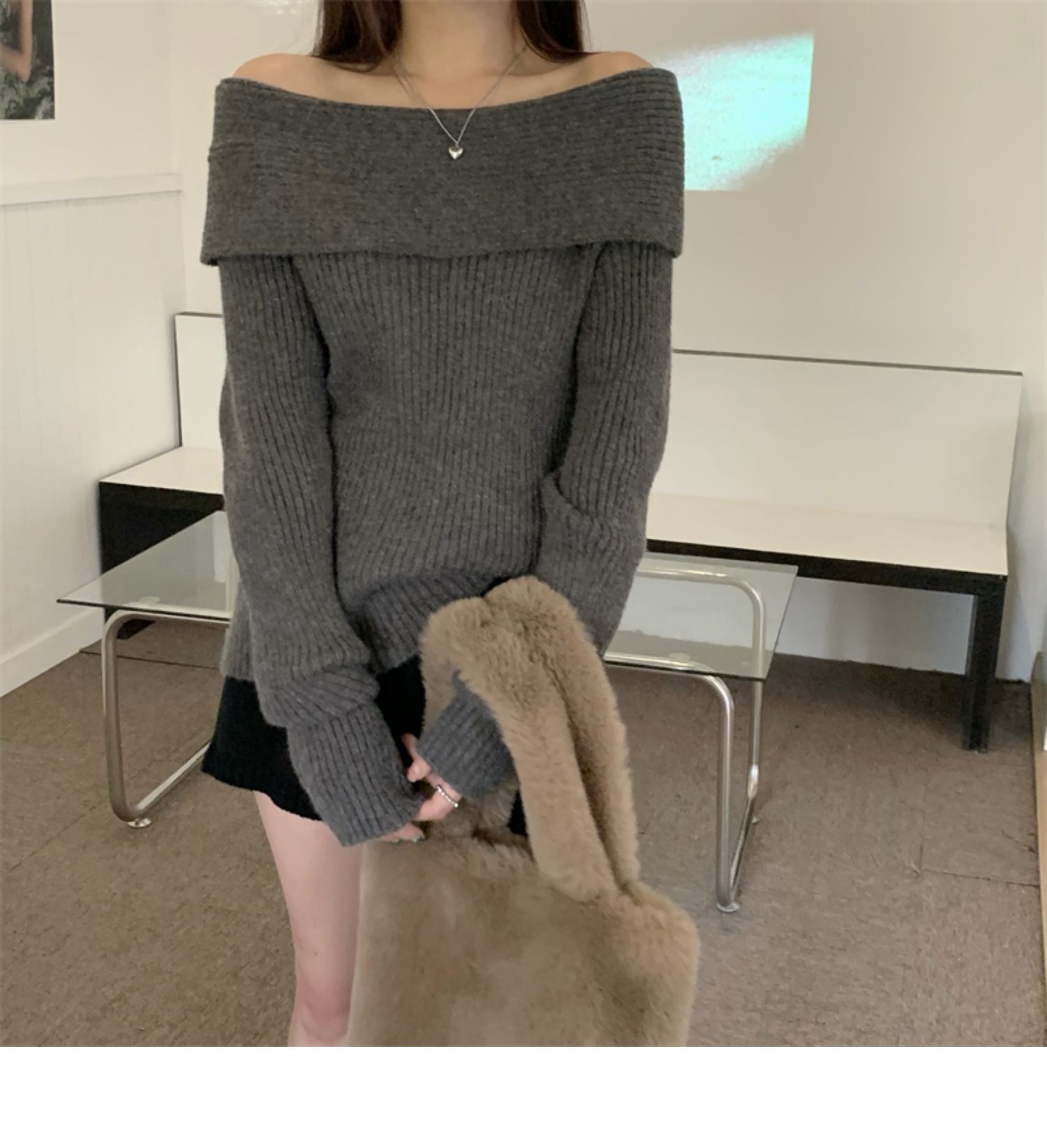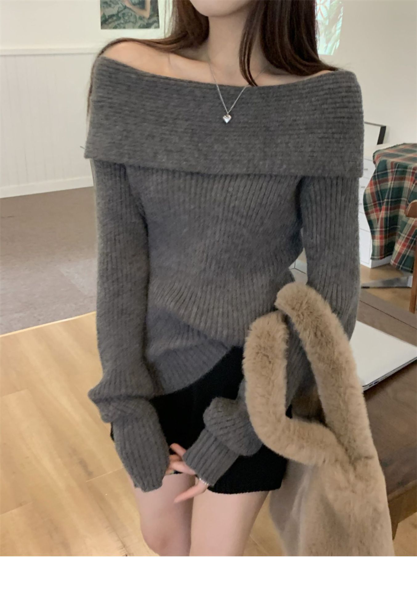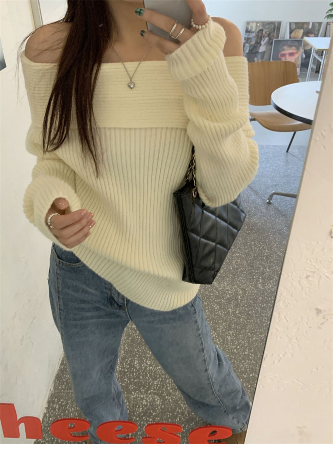 여성 기질 쇄골 어깨 노출 니트웨어 슬리밍 아우터웨어를 곁들인 섹시한 화이트 오프 칼라 스웨터베이스 셔츠스토어 가기