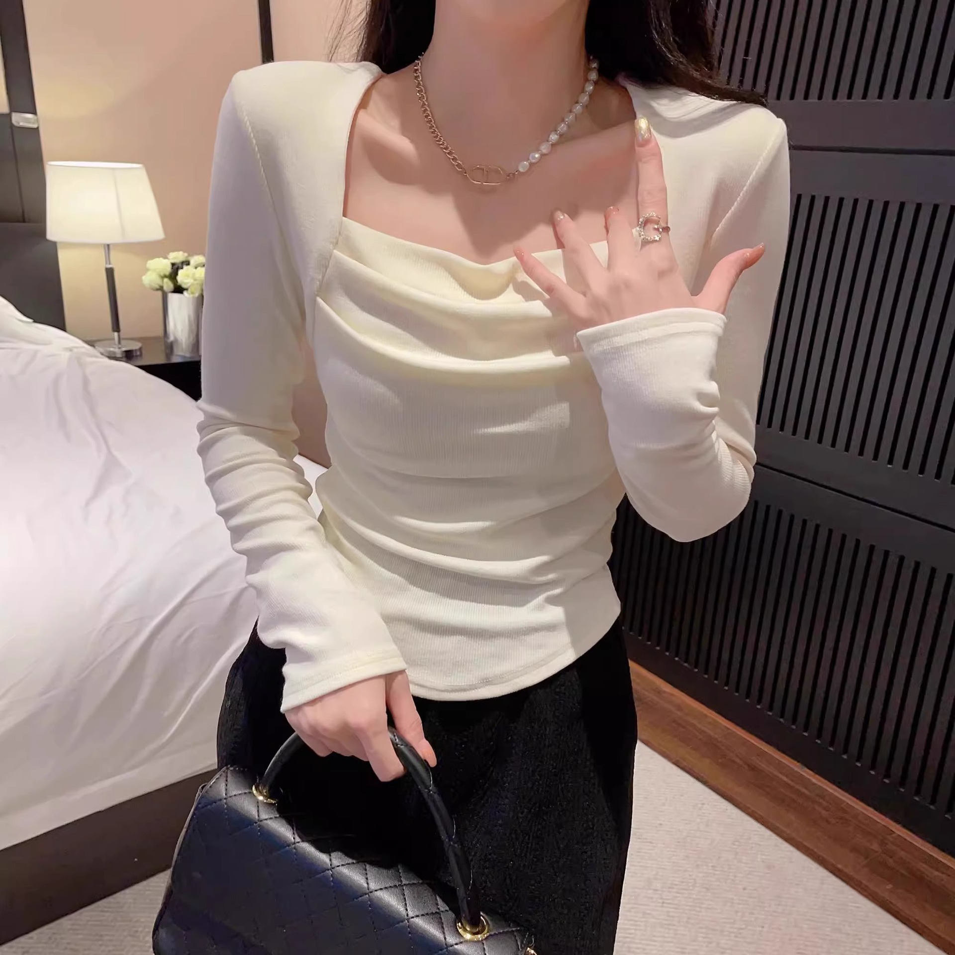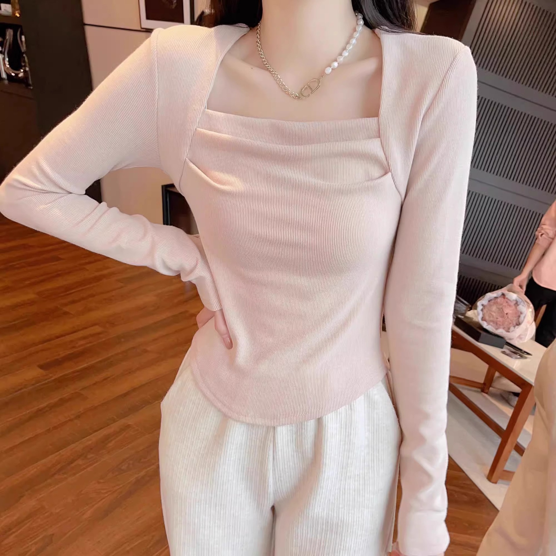 초가을 2024 새로운 핑크 스퀘어 칼라 베이스 셔츠 여성의 가을과 겨울 순수한 소원 인테리어 디자인 독특한 세련된 작은 탑